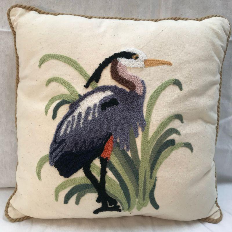 Blue Heron decorative throw pillow. Textured needlepoint design. Good condition.
