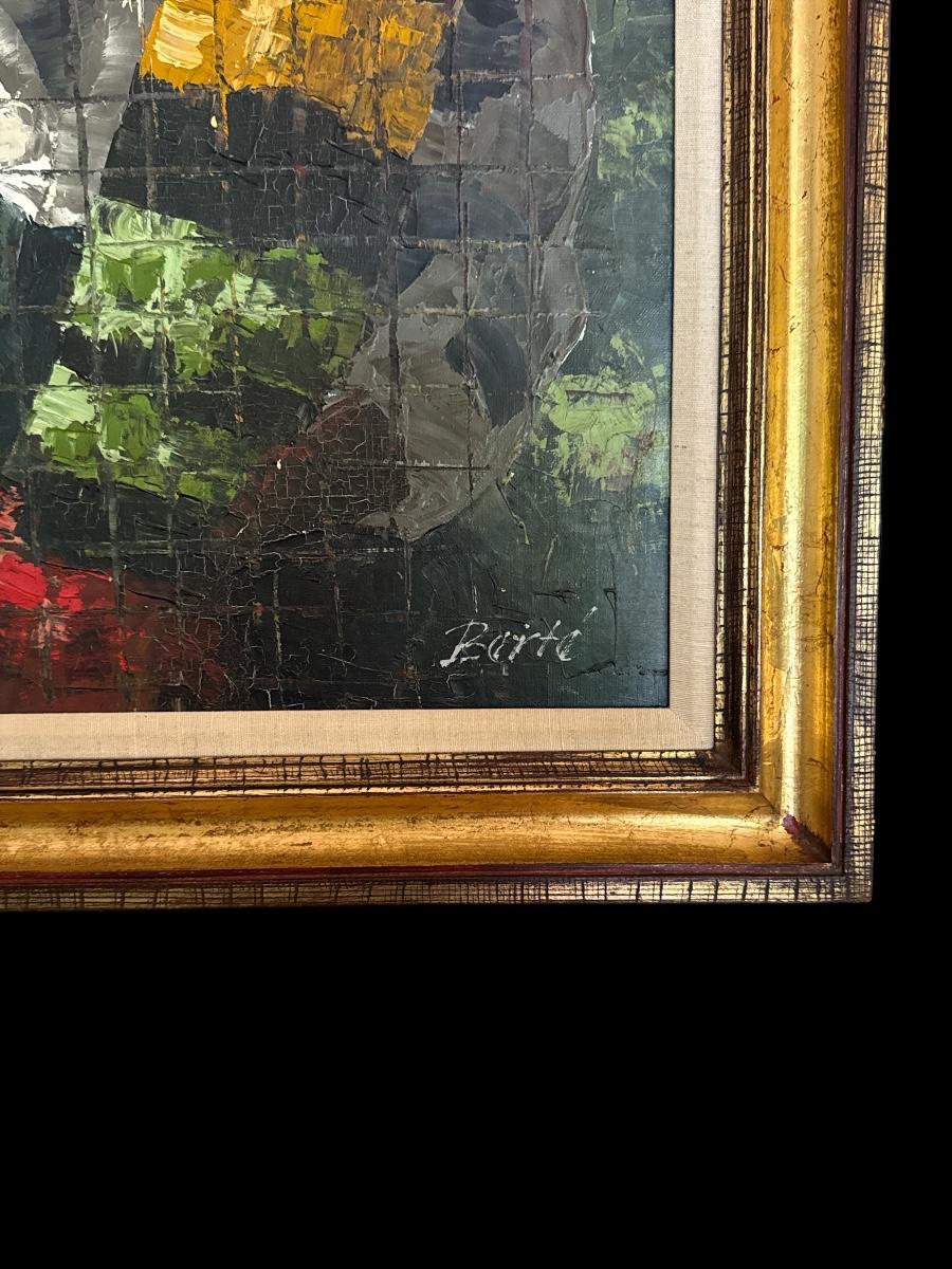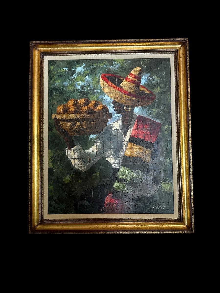 Framed oil painting signed “Barté,” depicting a vendor in traditional Mexican attire holding a basket of bread. Rich, textured brushwork and vivid earth tones. Framed in an ornate gold frame.