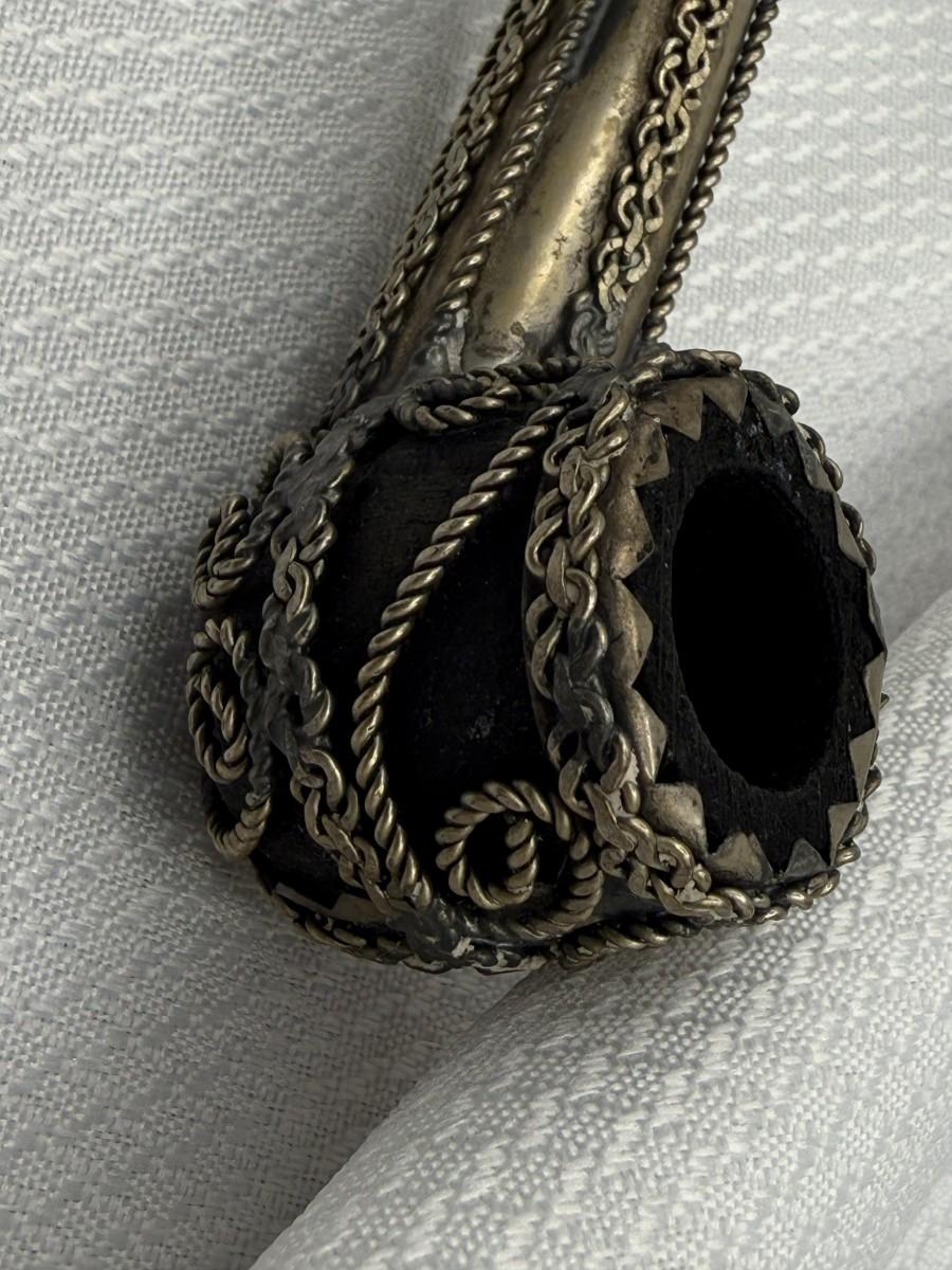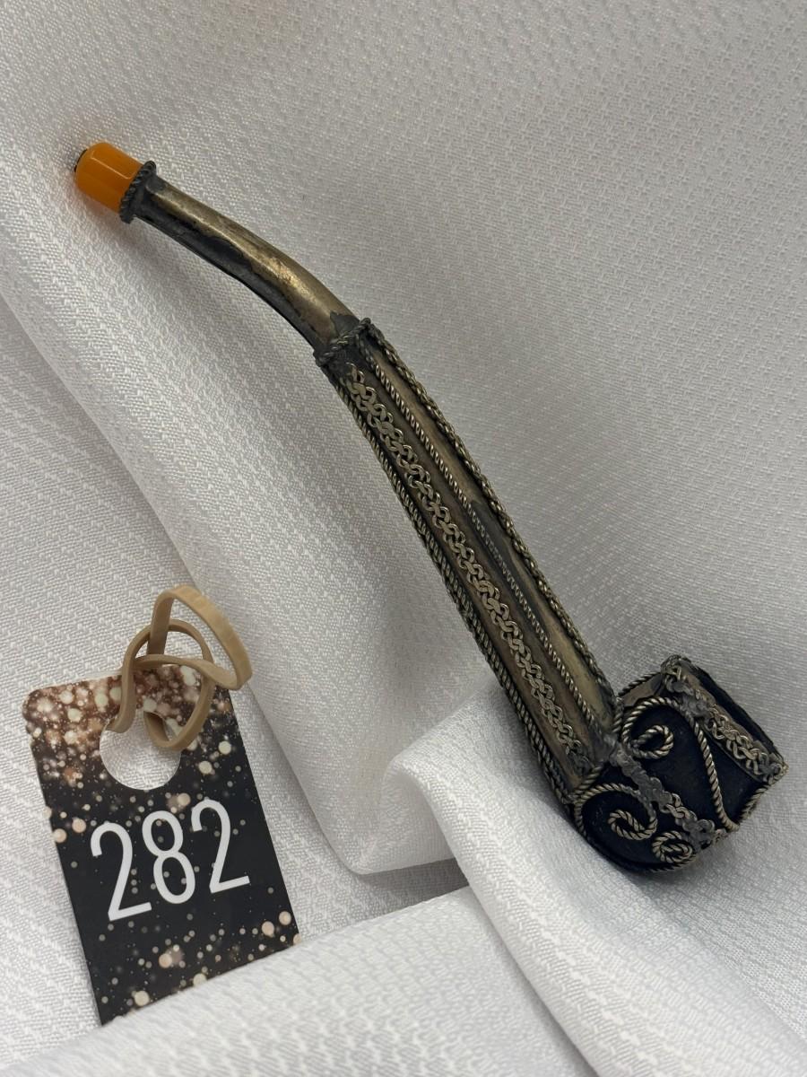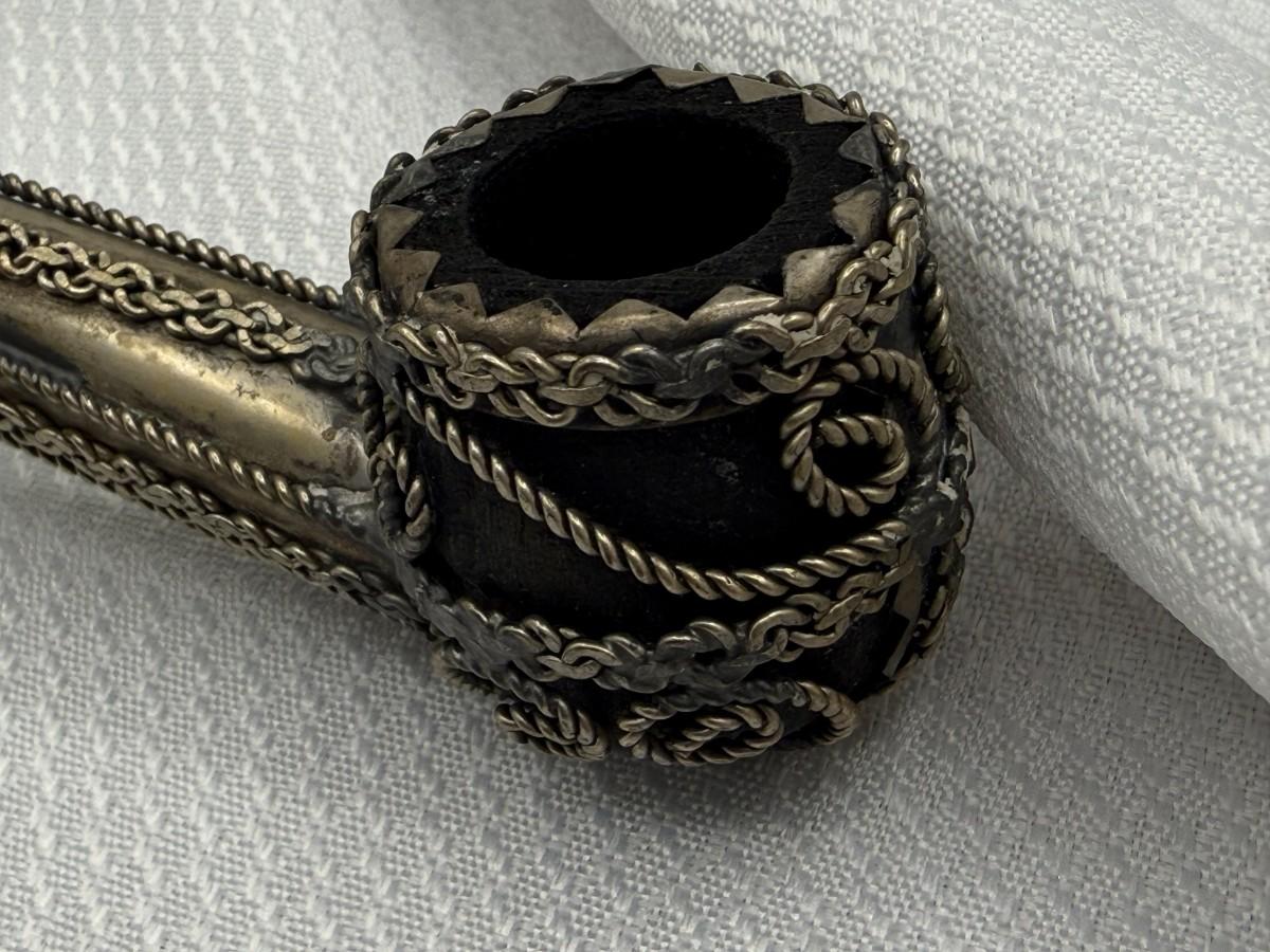 Decorative silver pipe with elaborate metalwork, collectable tobacco smoking pipe.