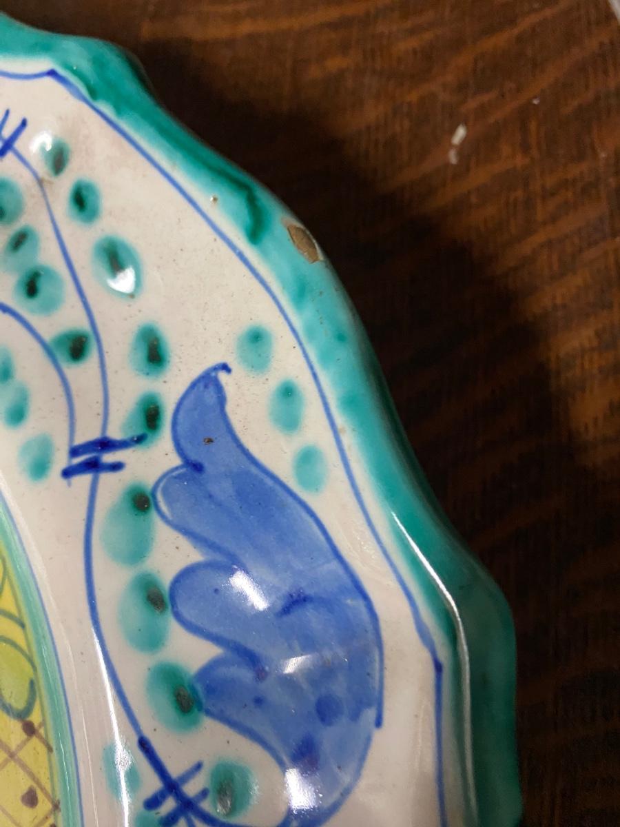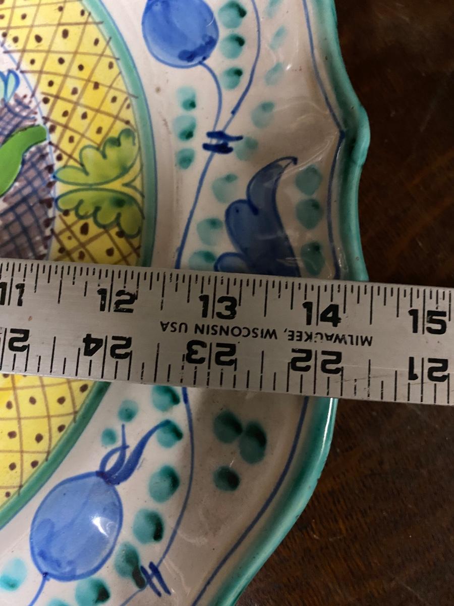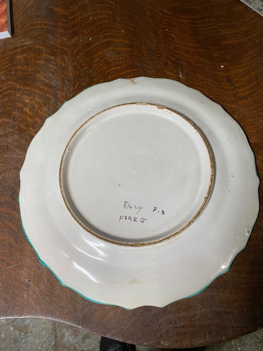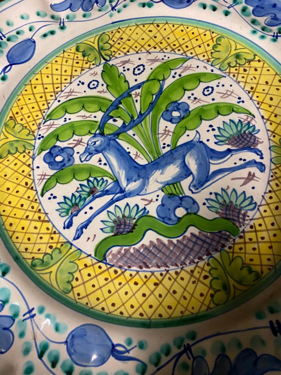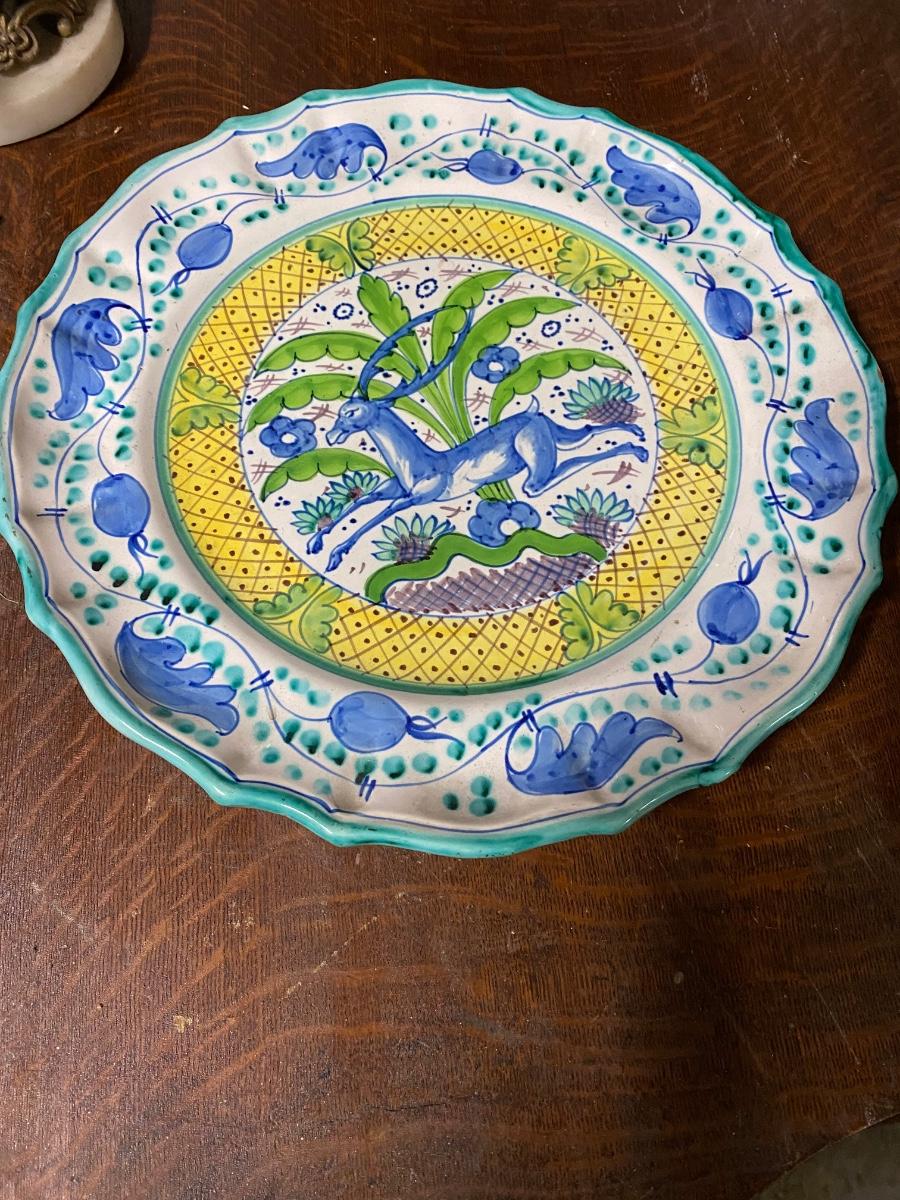 14" round painted ceramic platter made in Italy. Tiniest of chips in one spot as shown in photos. Antelope image in center.