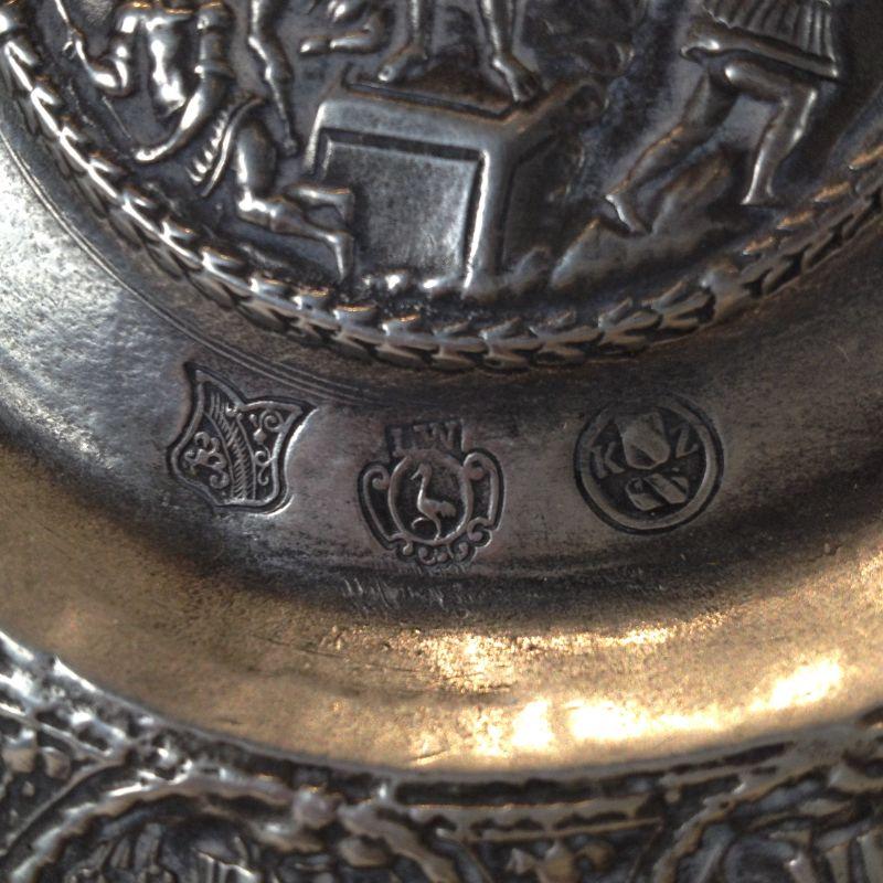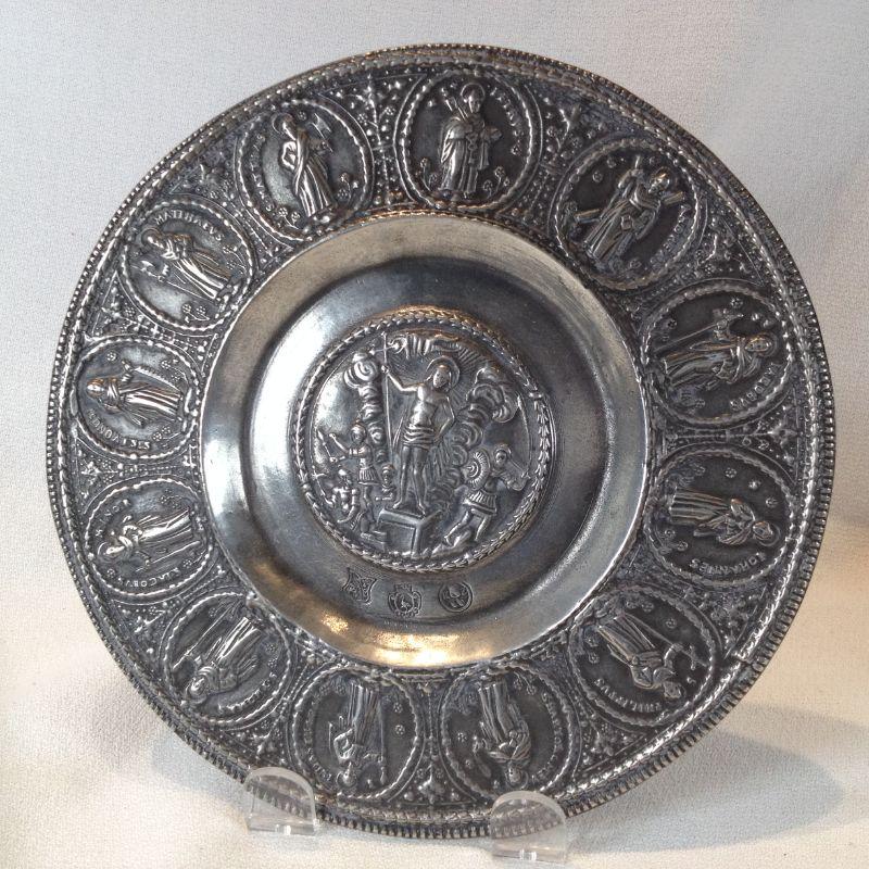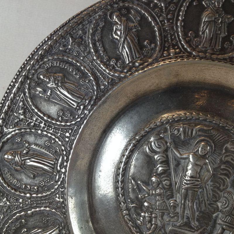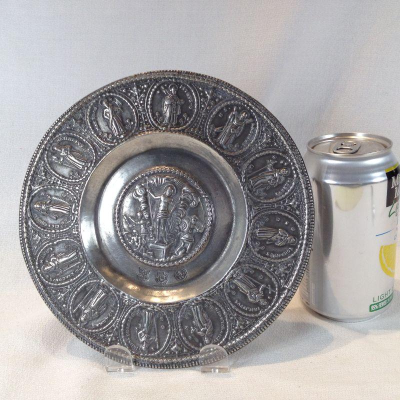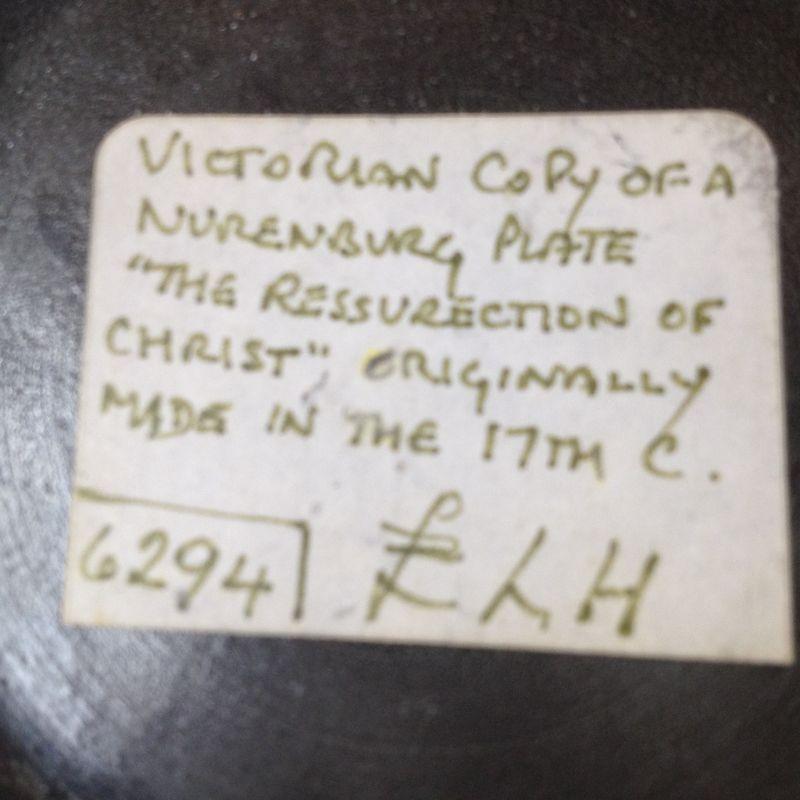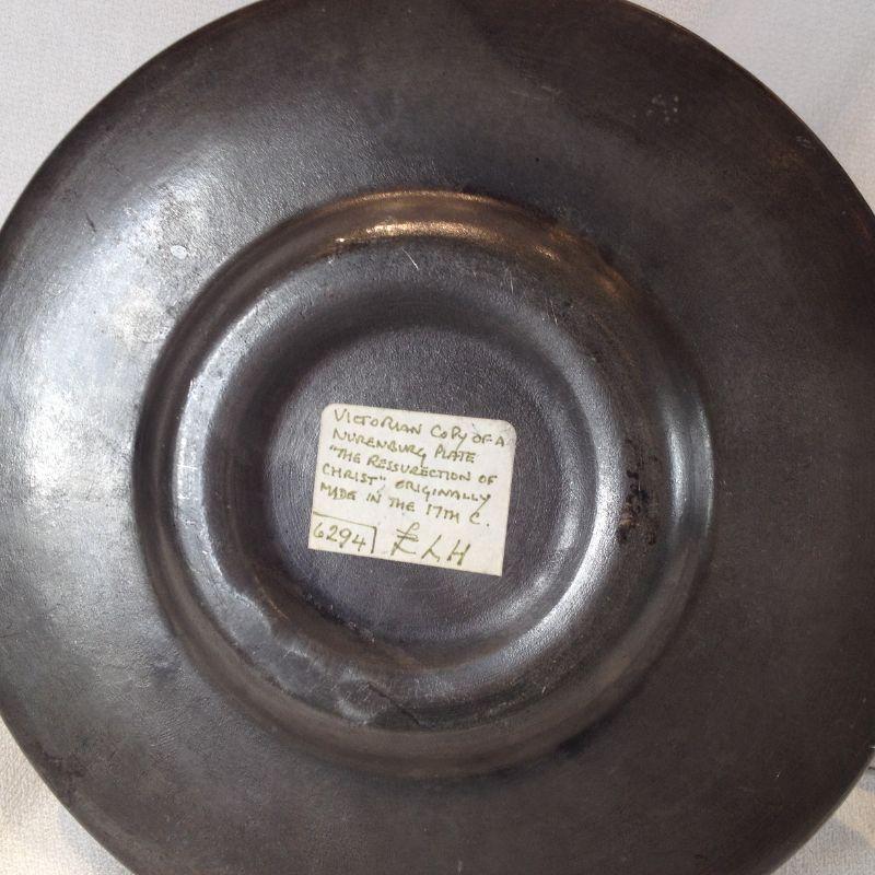 This lot is a wonderfully ornate Christian-Themed Pewter Plate. There is a note on the reverse that states it is a Victorian copy of the Nurenburg Plate - The Resurrection of Christ - originally made in the 17th Century. This plate is from the Ft. Lauderdale estate - it hung on the wall of their Virginia mansion dining room for over 50 years, we have no one left from the family to give it's true history. The family was well-moneyed and traveled extensively. In very good condition for a plate of its apparent age.