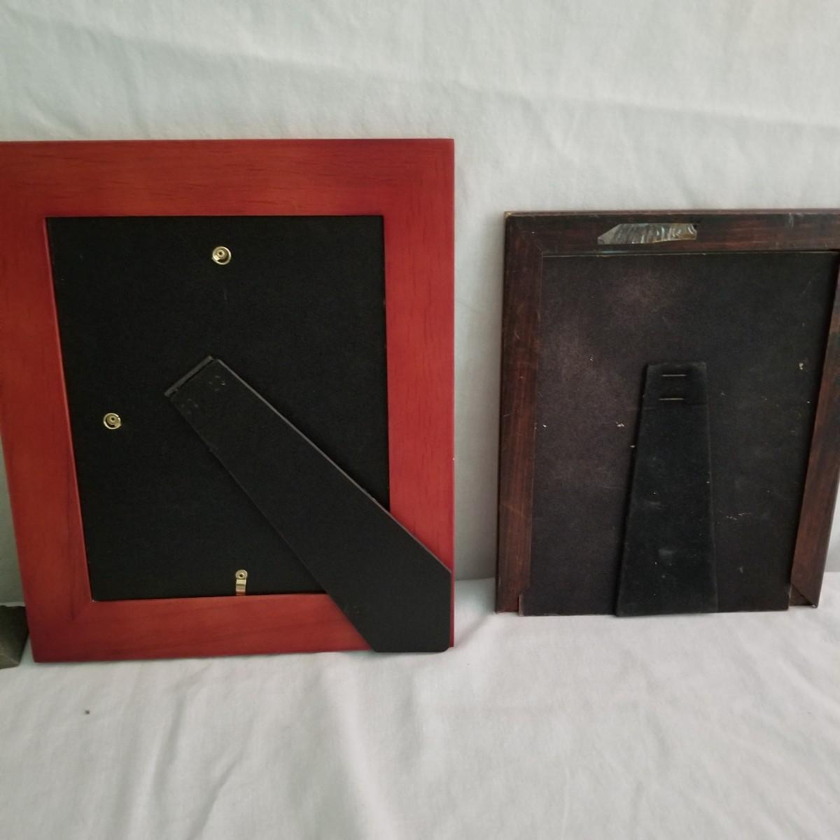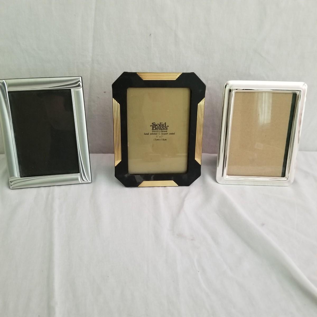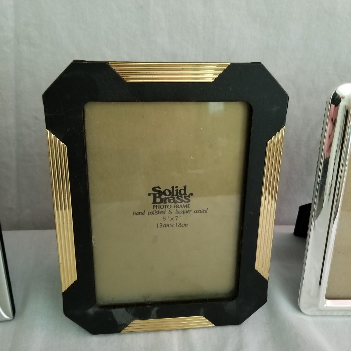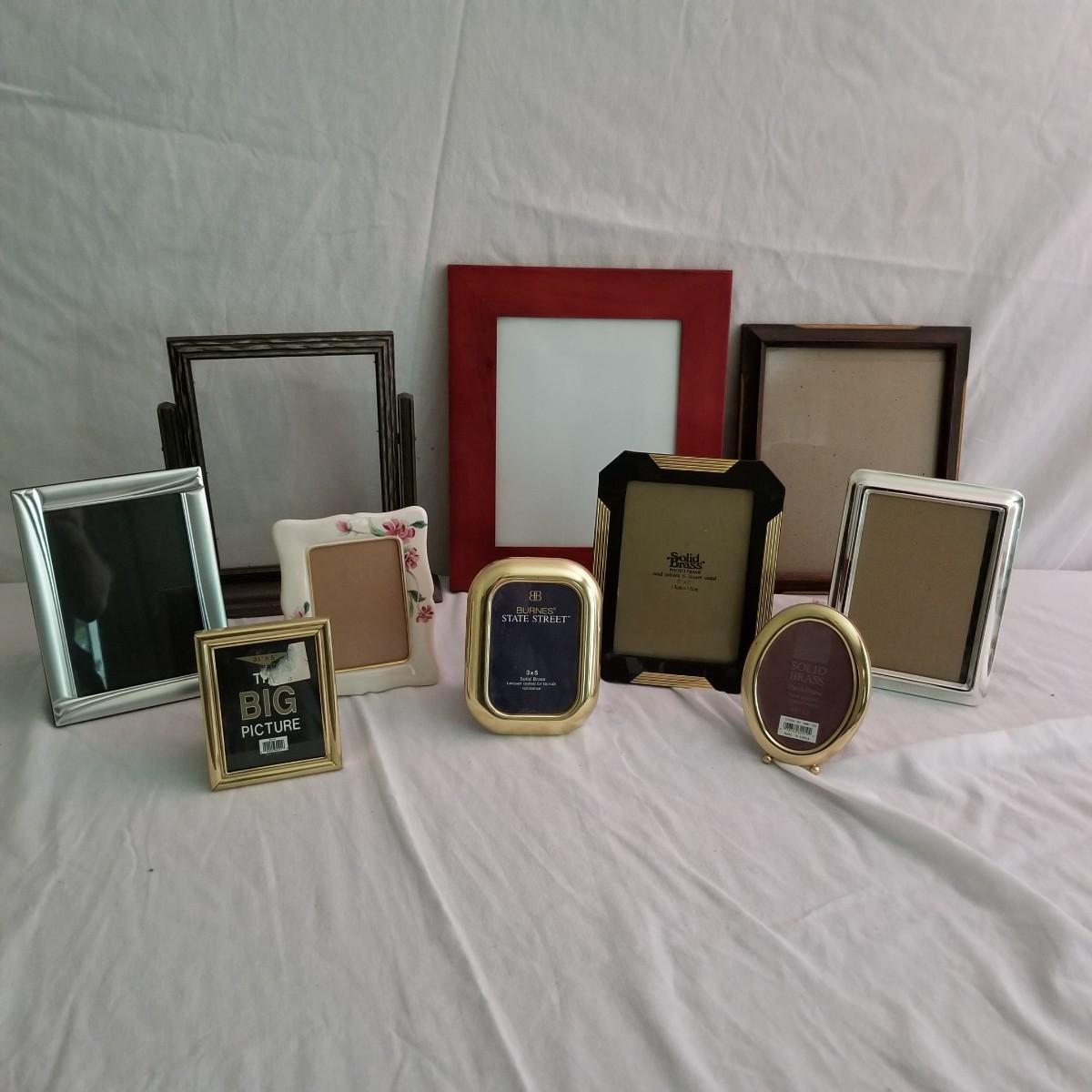 Ten different types and styles of photos frames, most are stand up with arm on back. Sizes range from 3" x5" to 11.5"x 13.5". Brass, wood and ceramic. See photos for details. Shipping available.