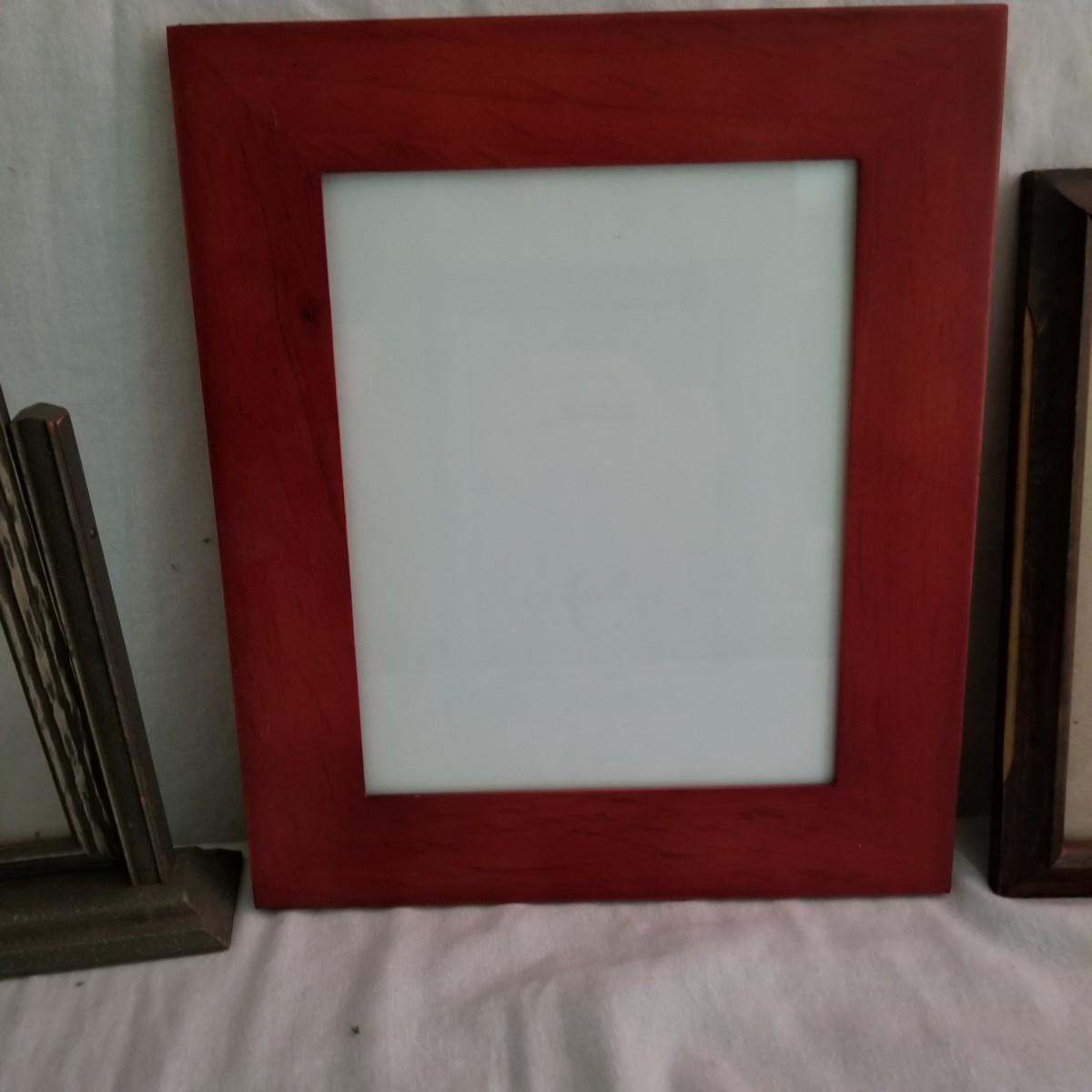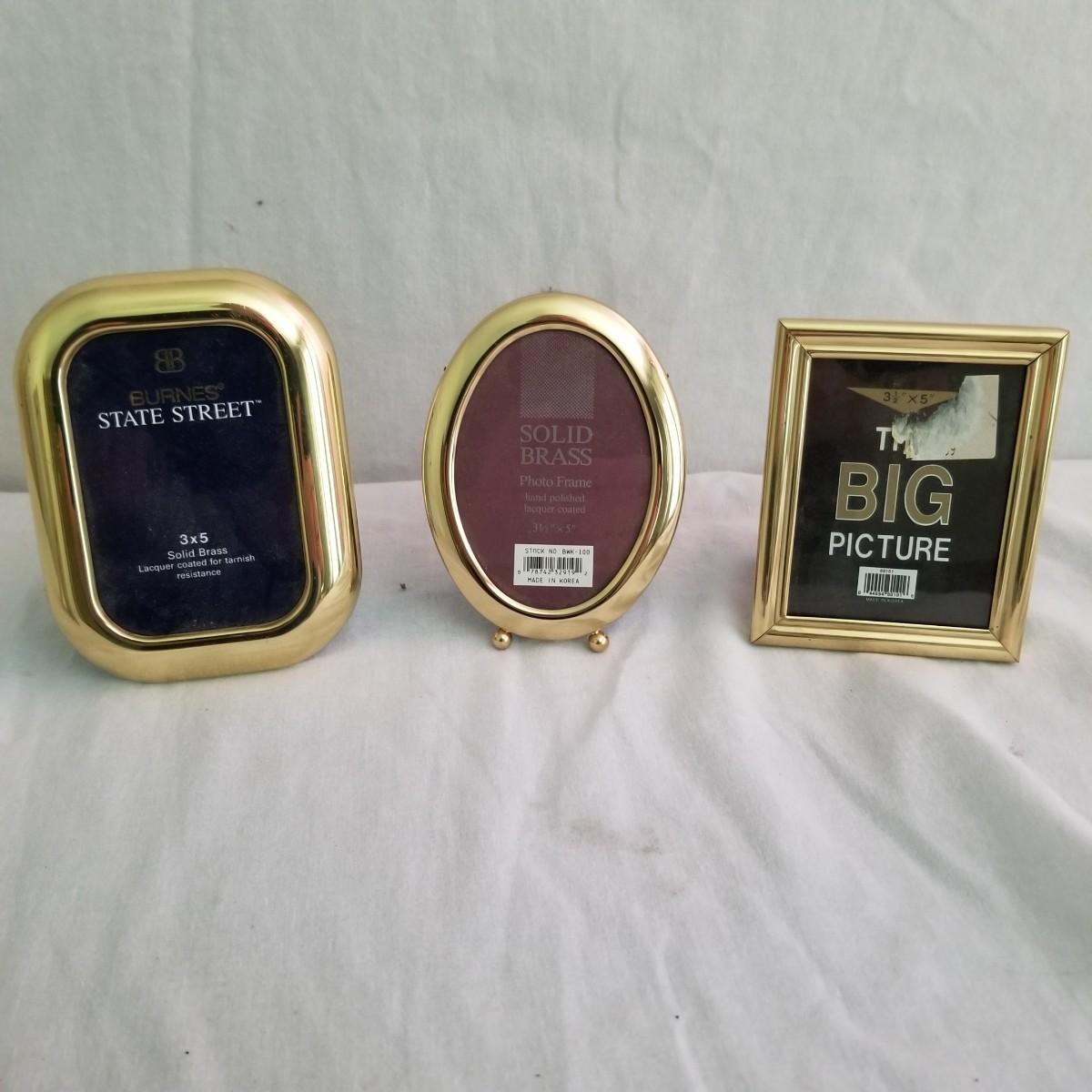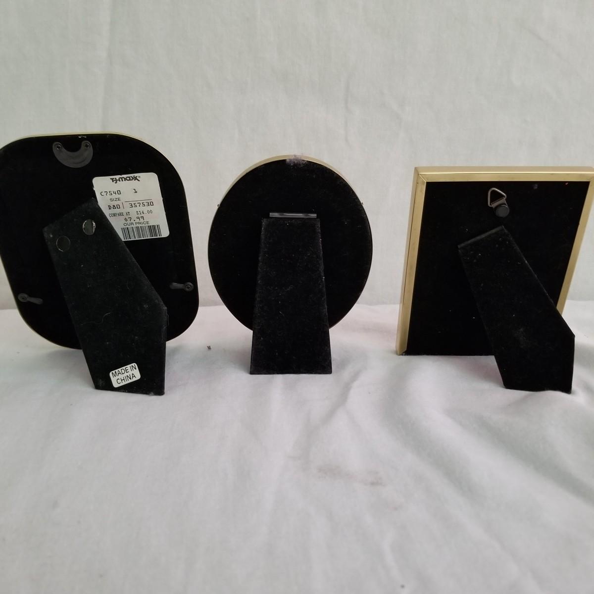 Ten different types and styles of photos frames, most are stand up with arm on back. Sizes range from 3" x5" to 11.5"x 13.5". Brass, wood and ceramic. See photos for details. Shipping available.