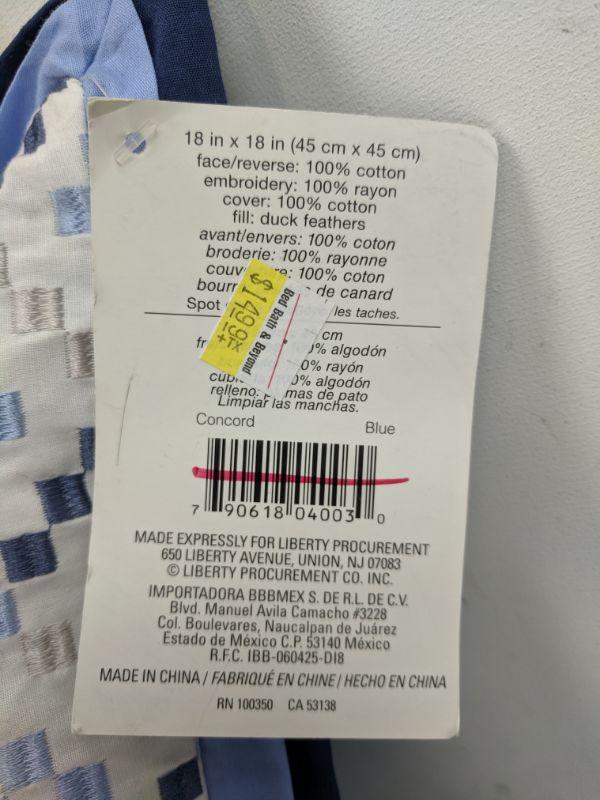 Decorative Pillow, 18x18 Blue, Lt Blue, White, Gray. With Small Pink Mark