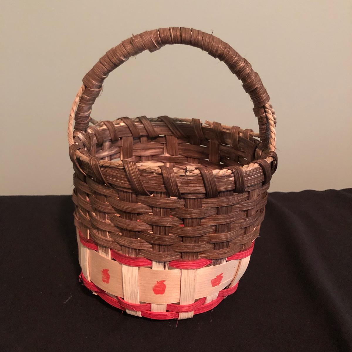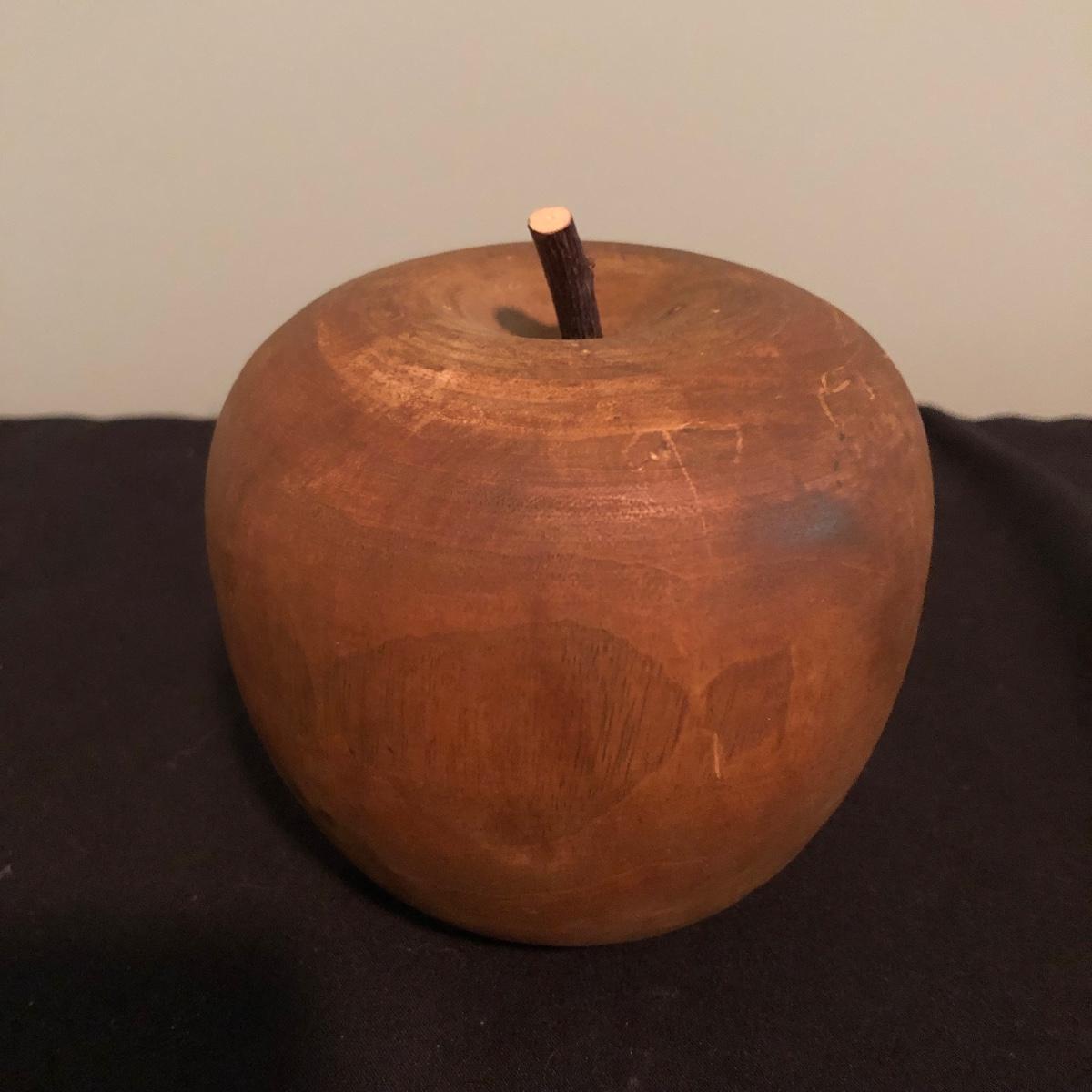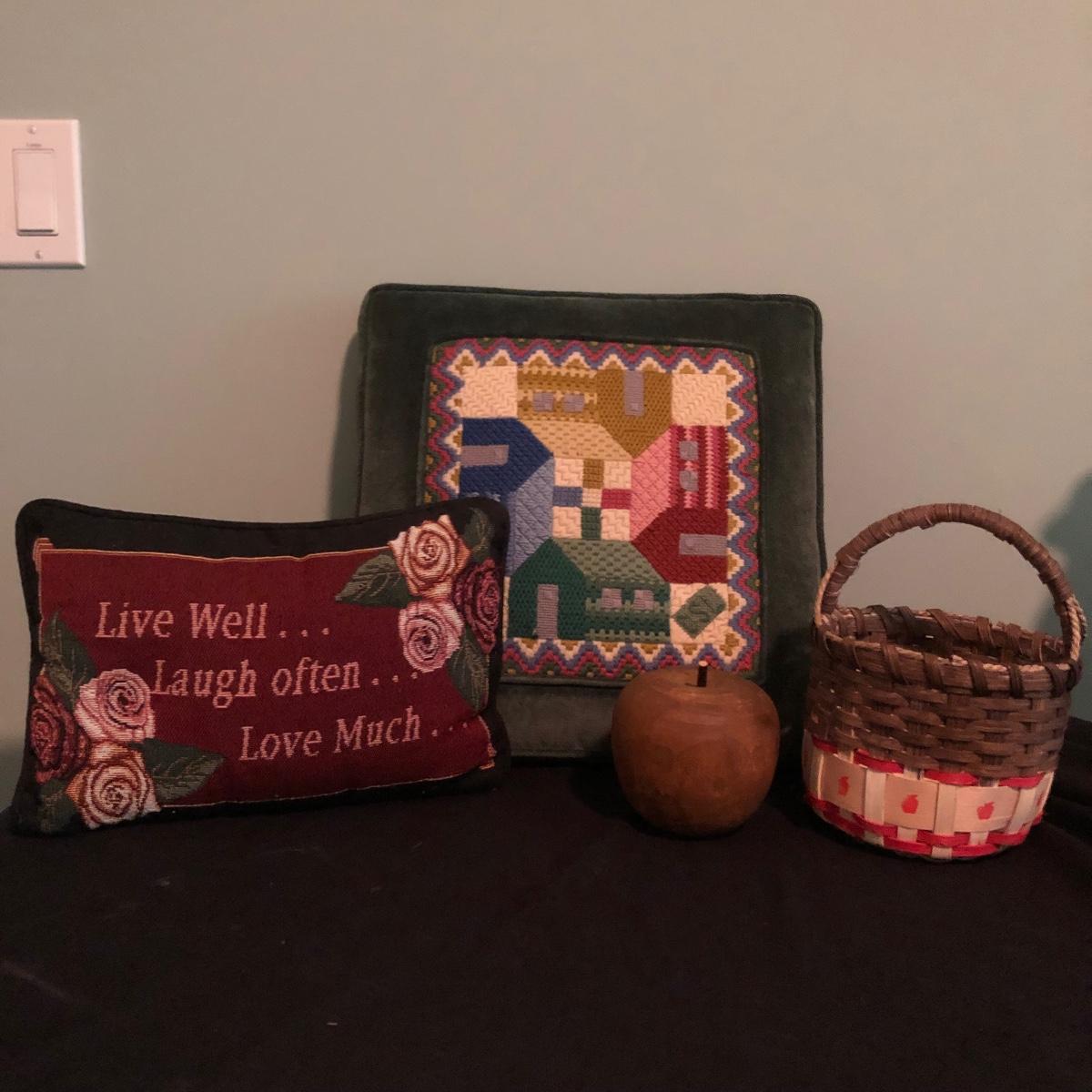 Lot includes two decorative pillows, woven basket and wooden apple. Largest pillow measures 15” x 15” x 3”.