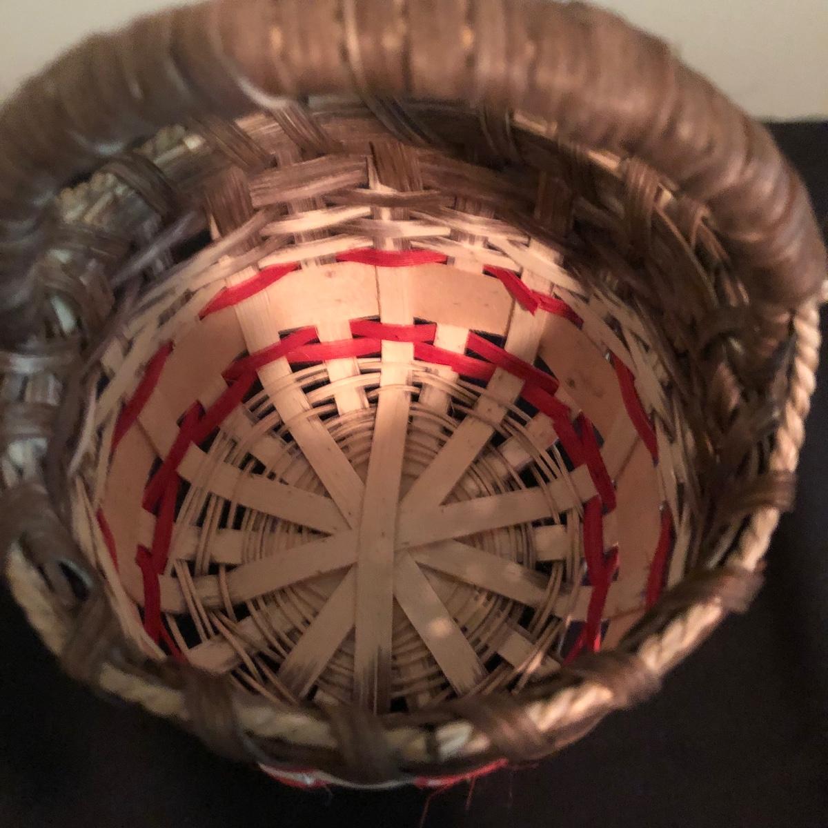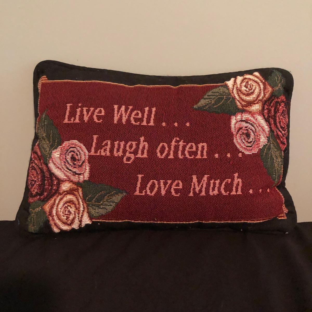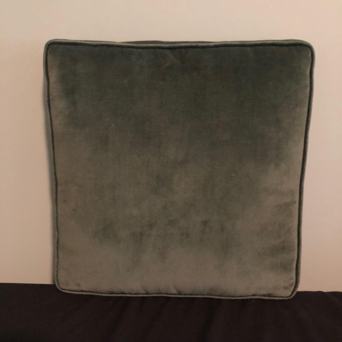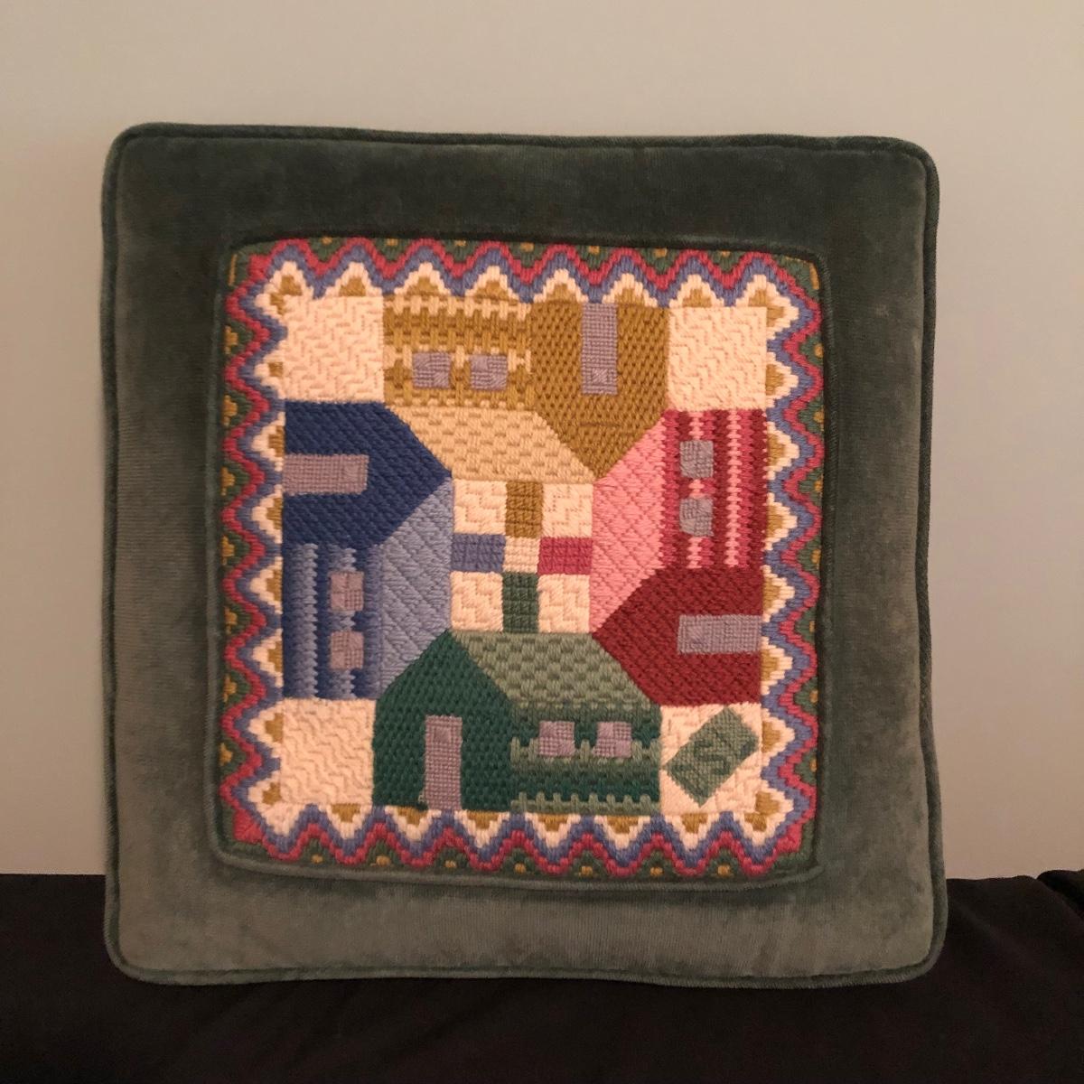 Lot includes two decorative pillows, woven basket and wooden apple. Largest pillow measures 15” x 15” x 3”.