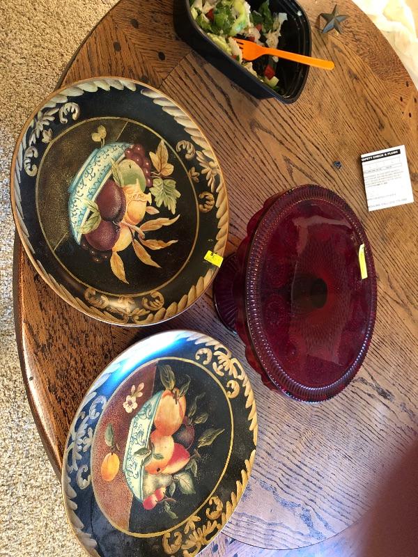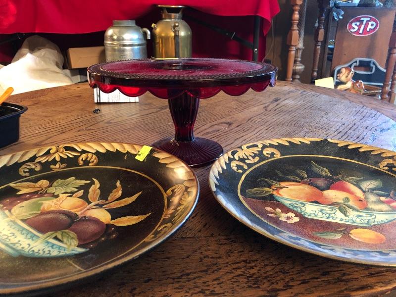 Set of 2 decorative plates with cut glass red cake stand 5 1/4 inches tall