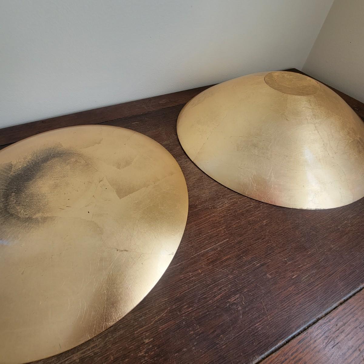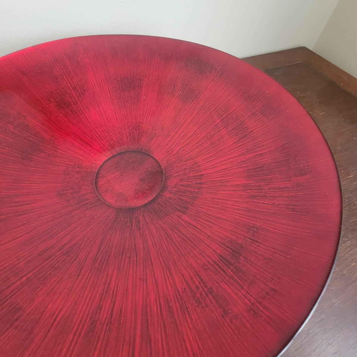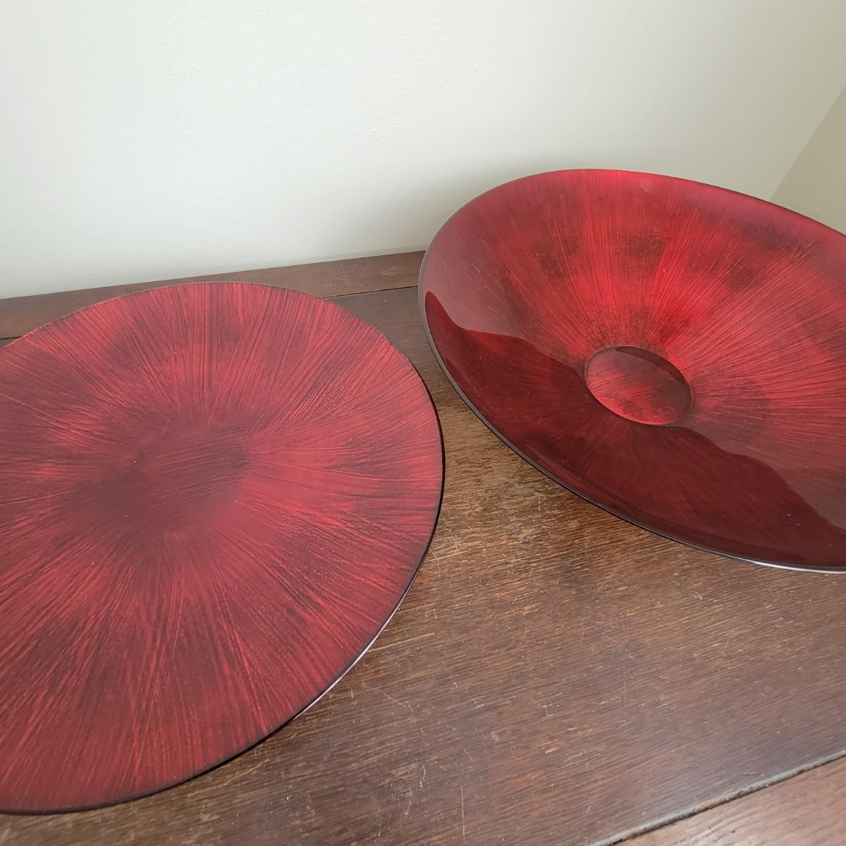 Large, decorative glass bowl and plate. Surface is a rich red color and the backs are gold leaf. No noticeable damage to either piece. The bowl measures approximately 17"d x 4" Local pickup only