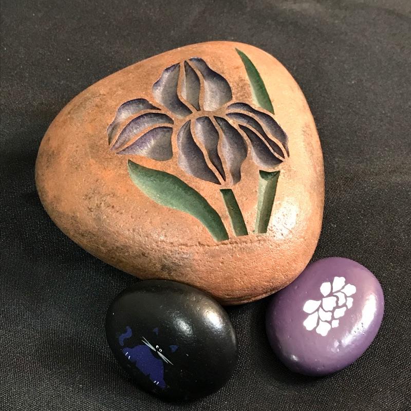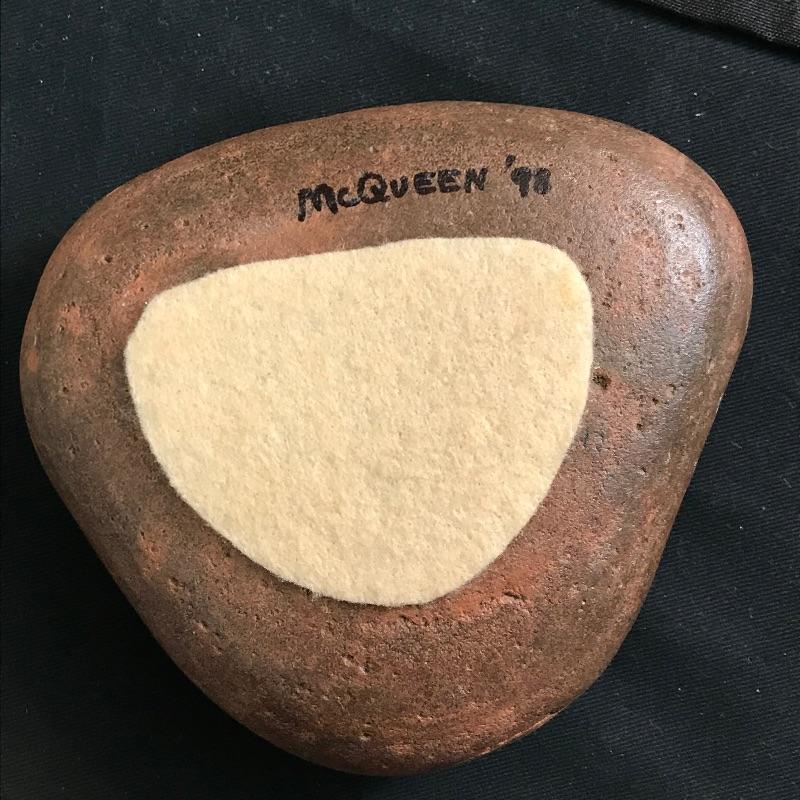 Three decorative rocks. The two smaller ones are painted, and the larger one appears to be cast and has a felt bottom and is signed, “McQueen “˜98“.
