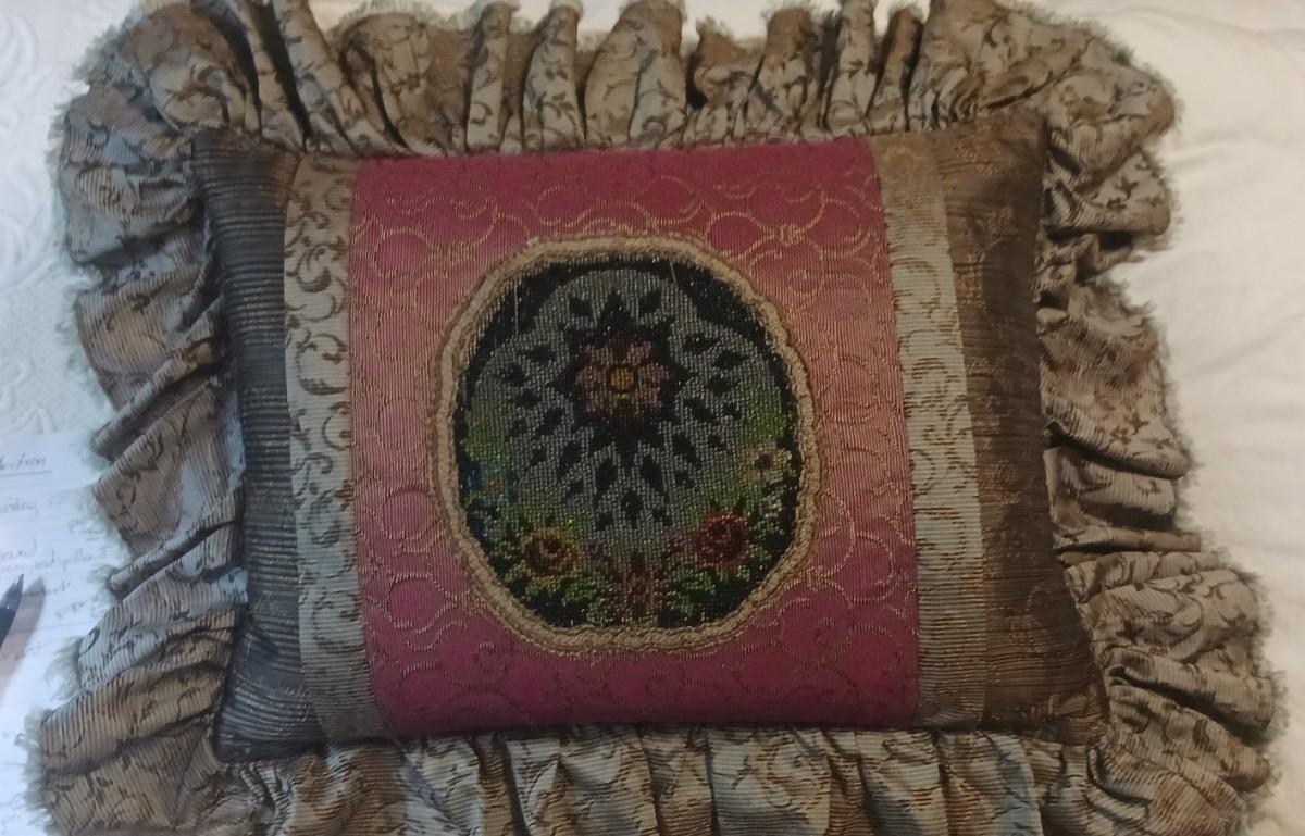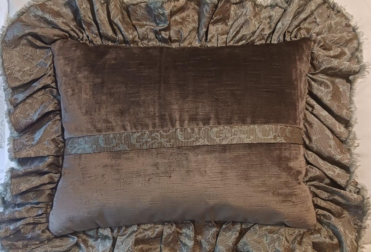 Decorative ruffled throw pillow with red, gold colors satiny type material