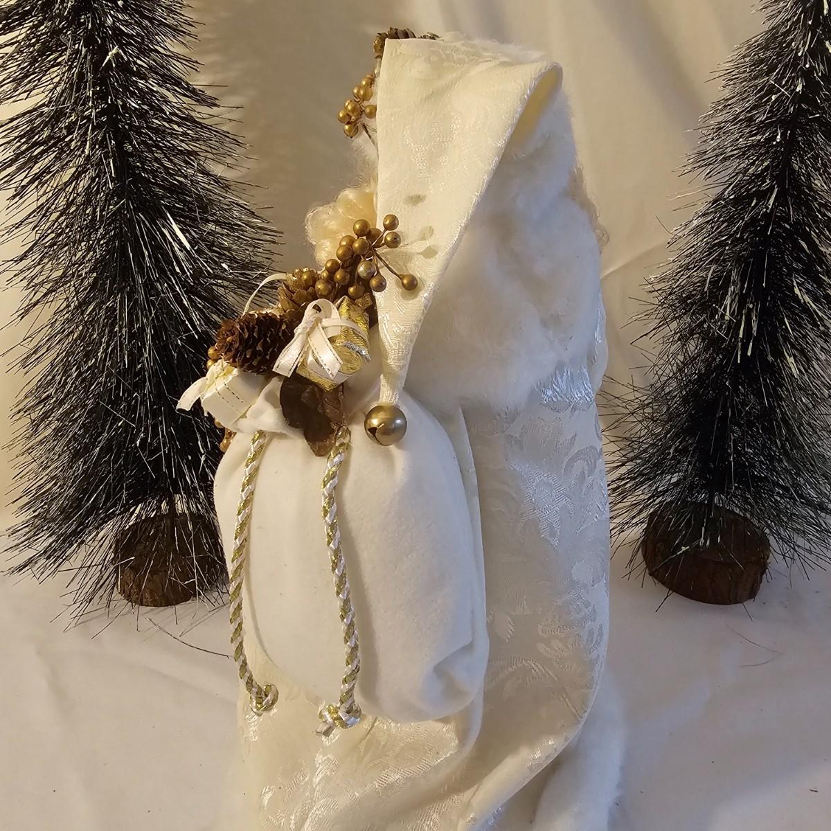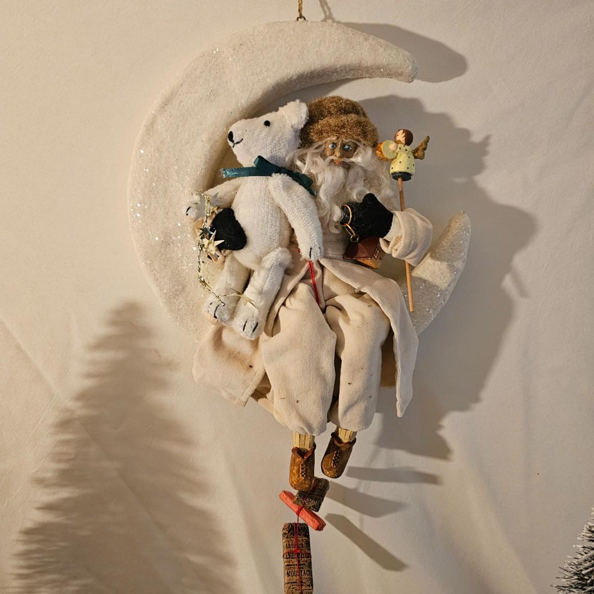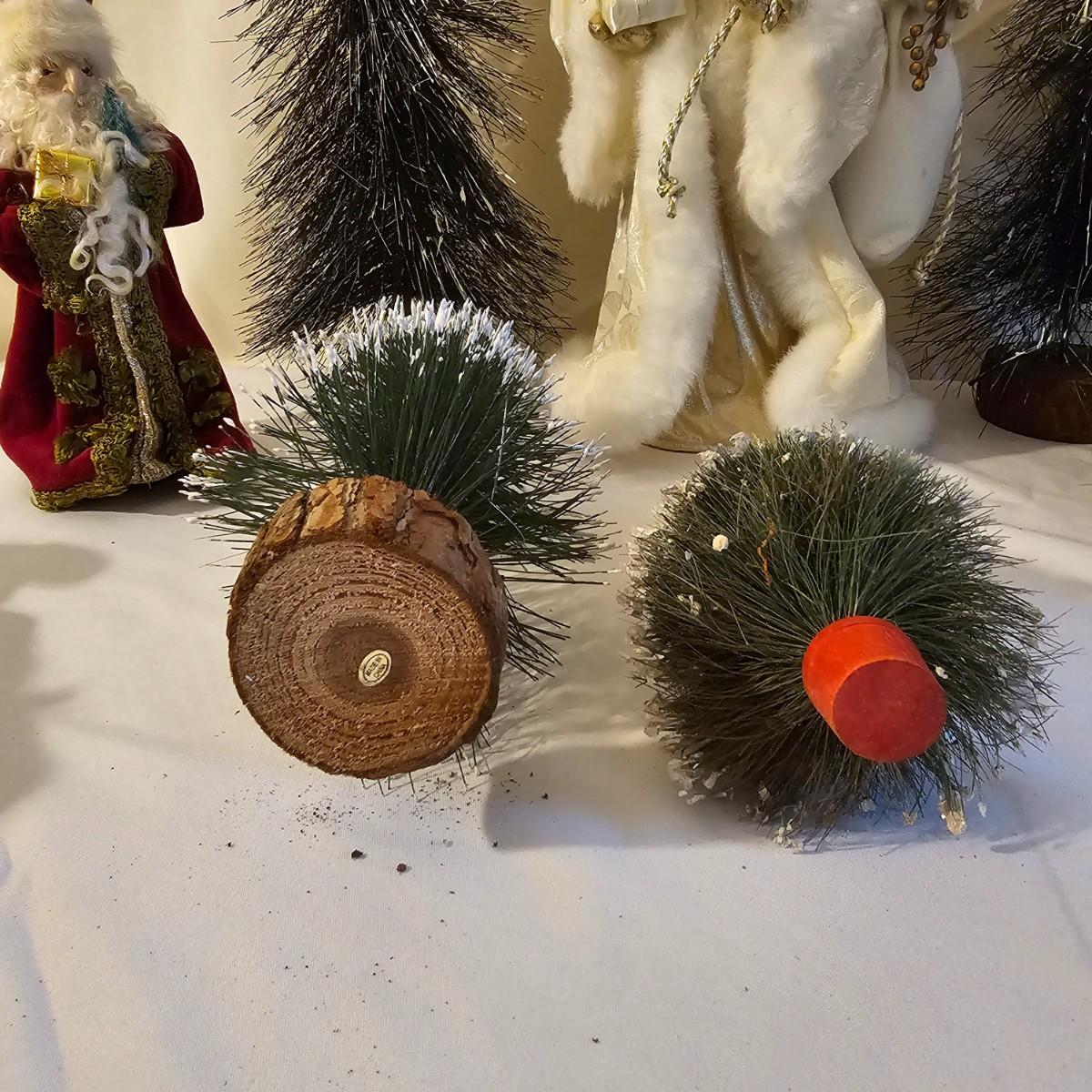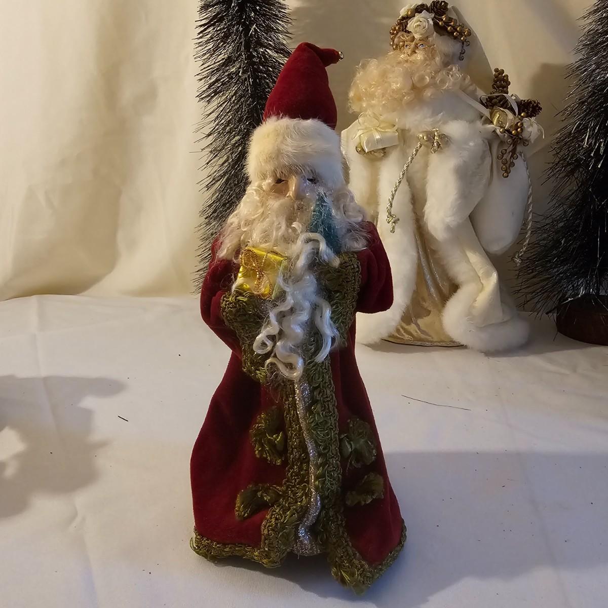 Five Santas and six trees for holiday decorating. The largest Santa dressed in white is a tree topper and measures 8" x 7" x 16"H. Tallest tree is 7" x 25"H. Santa with moon is 10" D x 3". See photos for details. Shipping available.