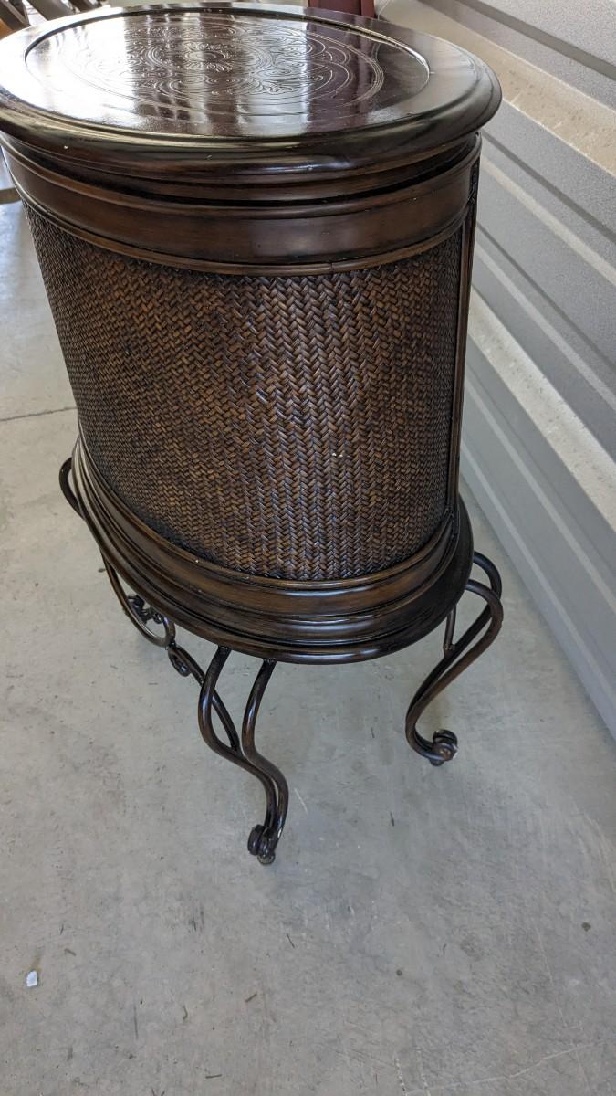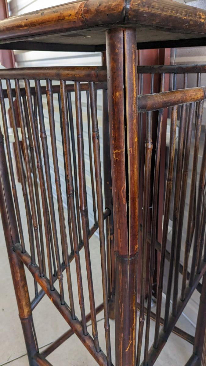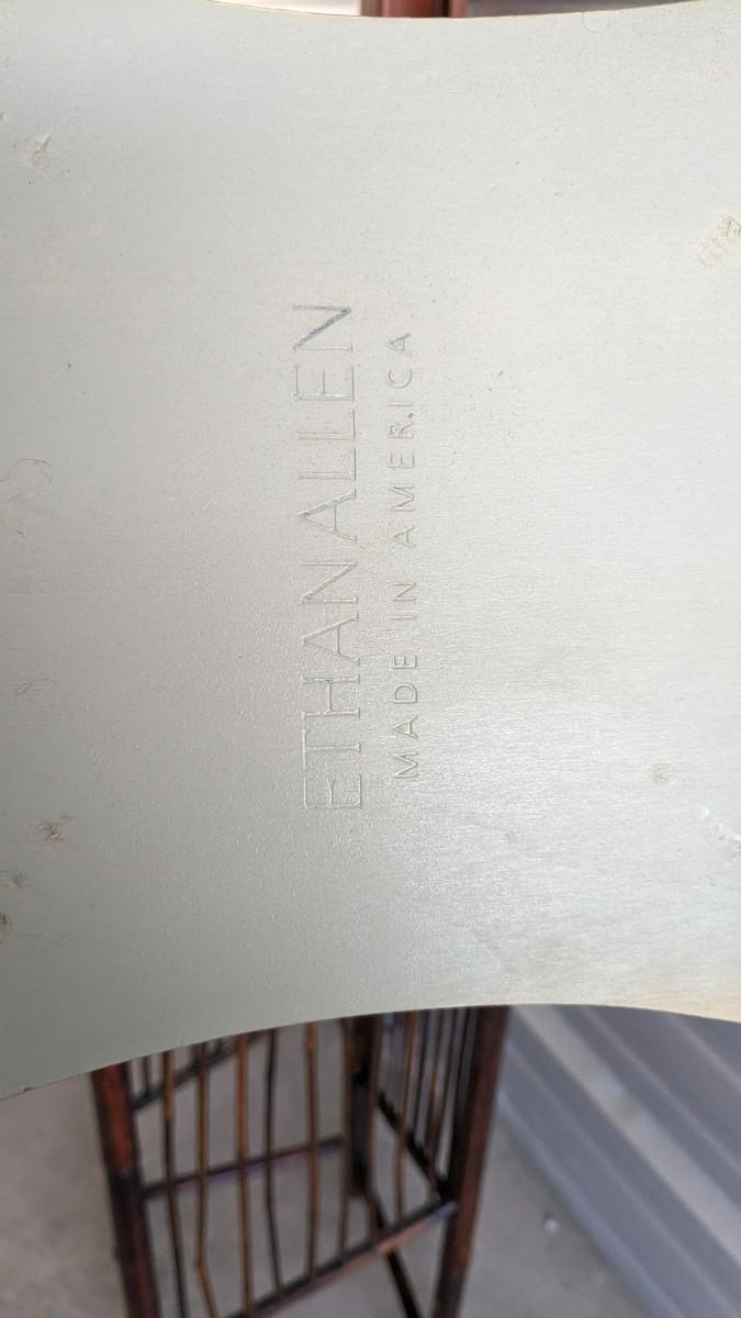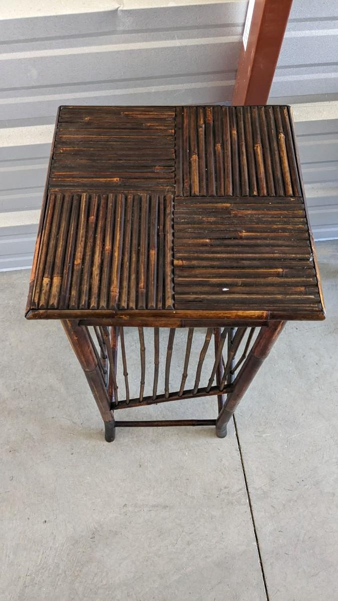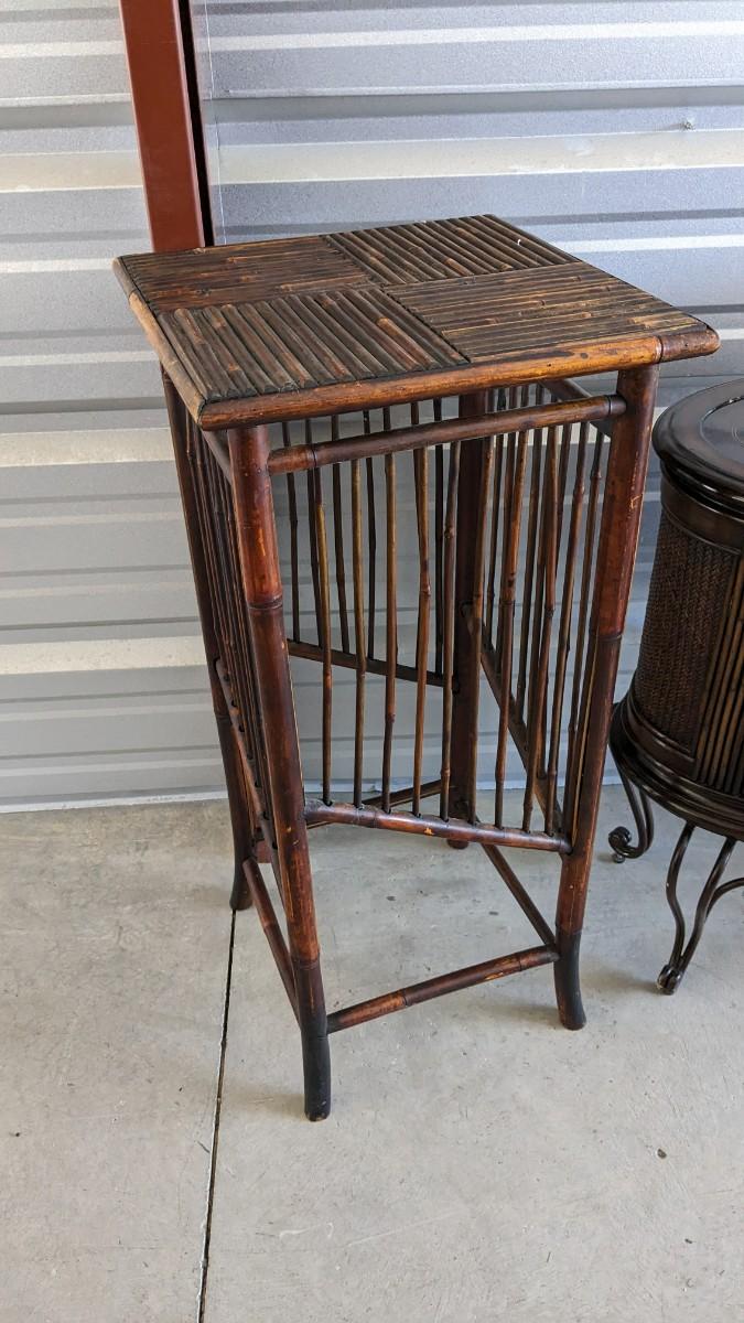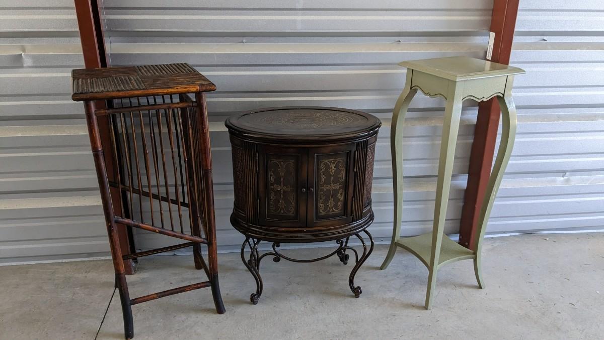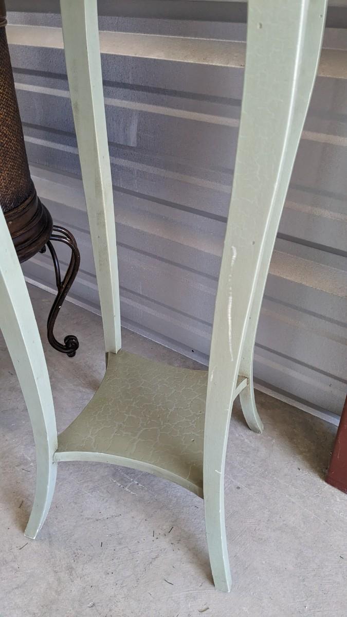 3 decorative side tables/plant stands. Includes Ethan Allen 12"x 12"x 35" sage green piece. 15.75"x15.75"x34" bamboo plant stand/side table, this piece shows multiple areas of cracking in cane (note in photos) still structurally sounds though. Finally, a beautiful 21.5"x13.75"x27.75" neoclassical shelved table, adjustable legs, please note minor wear to legs and surface, a super cute piece of furniture. No shipping. 2616