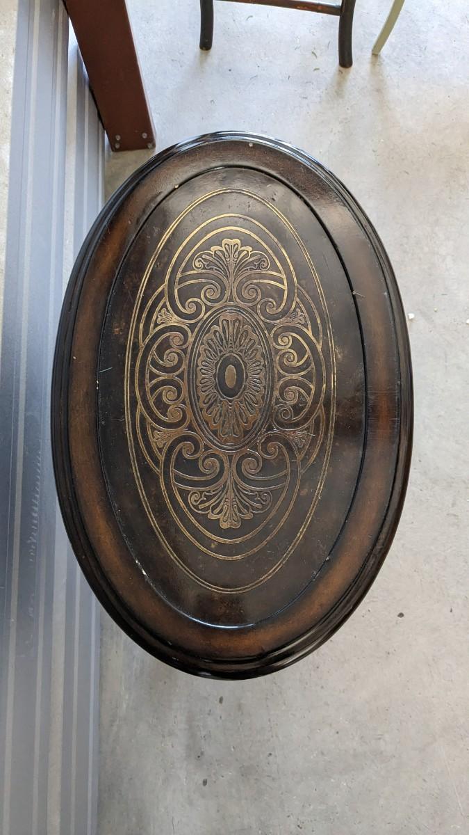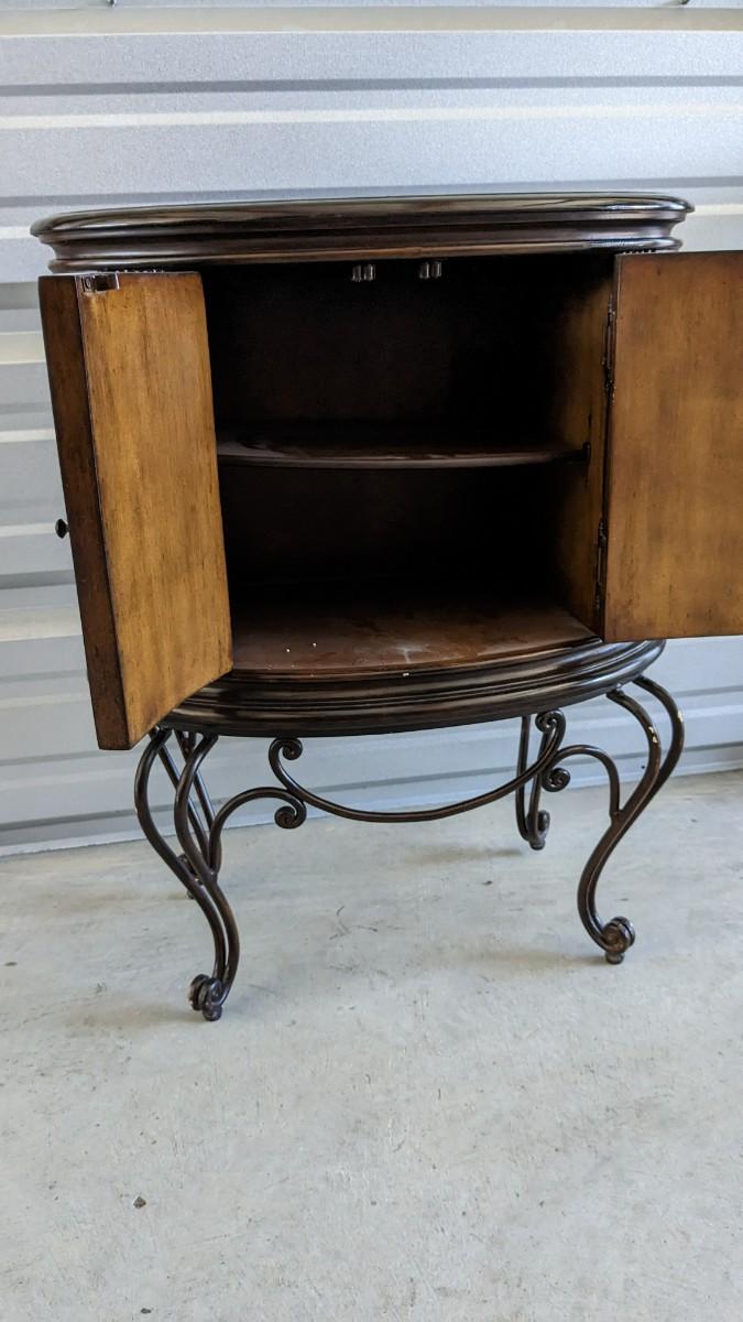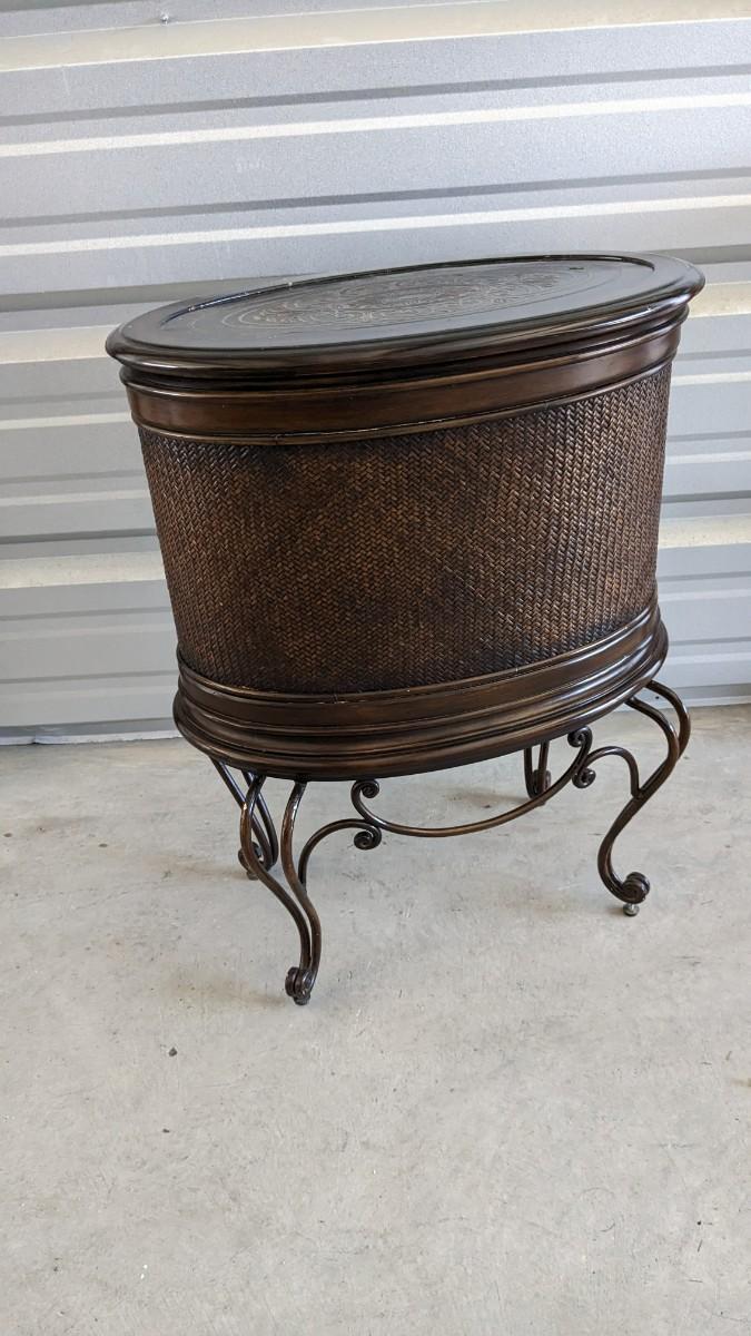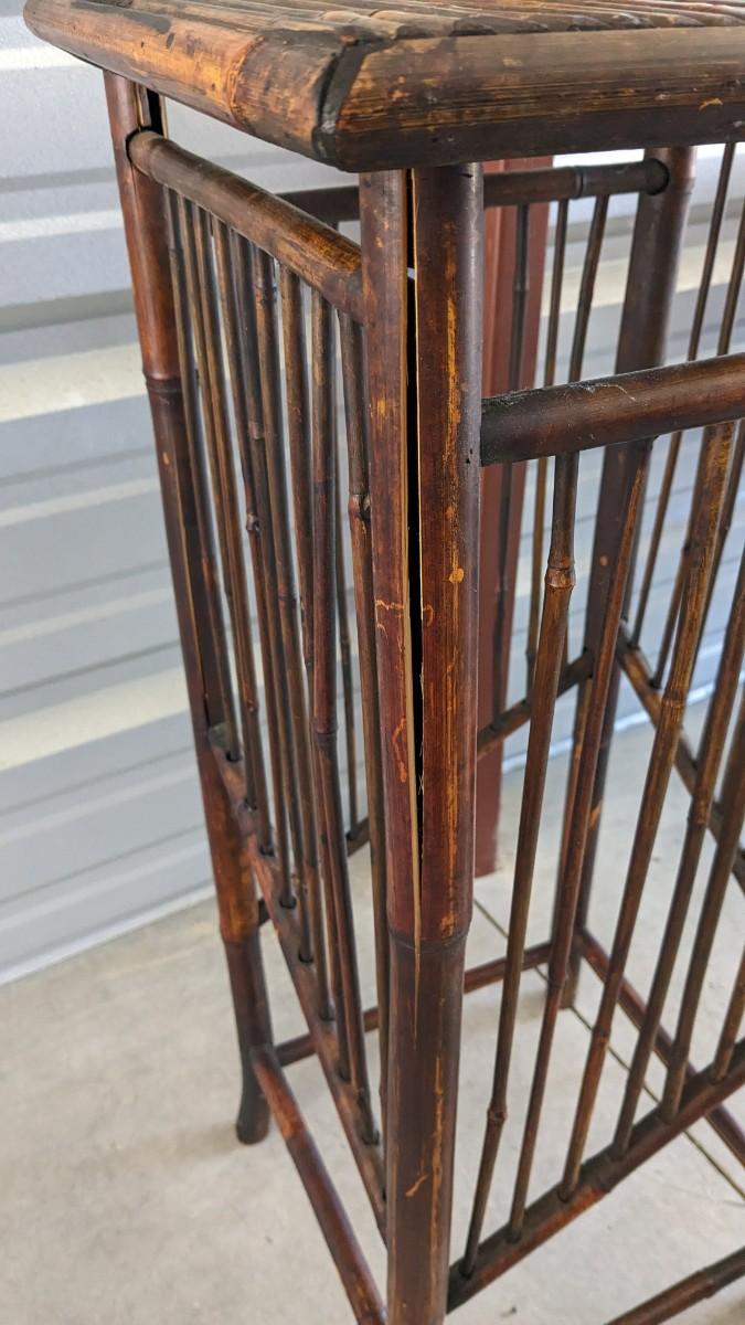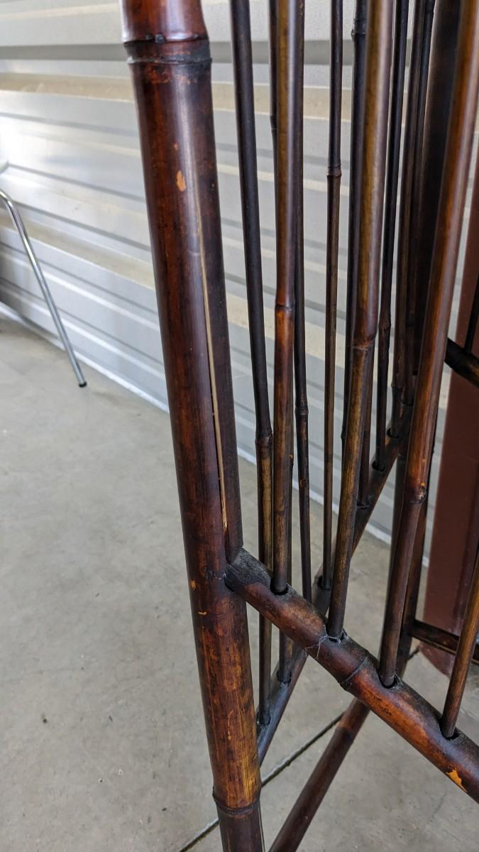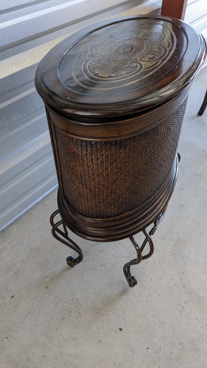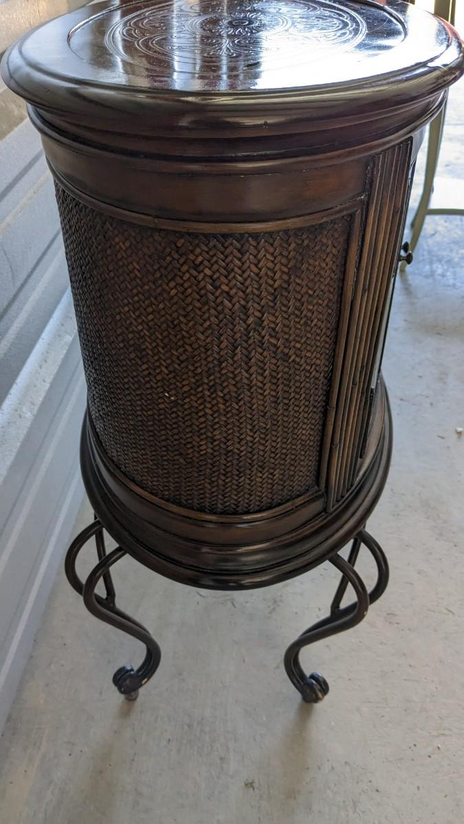 3 decorative side tables/plant stands. Includes Ethan Allen 12"x 12"x 35" sage green piece. 15.75"x15.75"x34" bamboo plant stand/side table, this piece shows multiple areas of cracking in cane (note in photos) still structurally sounds though. Finally, a beautiful 21.5"x13.75"x27.75" neoclassical shelved table, adjustable legs, please note minor wear to legs and surface, a super cute piece of furniture. No shipping. 2616