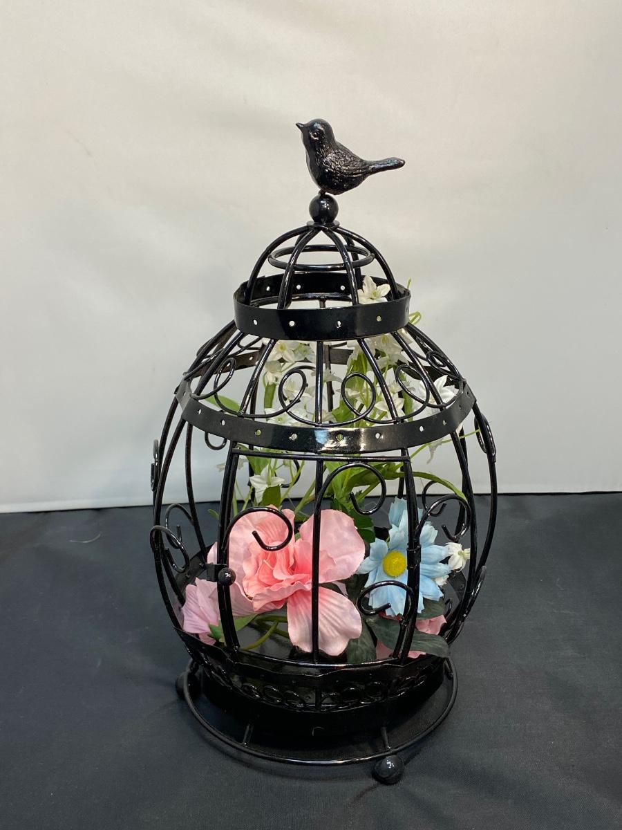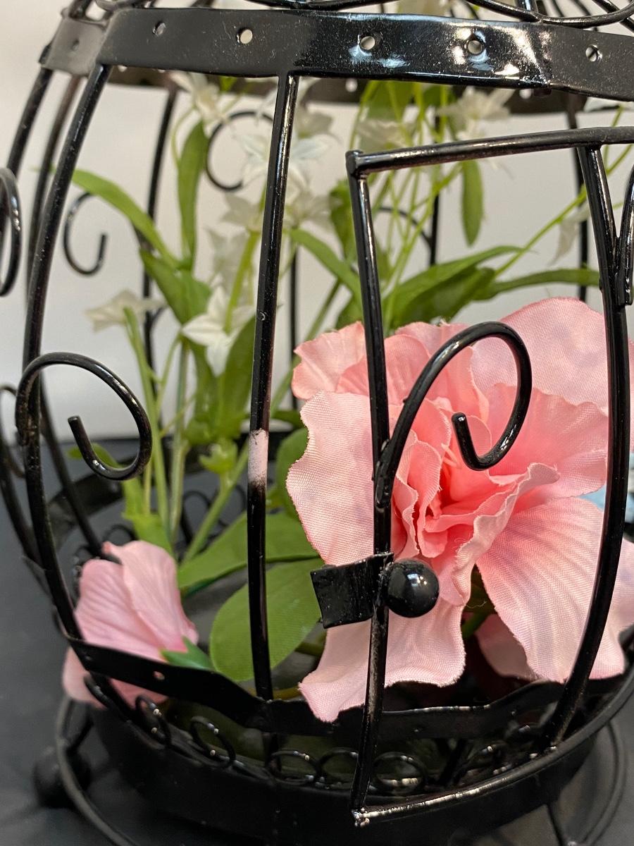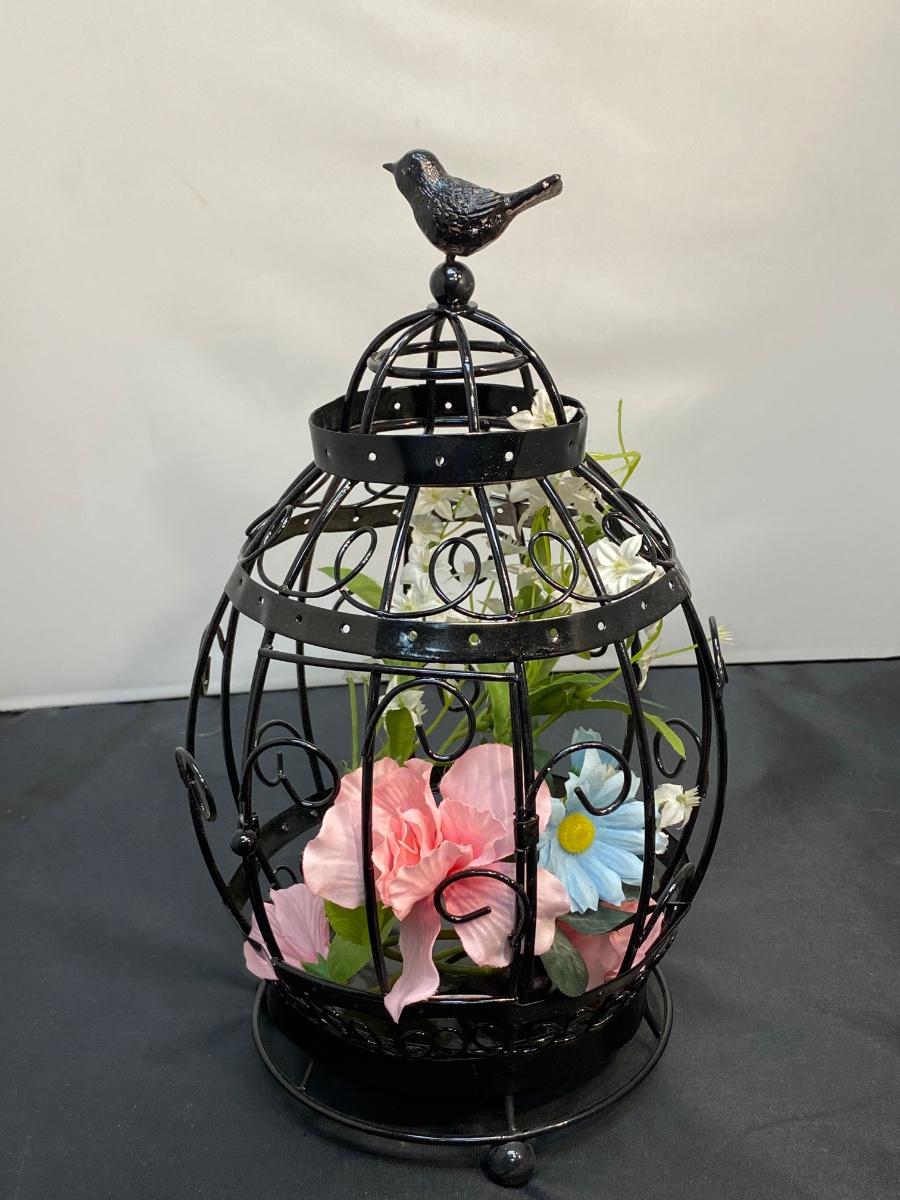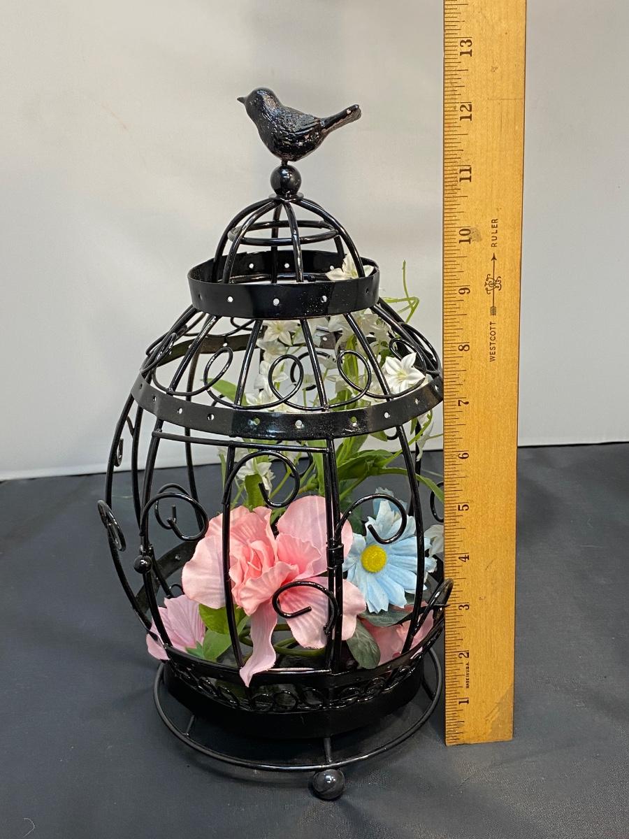 Small decorative birdcage. Looks like previous owner may have painted it black. Flowers can be removed easily. Door is a little tweaked. About 12" tall.