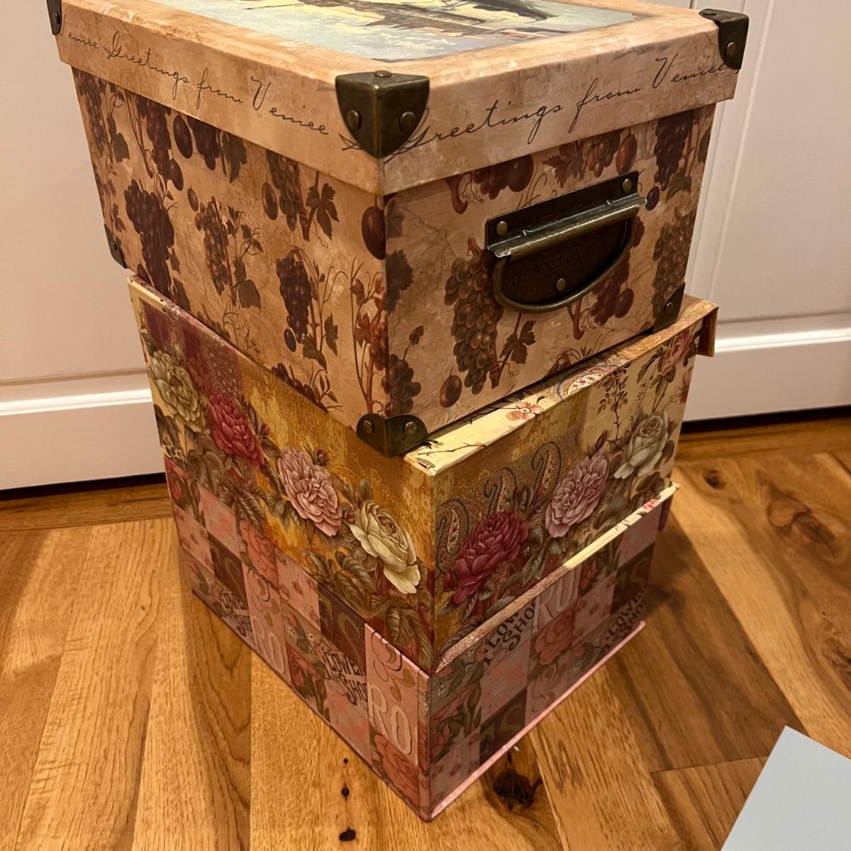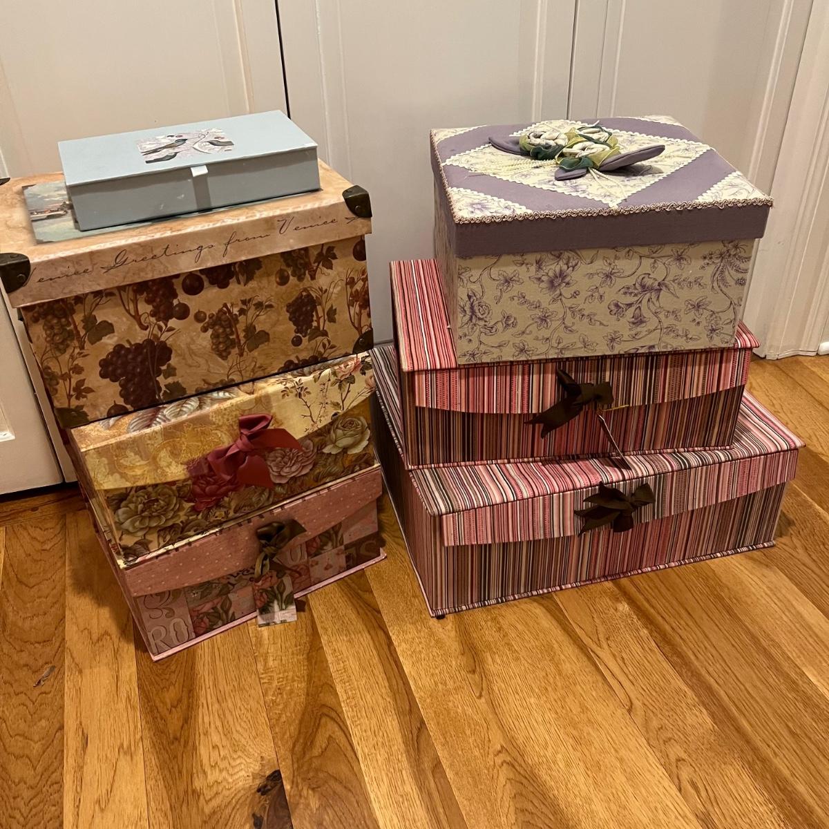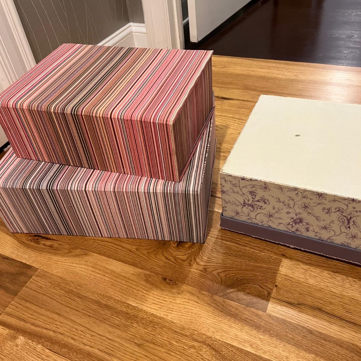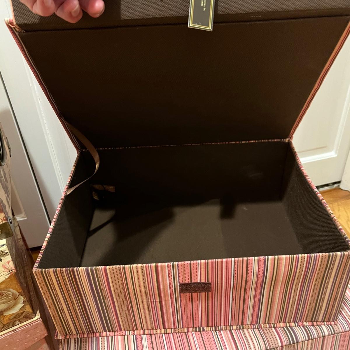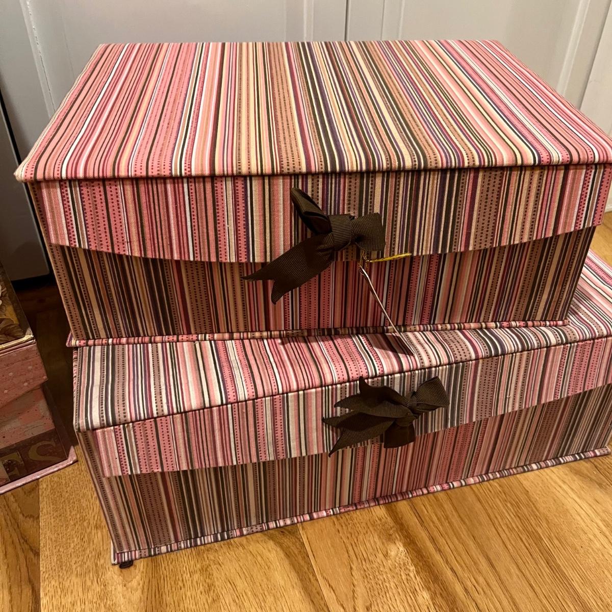 A total of seven decorative storage boxes here. The largest is one of the pair of pink striped boxes, which measures 18” x 15” x 6”.