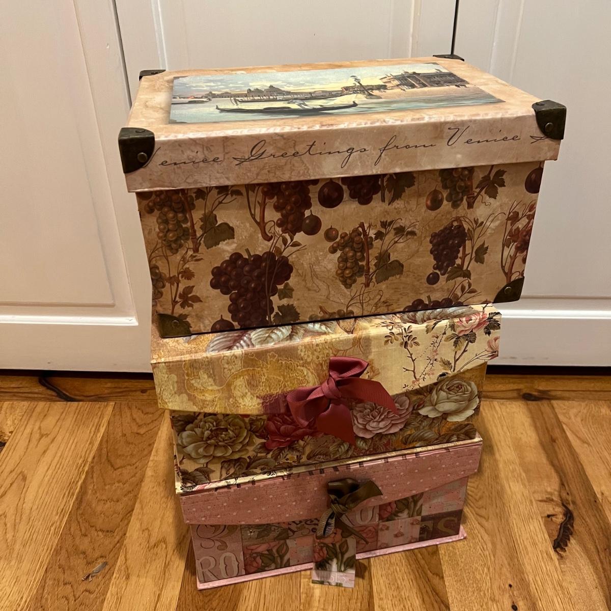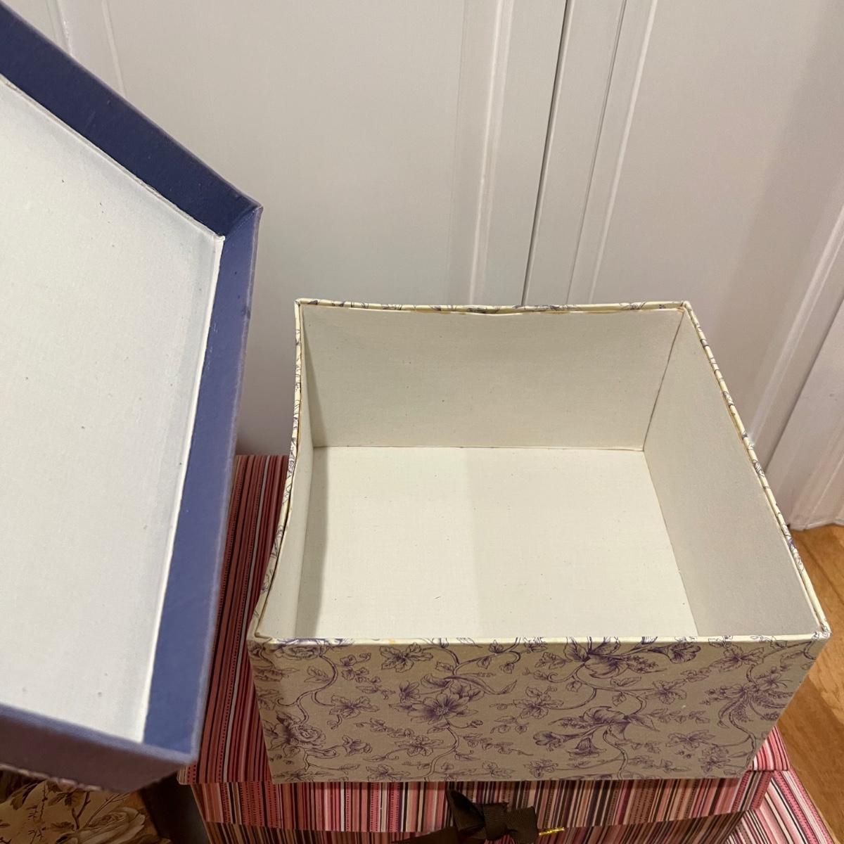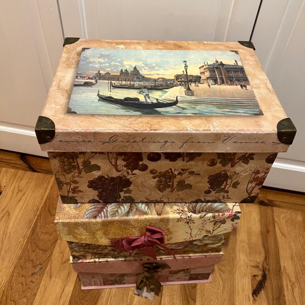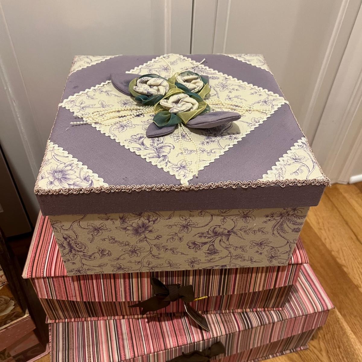 A total of seven decorative storage boxes here. The largest is one of the pair of pink striped boxes, which measures 18” x 15” x 6”.