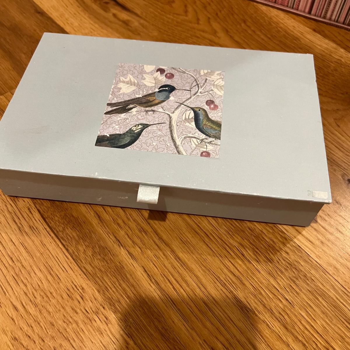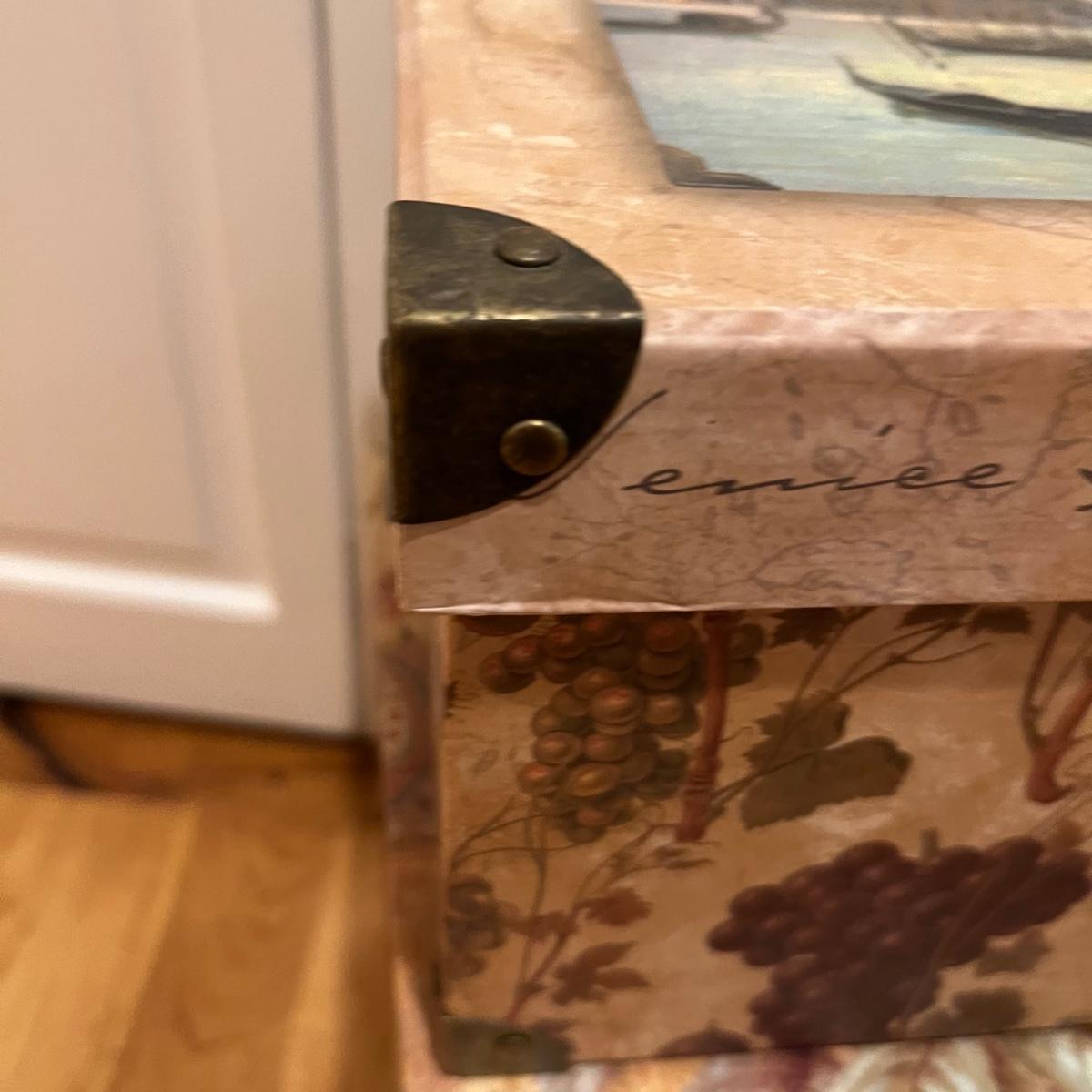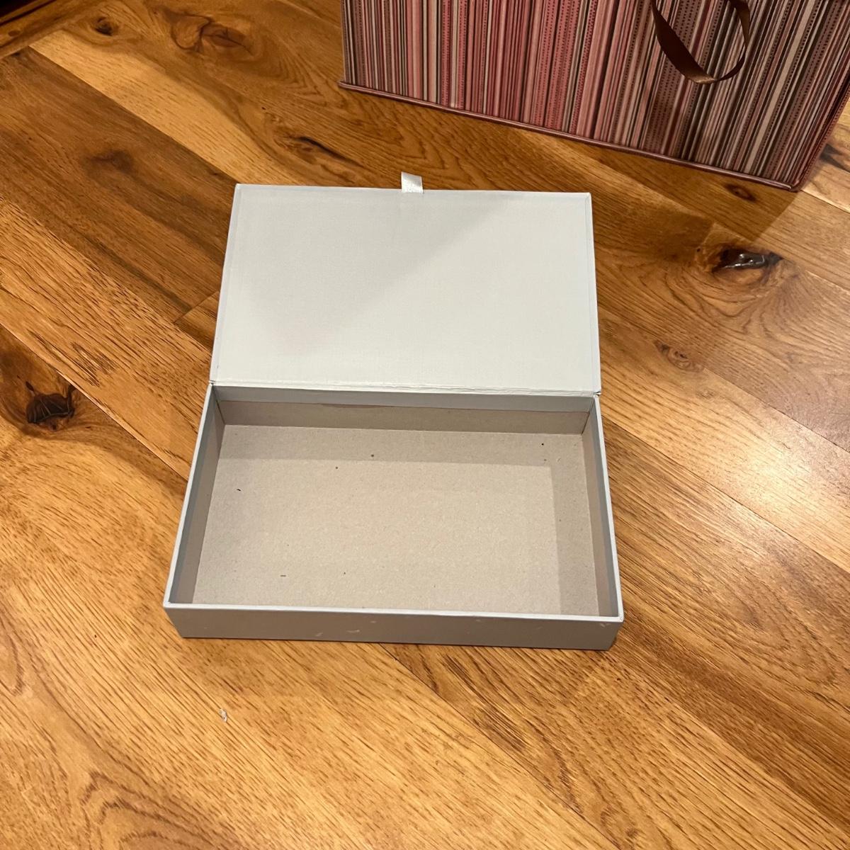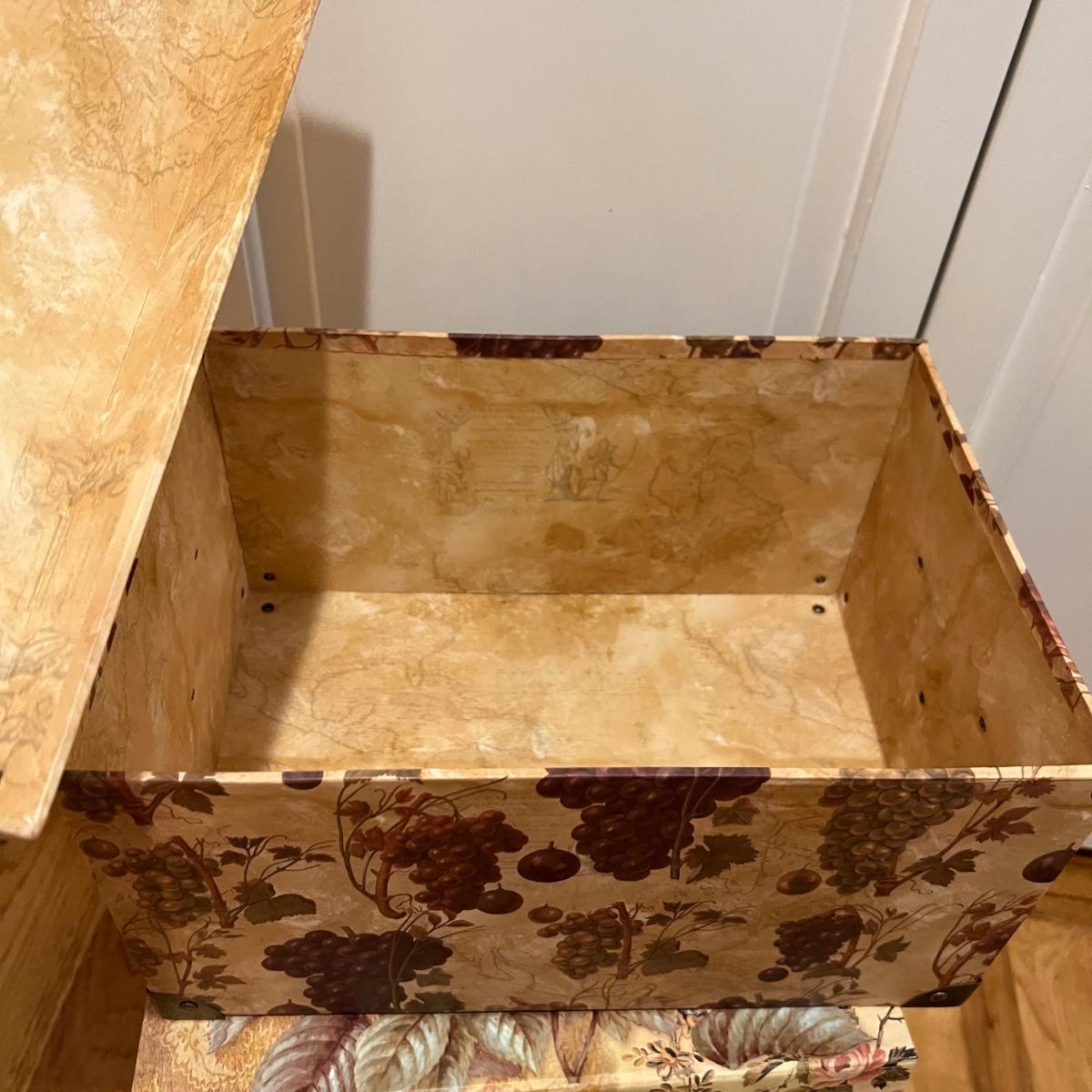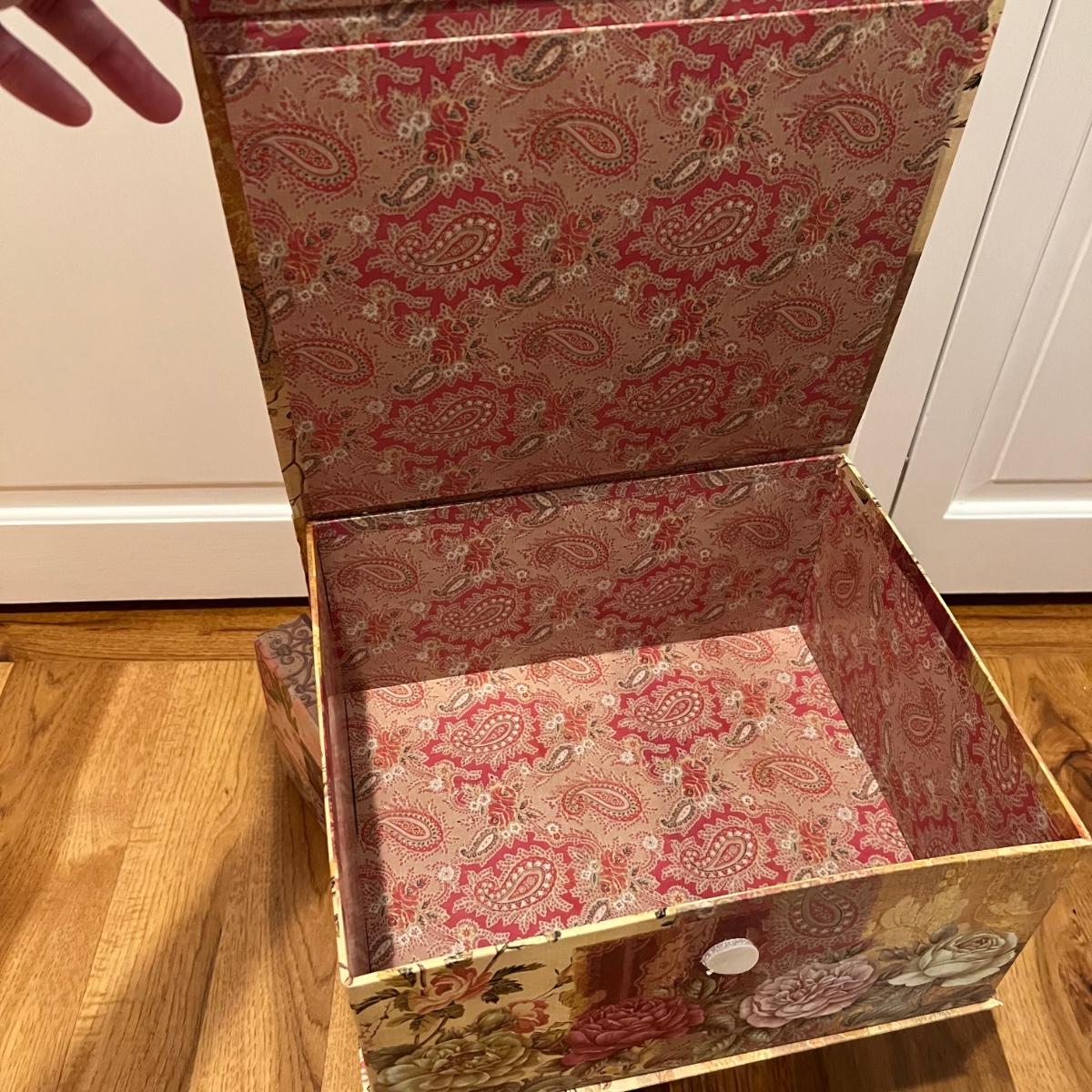 A total of seven decorative storage boxes here. The largest is one of the pair of pink striped boxes, which measures 18” x 15” x 6”.