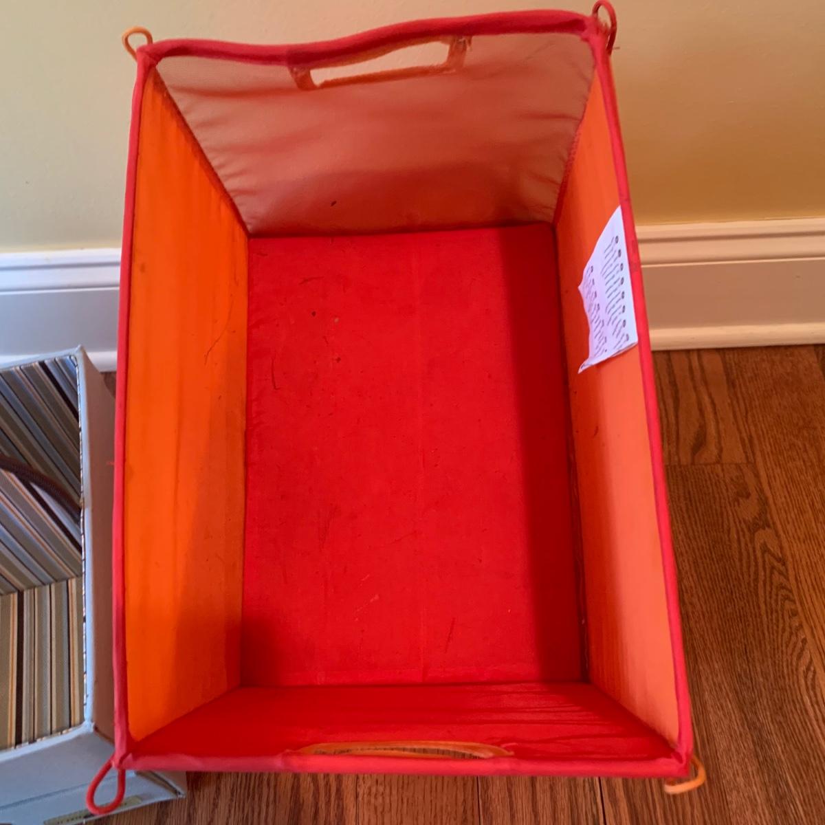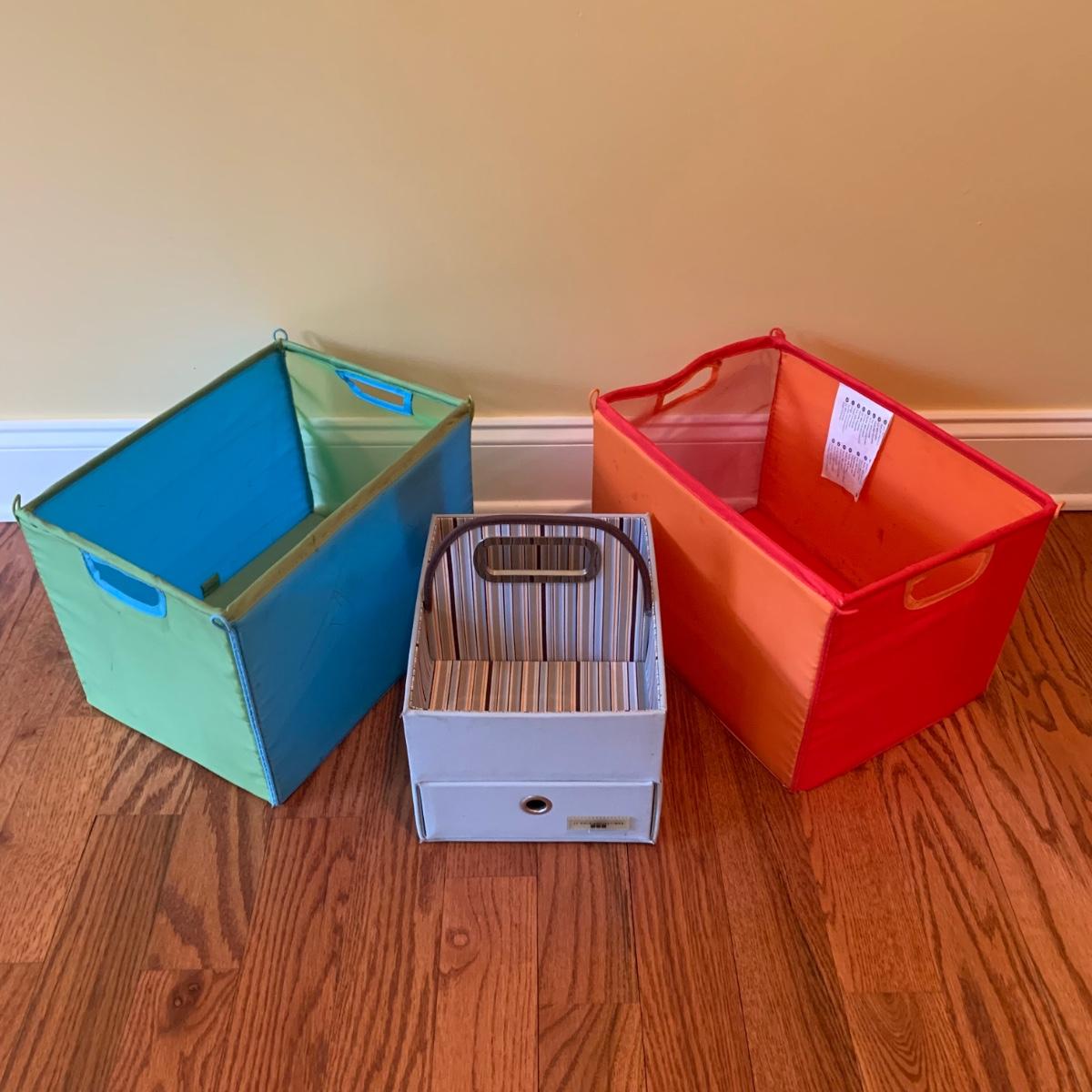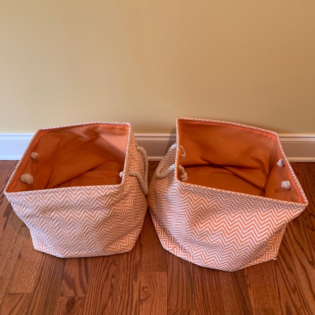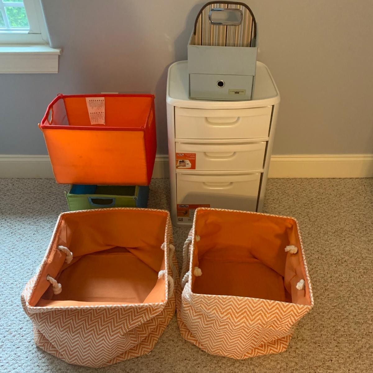 Variety of decorative storage containers includes two orange basket-like pieces, two collapsible containers, a Hefty drawer unit, and one table top organizer with small drawer. Please note, drawer set opens from both sides and measures 15.5” x 15” x 24”H. The blue and orange rectangular baskets show some signs of wear inside. Local pickup only.