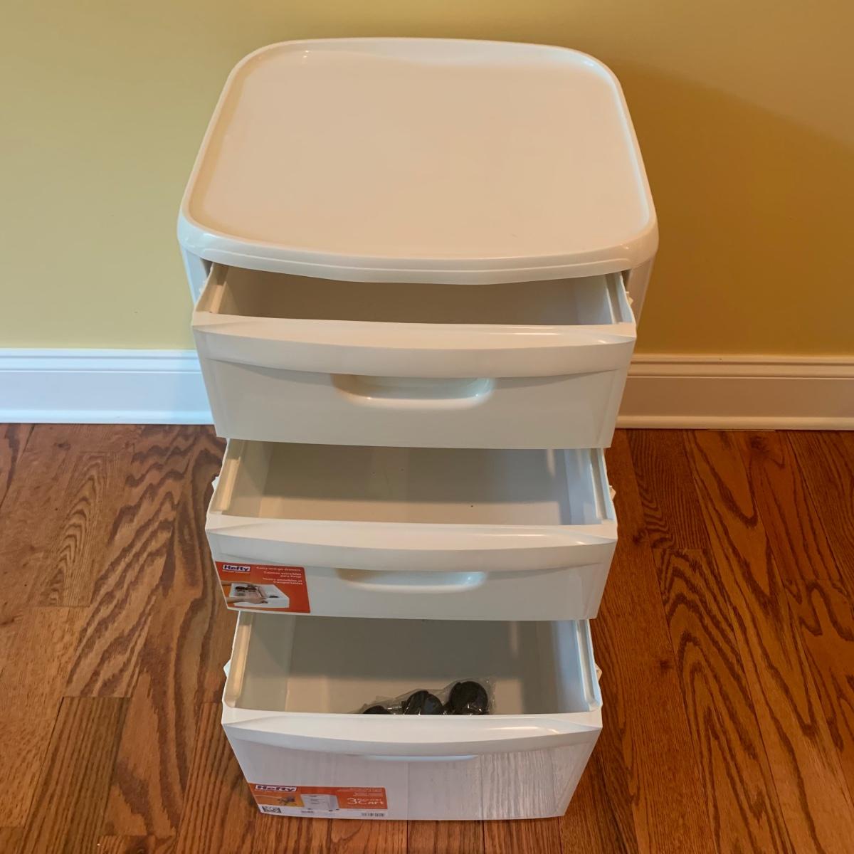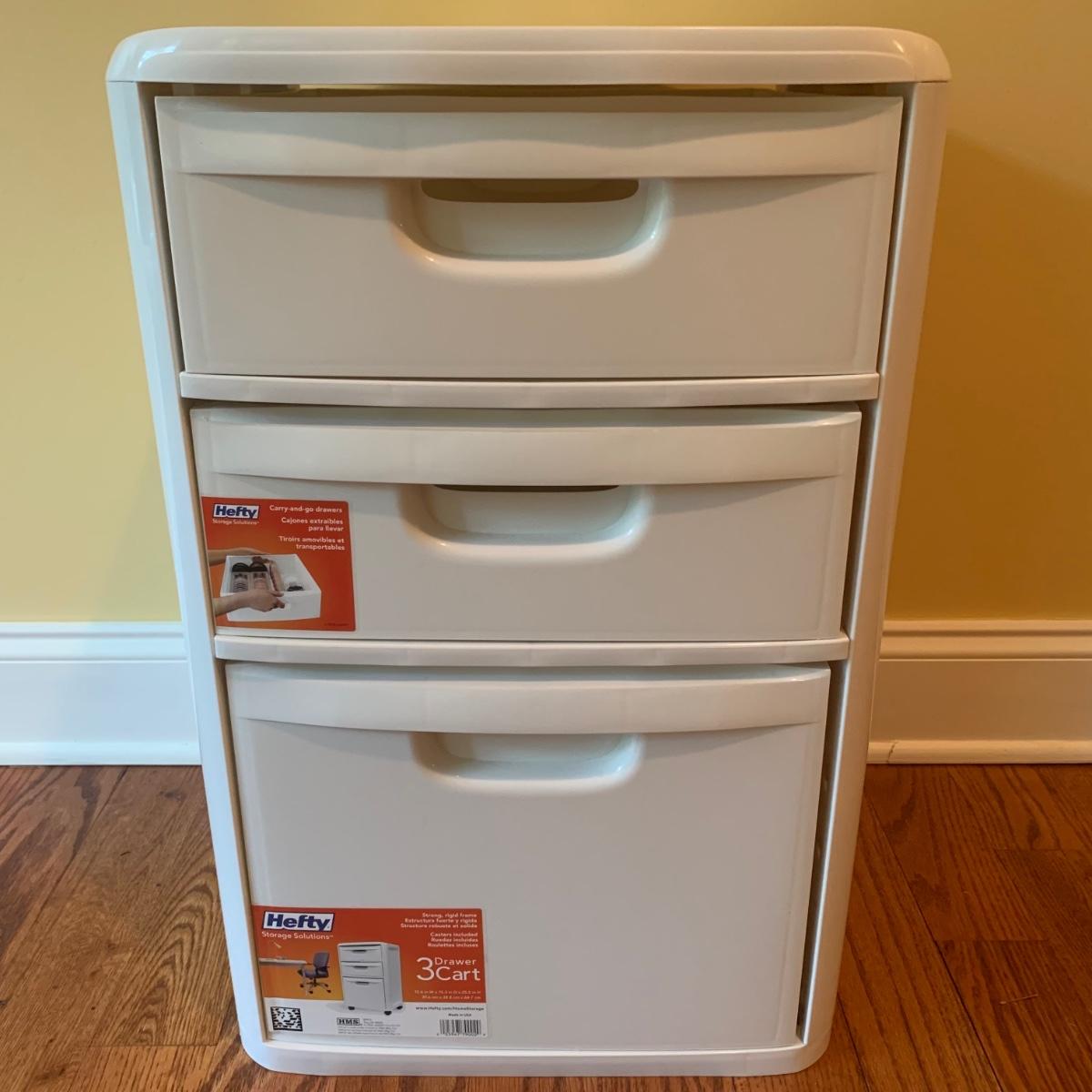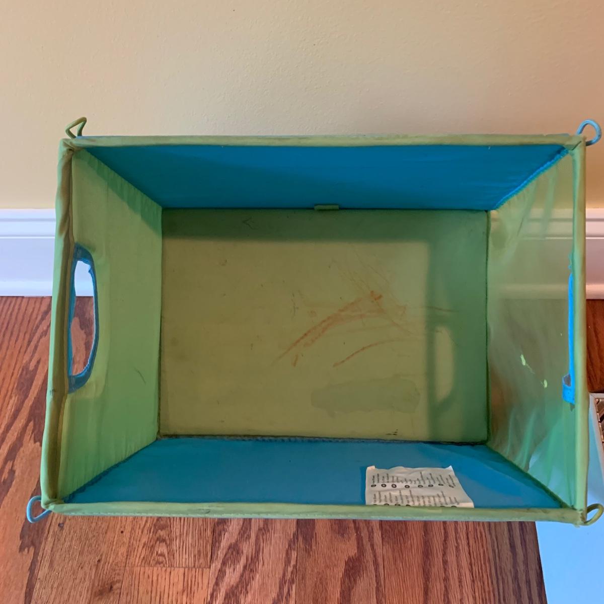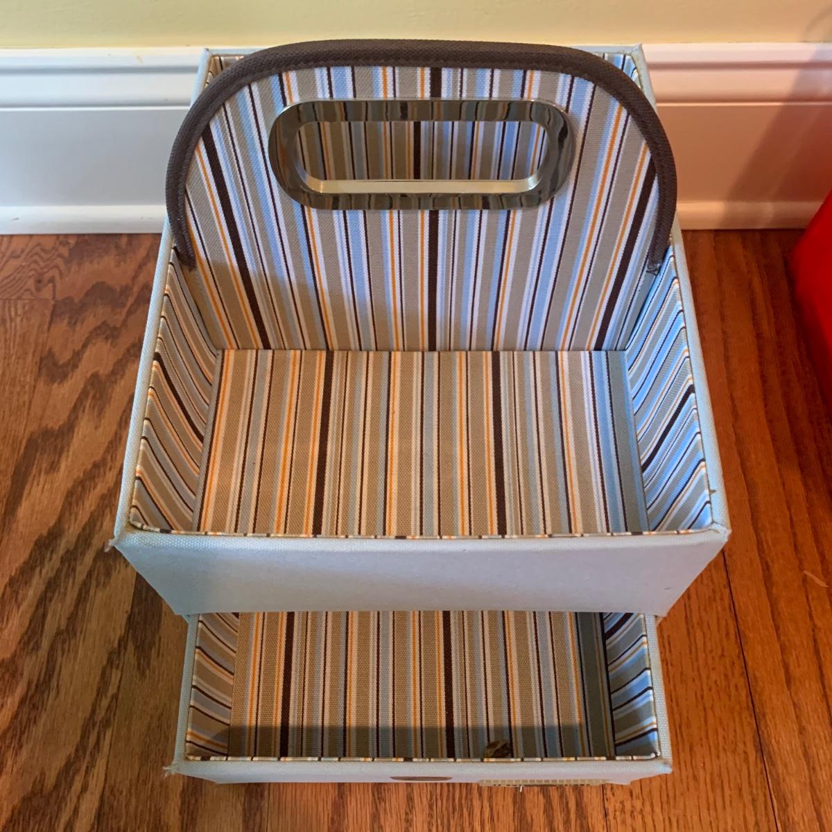 Variety of decorative storage containers includes two orange basket-like pieces, two collapsible containers, a Hefty drawer unit, and one table top organizer with small drawer. Please note, drawer set opens from both sides and measures 15.5” x 15” x 24”H. The blue and orange rectangular baskets show some signs of wear inside. Local pickup only.