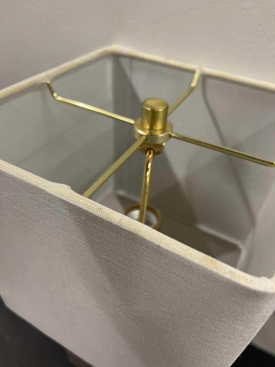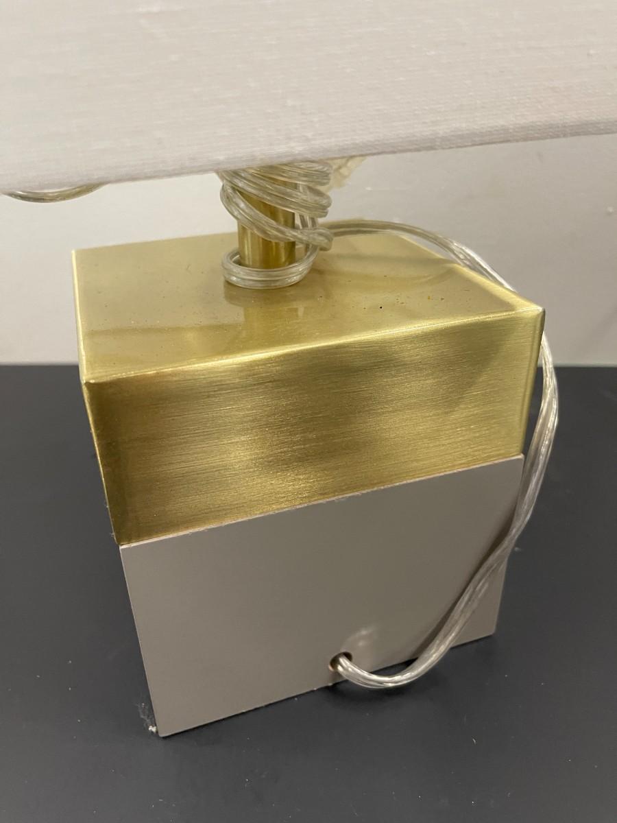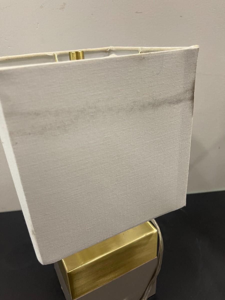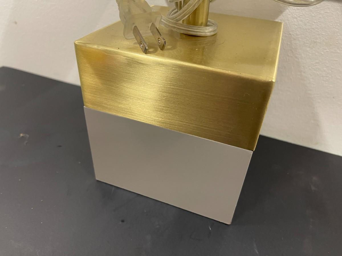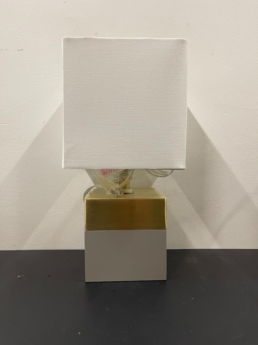 Square shaped, decorative table lamp has gray bottom and brass top. White square shade has some stains on it. Untested. Lamp is 5" x 5" x 14" high. Shade is 7" x 7"