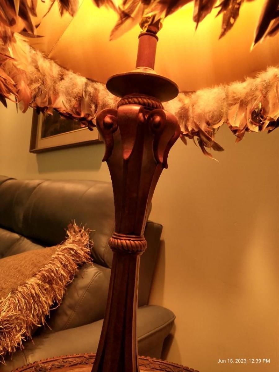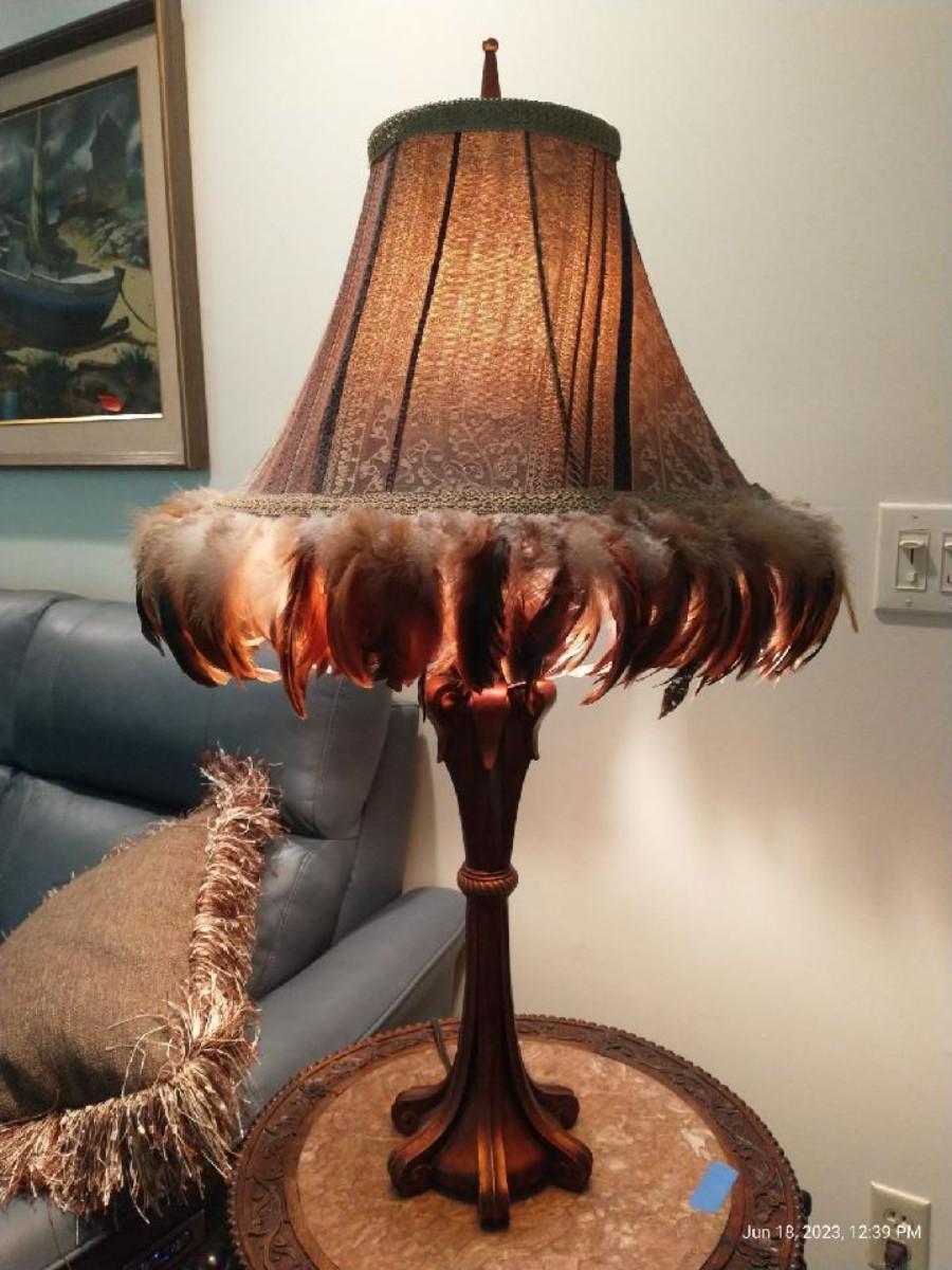 Decorative Table Top Lamp with Feather Accent Shade. Approx 35½" tall.