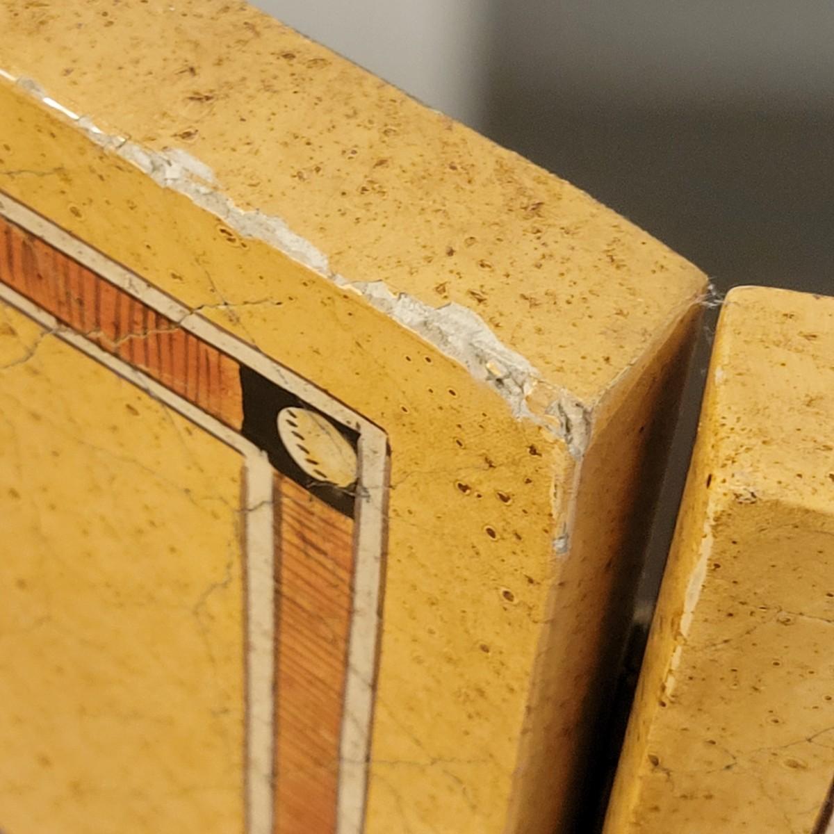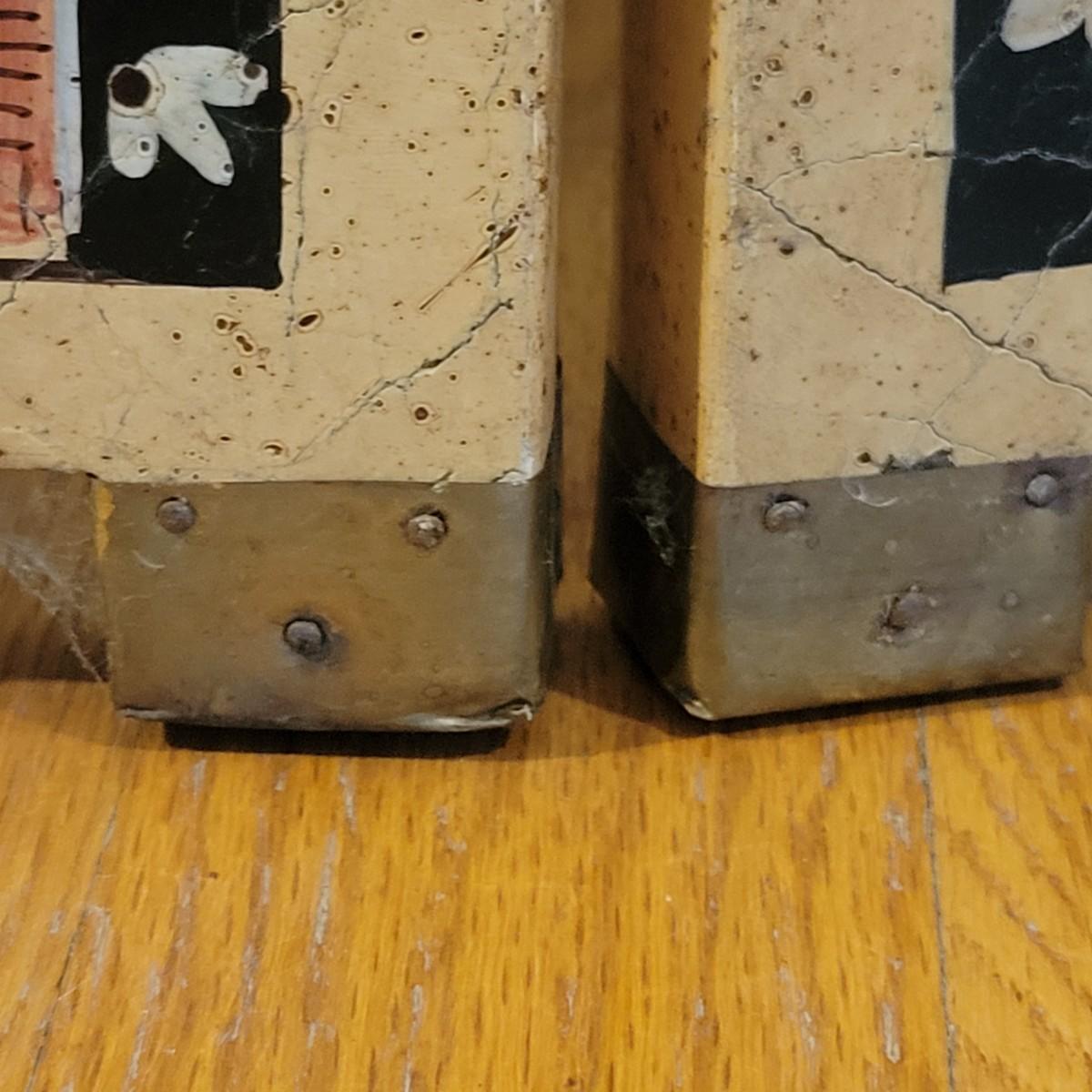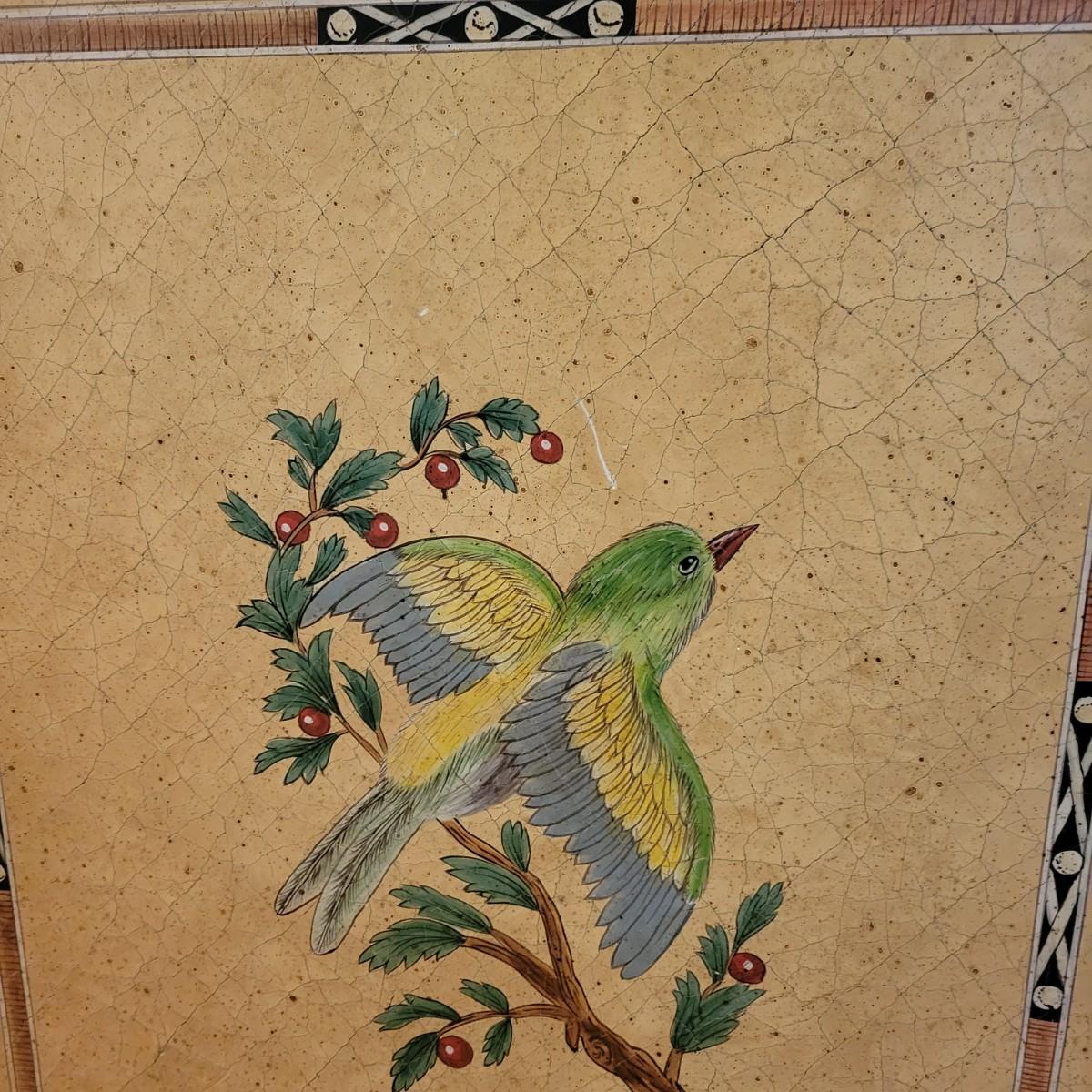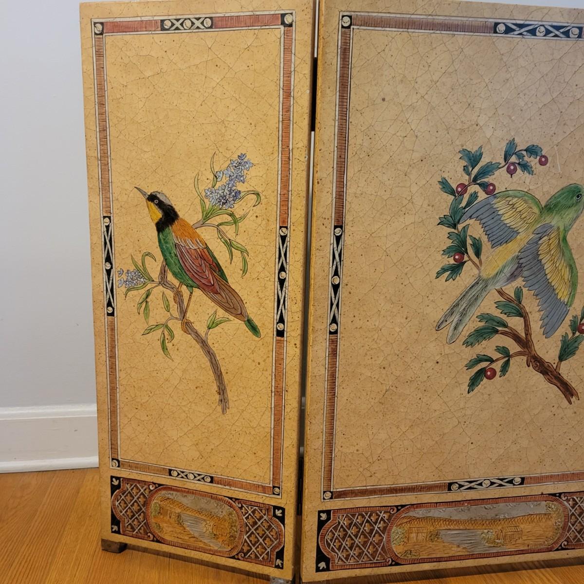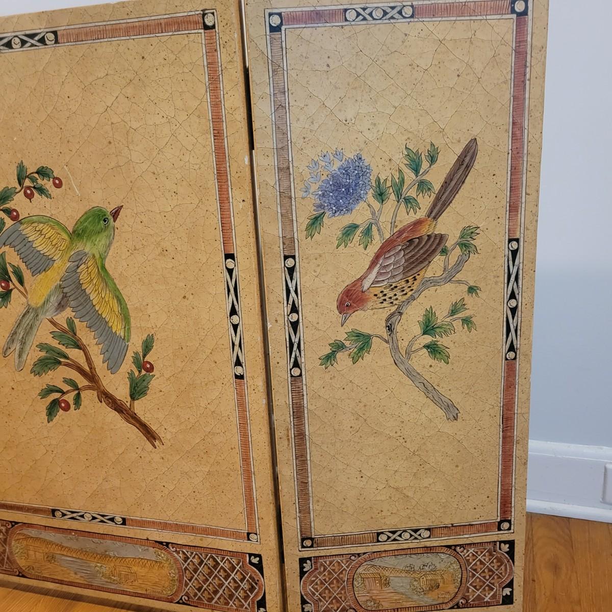Decorative three panel fire place screen with a bird motif, brass accented feet and made of lacquered wood. Screen is in good condition, but does show some minor chips on the edges of various panels. See attached pictures for more details. Screen measures approximately 45" x 31" x 1" Shipping available