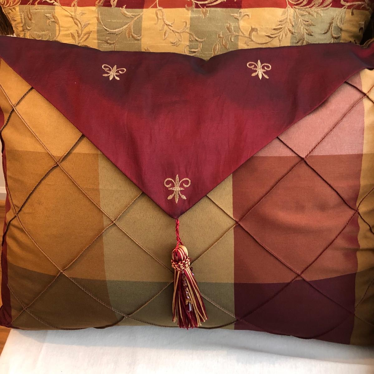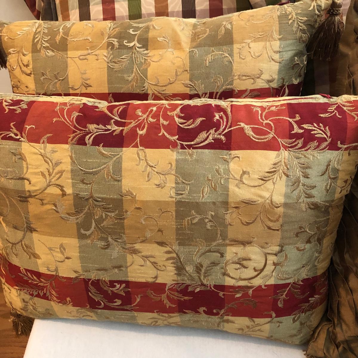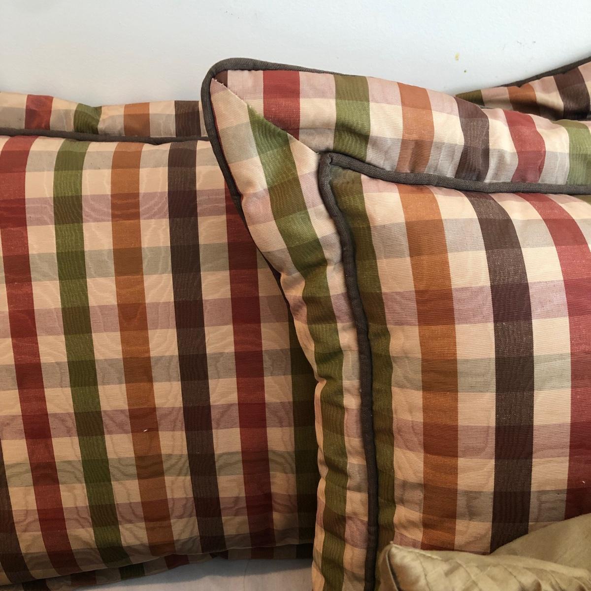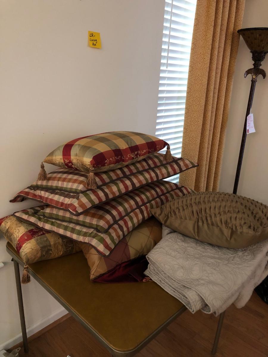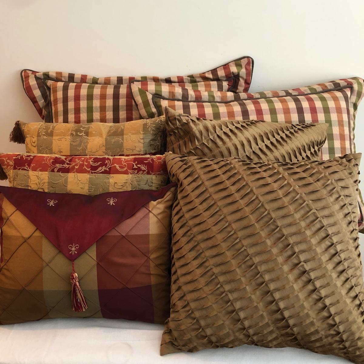 This lot includes seven decorative pillows with a Middleton greenish summer quilt that is for a full/queen bed. Two of the plaid pillows are pillow shams with a padded edge ((31.5” x 22.5”).