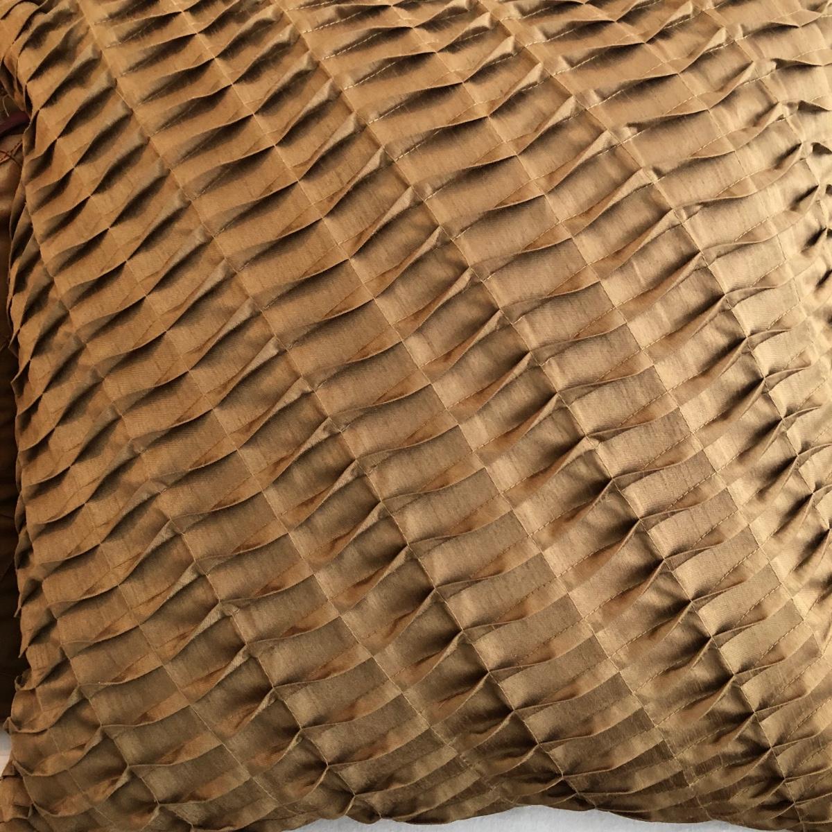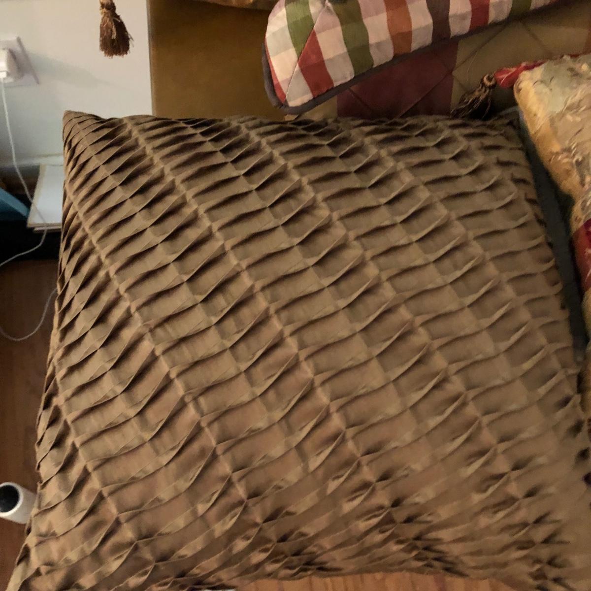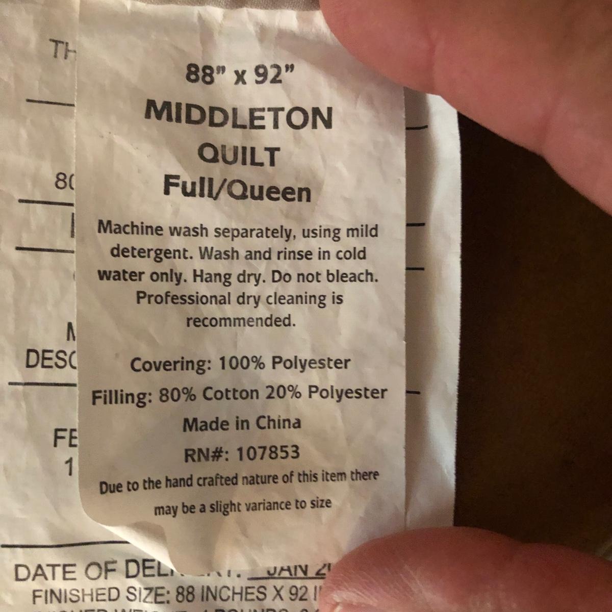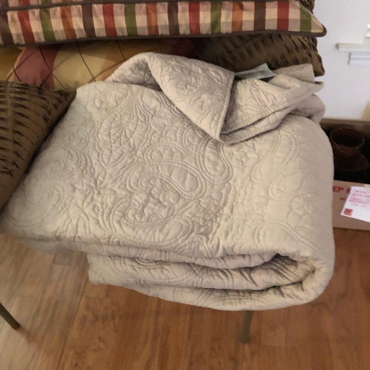 This lot includes seven decorative pillows with a Middleton greenish summer quilt that is for a full/queen bed. Two of the plaid pillows are pillow shams with a padded edge ((31.5” x 22.5”).