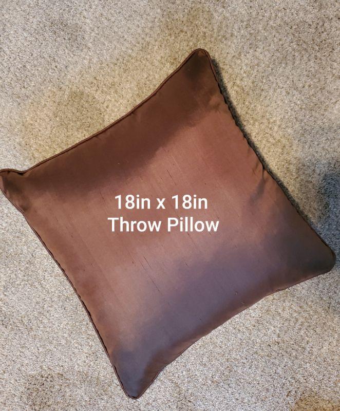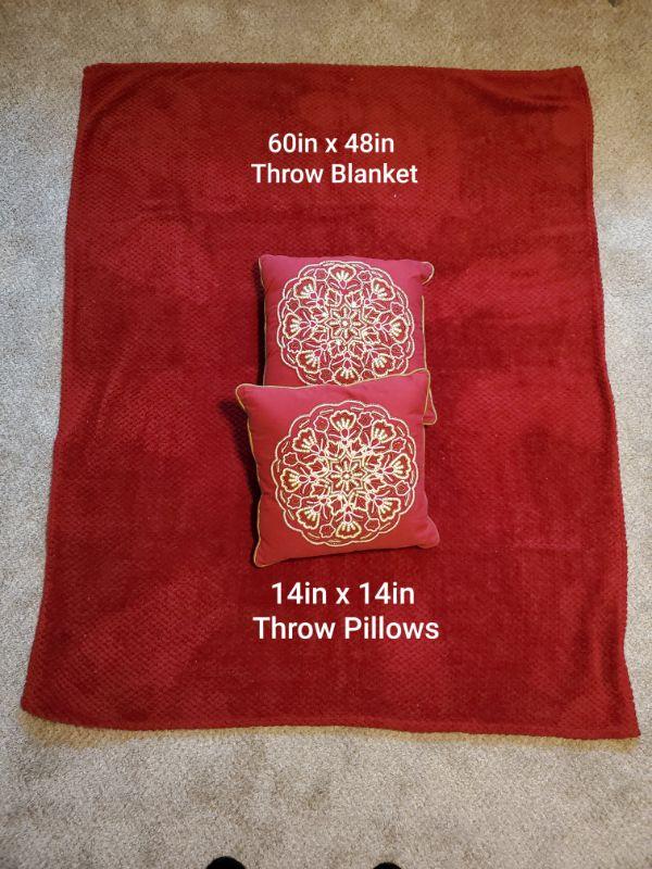 2 decorative throw pillows and one brown with throw blanket to match. Measurements on pictures.