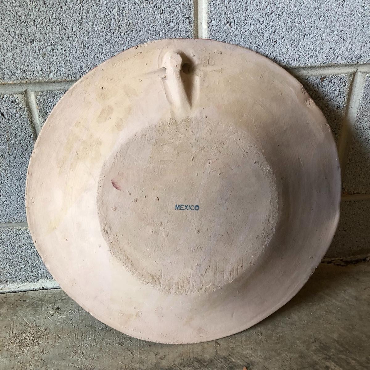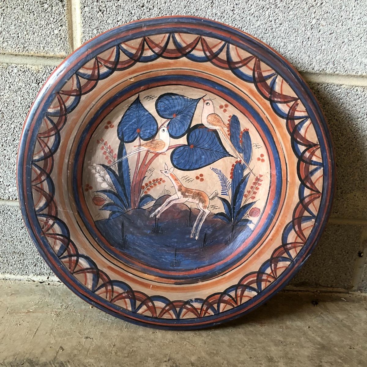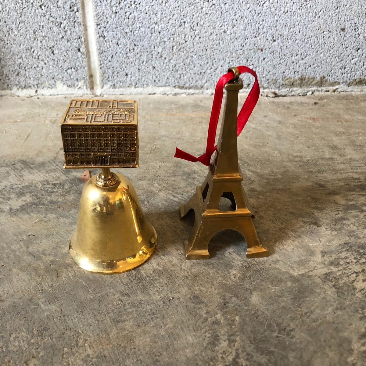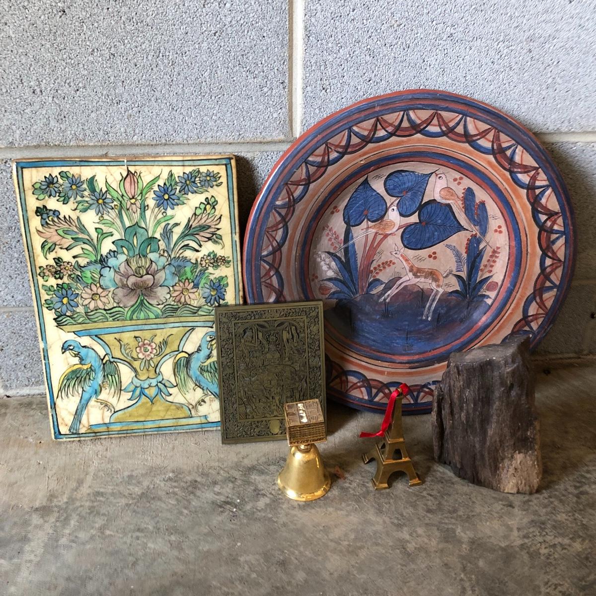 Lot includes decorative Mexican plate, decorative tile, English handmade wood print , petrified wood and a brass Eiffel Tower and Marshall Fields Bell. Plate measures 15.5”D.