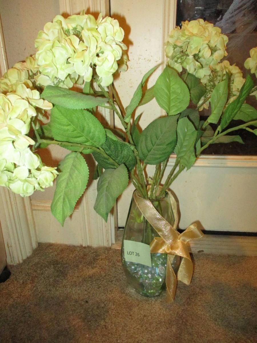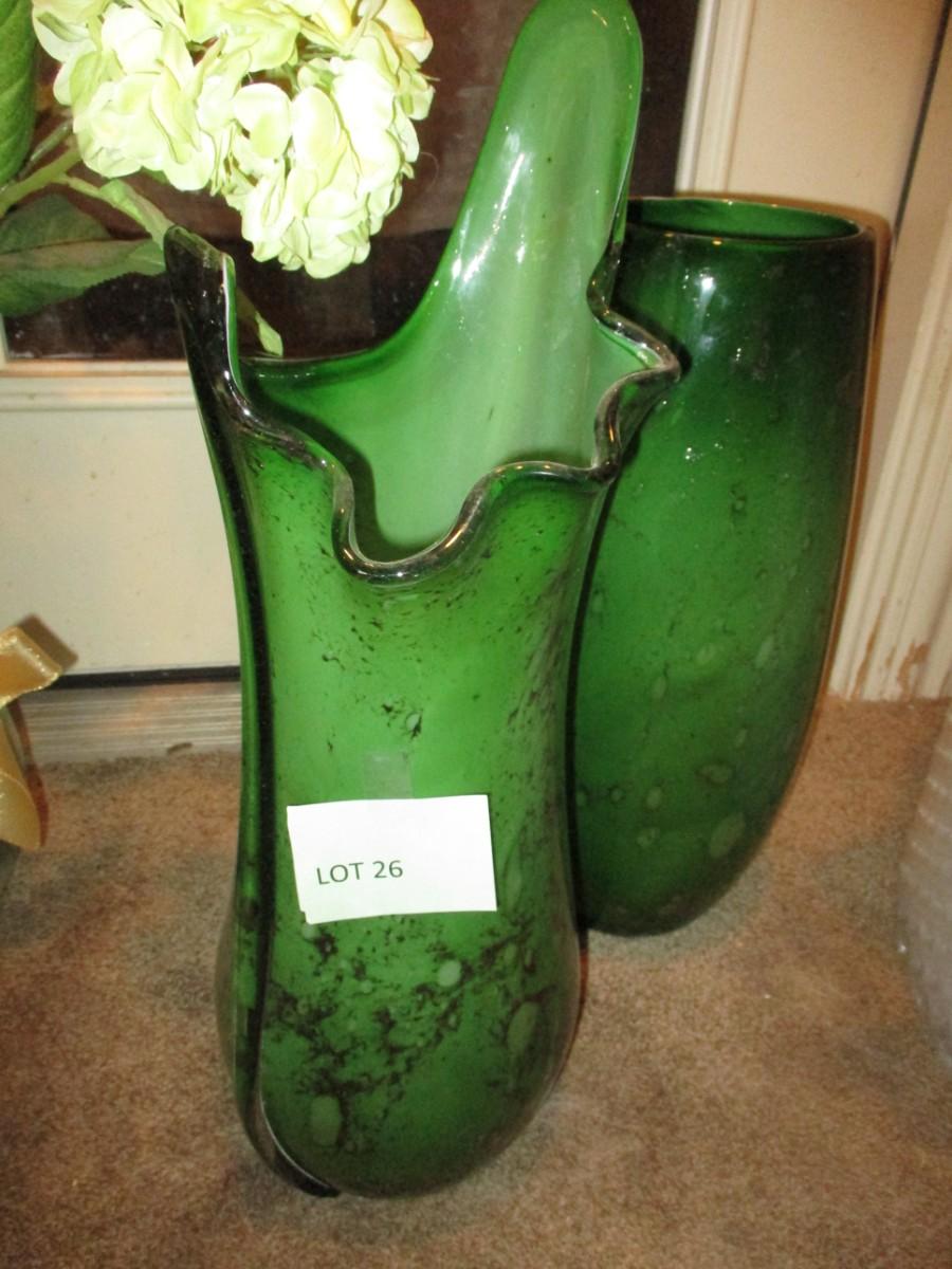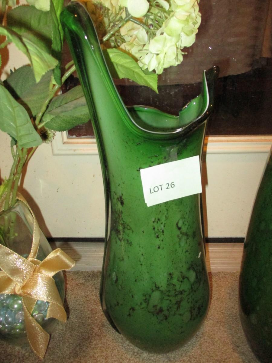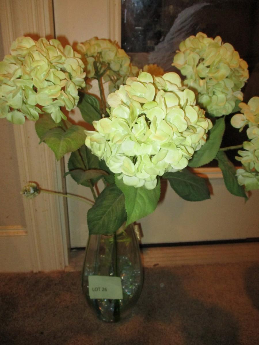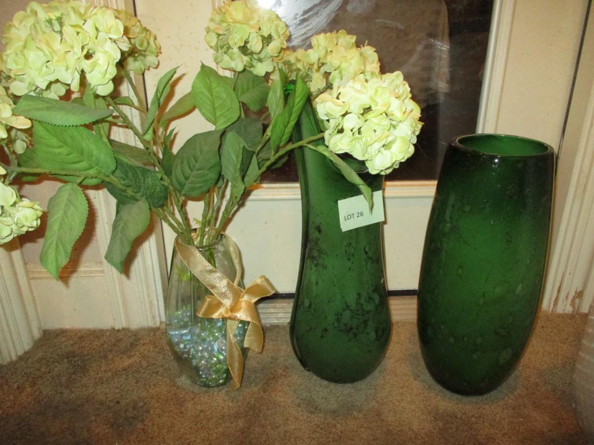 Large Decorative Vase. One Clear glass with Faux Hydrangeas. Two Green Blown Glass. Great condtion.