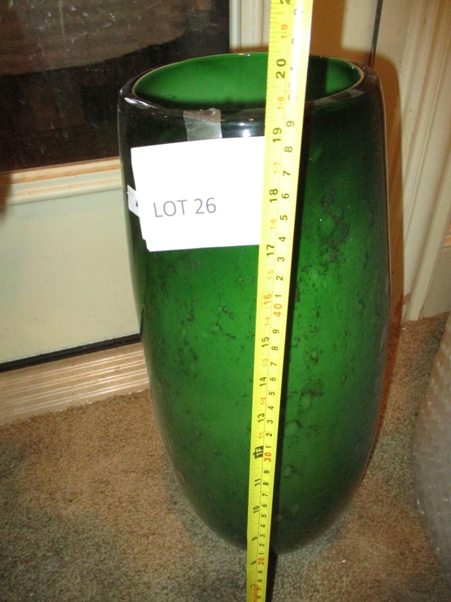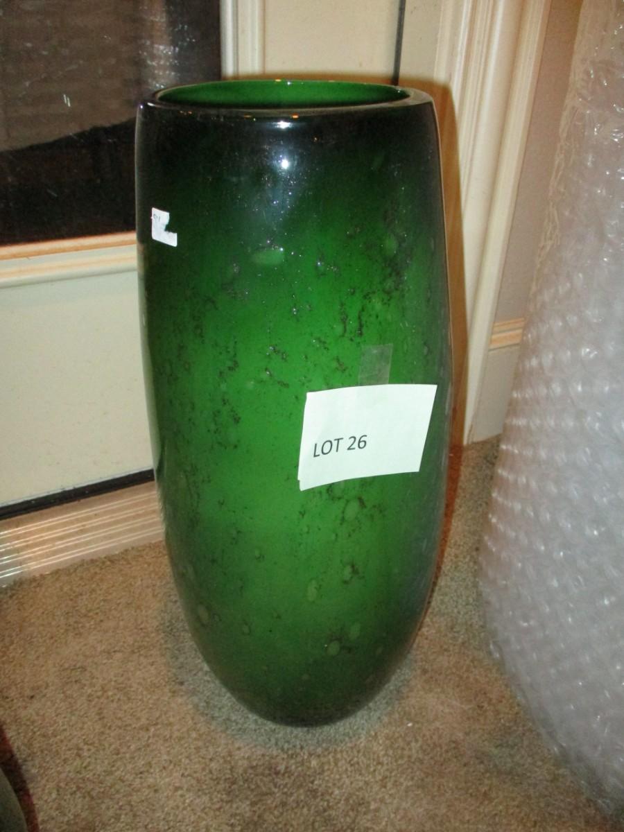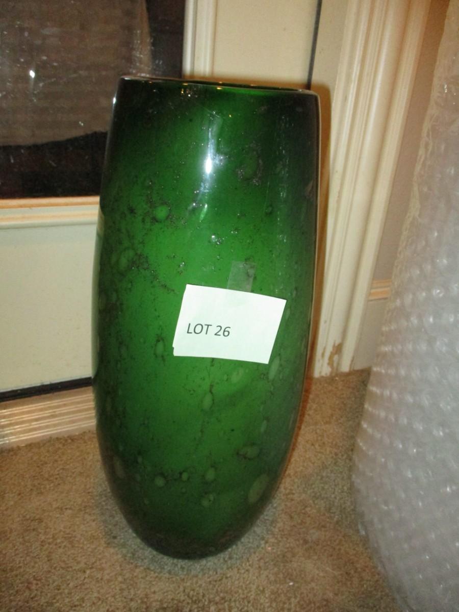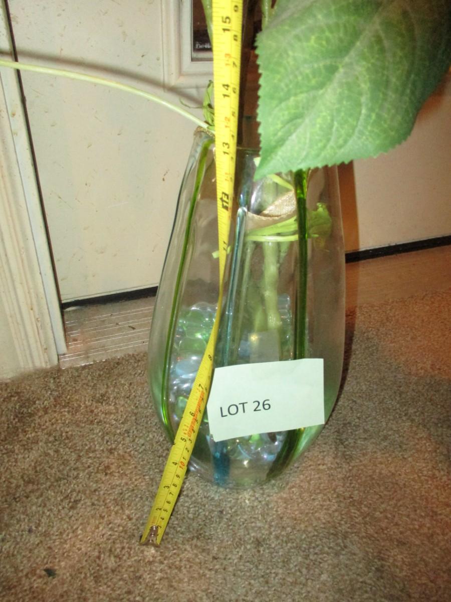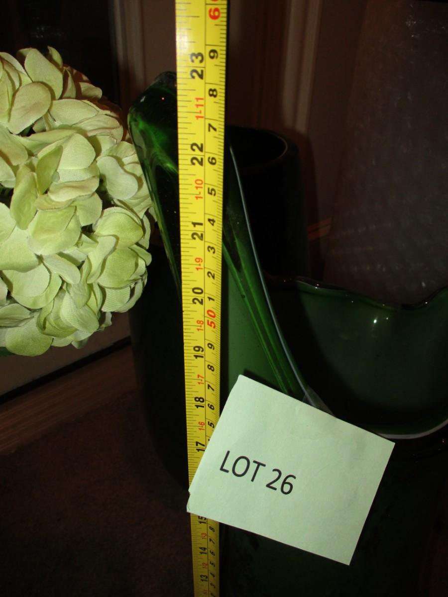 Large Decorative Vase. One Clear glass with Faux Hydrangeas. Two Green Blown Glass. Great condtion.
