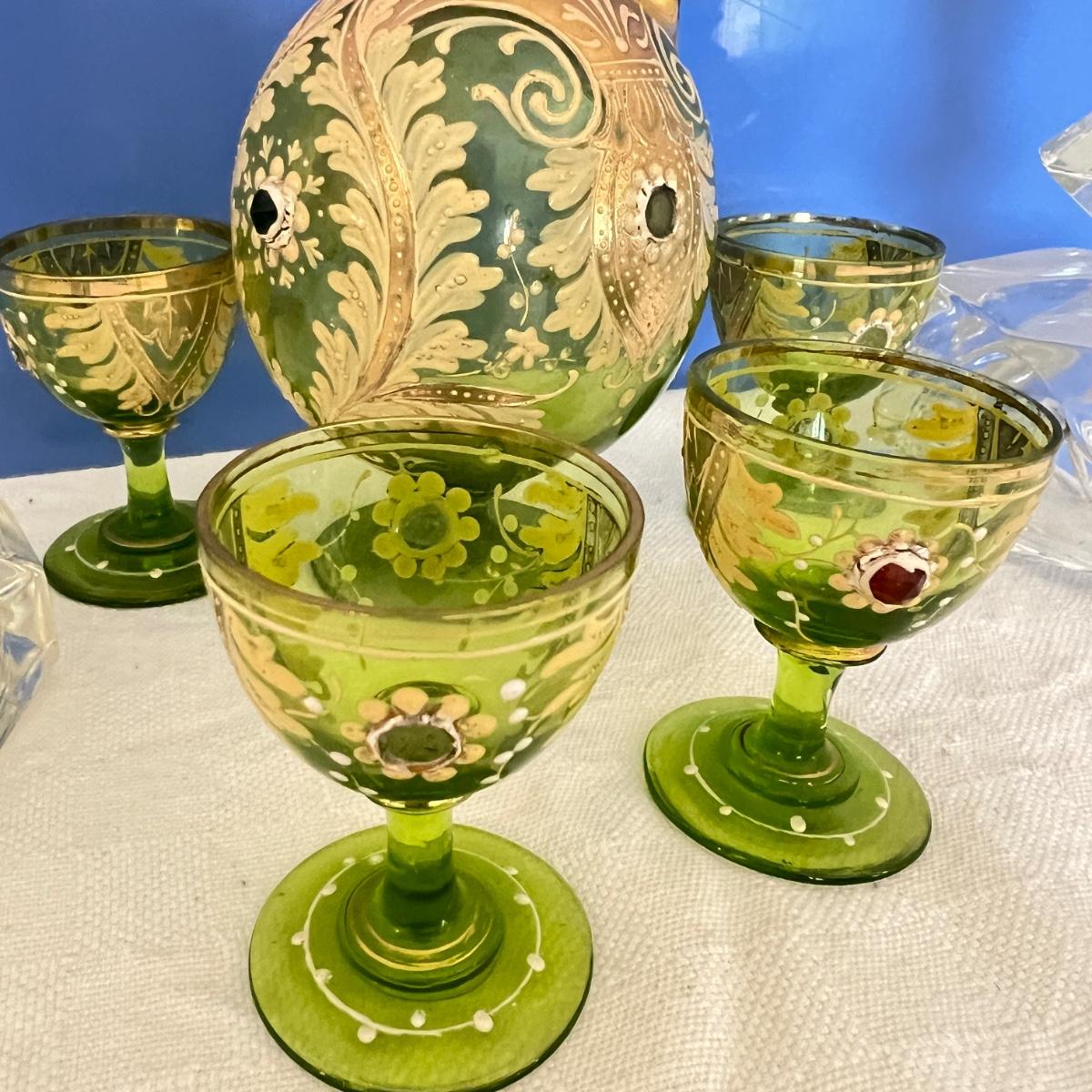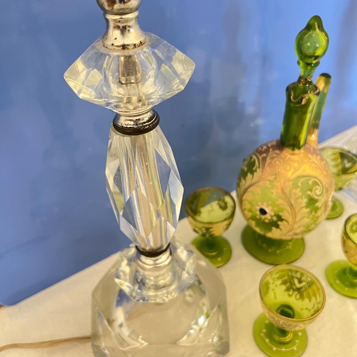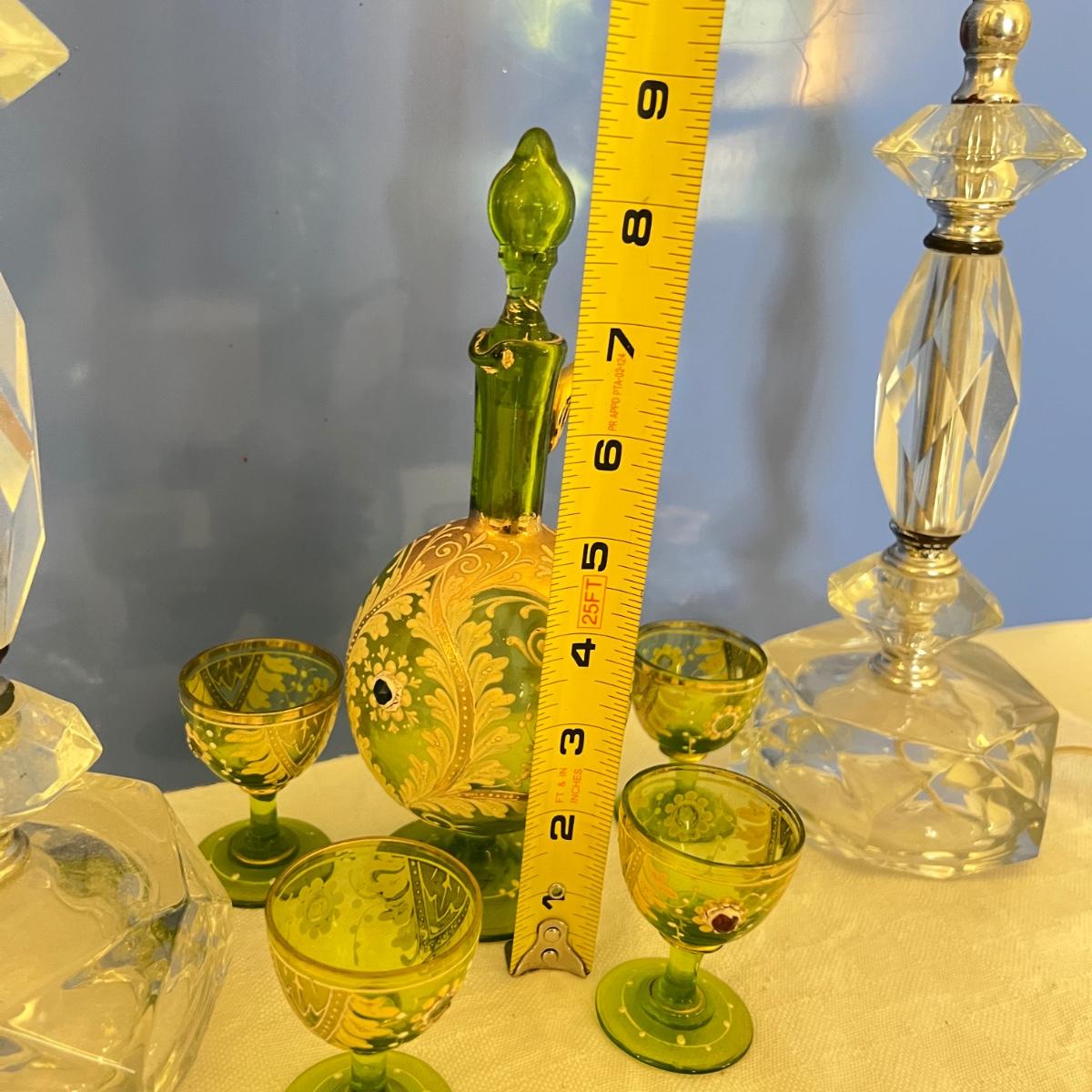 This is a lovely green blown glass green decanter and 4 cordial glass set. Sadly some of the gems are missing as shown in pics. The lamps are just as lovely, but need to be rewired as shown in pics.