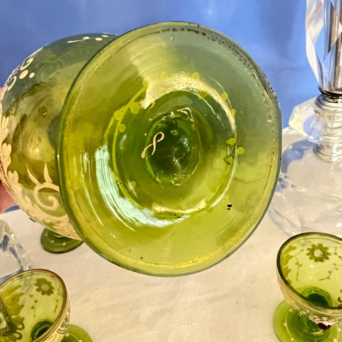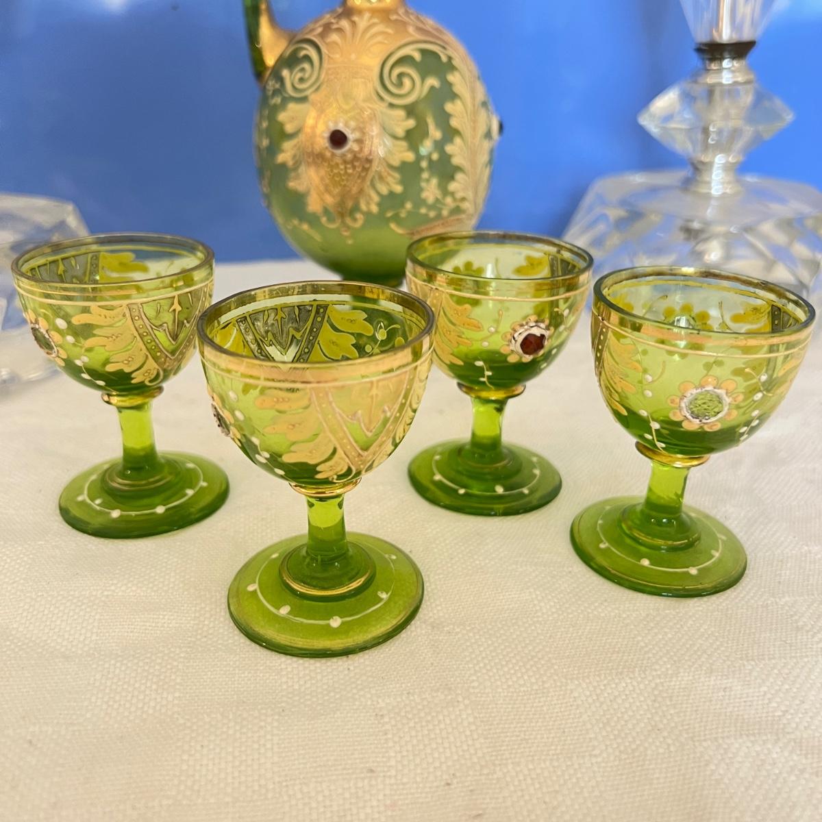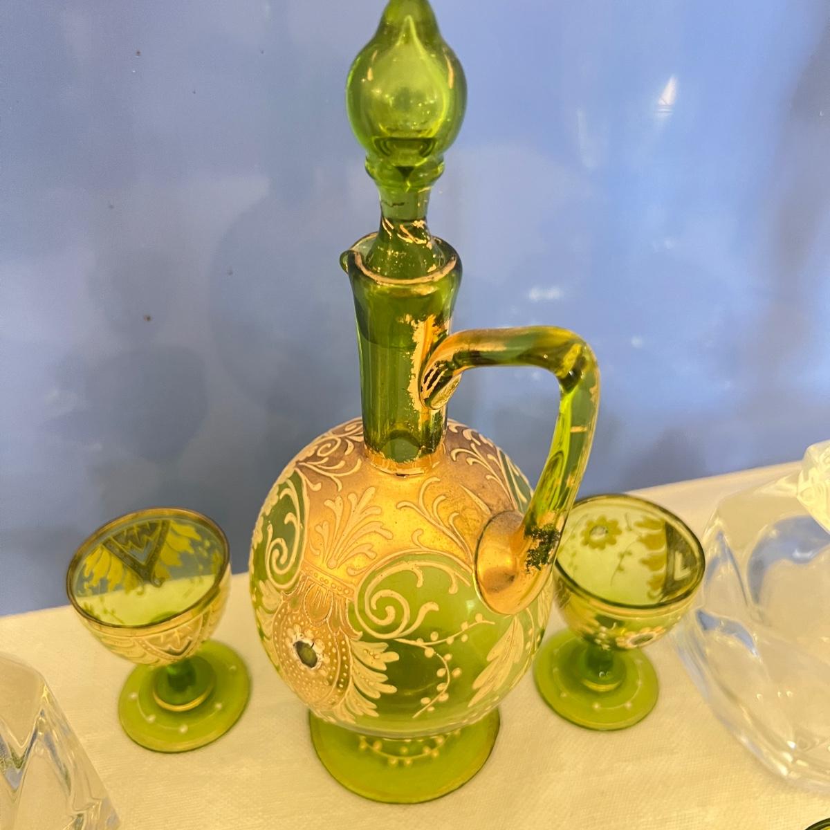 This is a lovely green blown glass green decanter and 4 cordial glass set. Sadly some of the gems are missing as shown in pics. The lamps are just as lovely, but need to be rewired as shown in pics.
