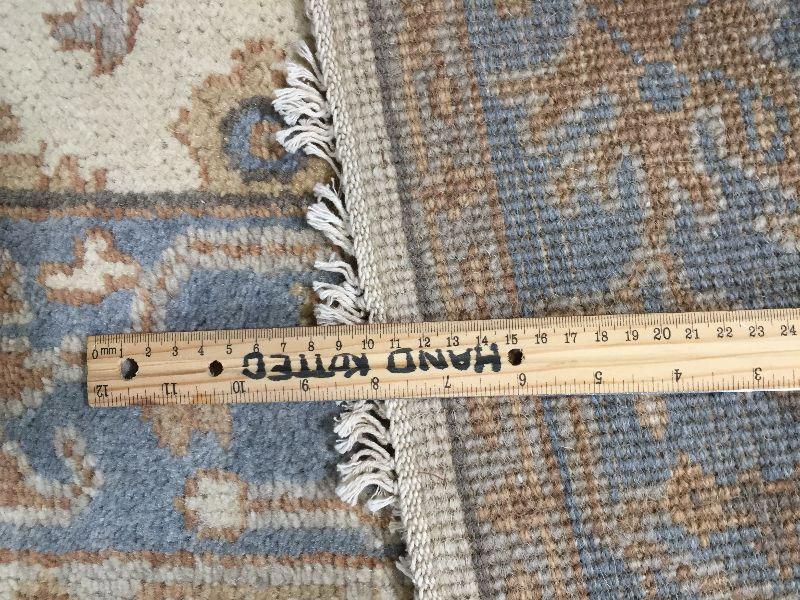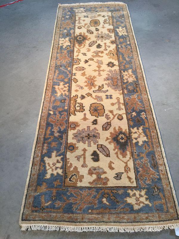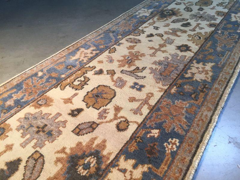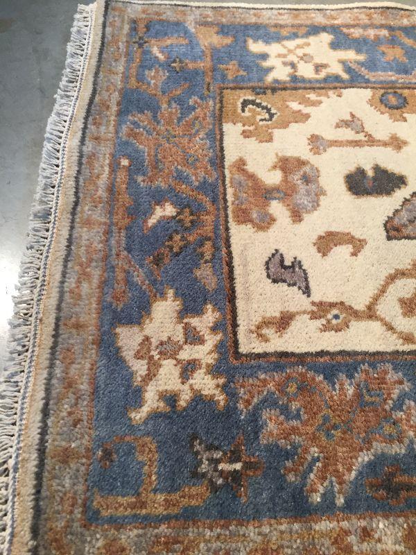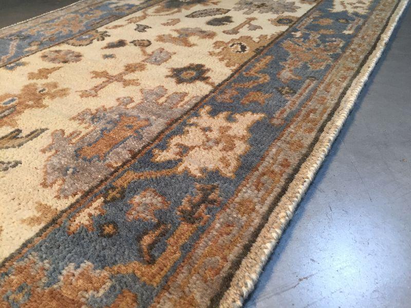 2 feet 6 inches X 7 Feet 5 inches Antique reproduction Oushak Rug Hand Knotted in natural veggie dye soft wool. 100% hand spun muted, Vintage look in soft blue, gold, ivory and multi accent colors Hand knotted in India.
