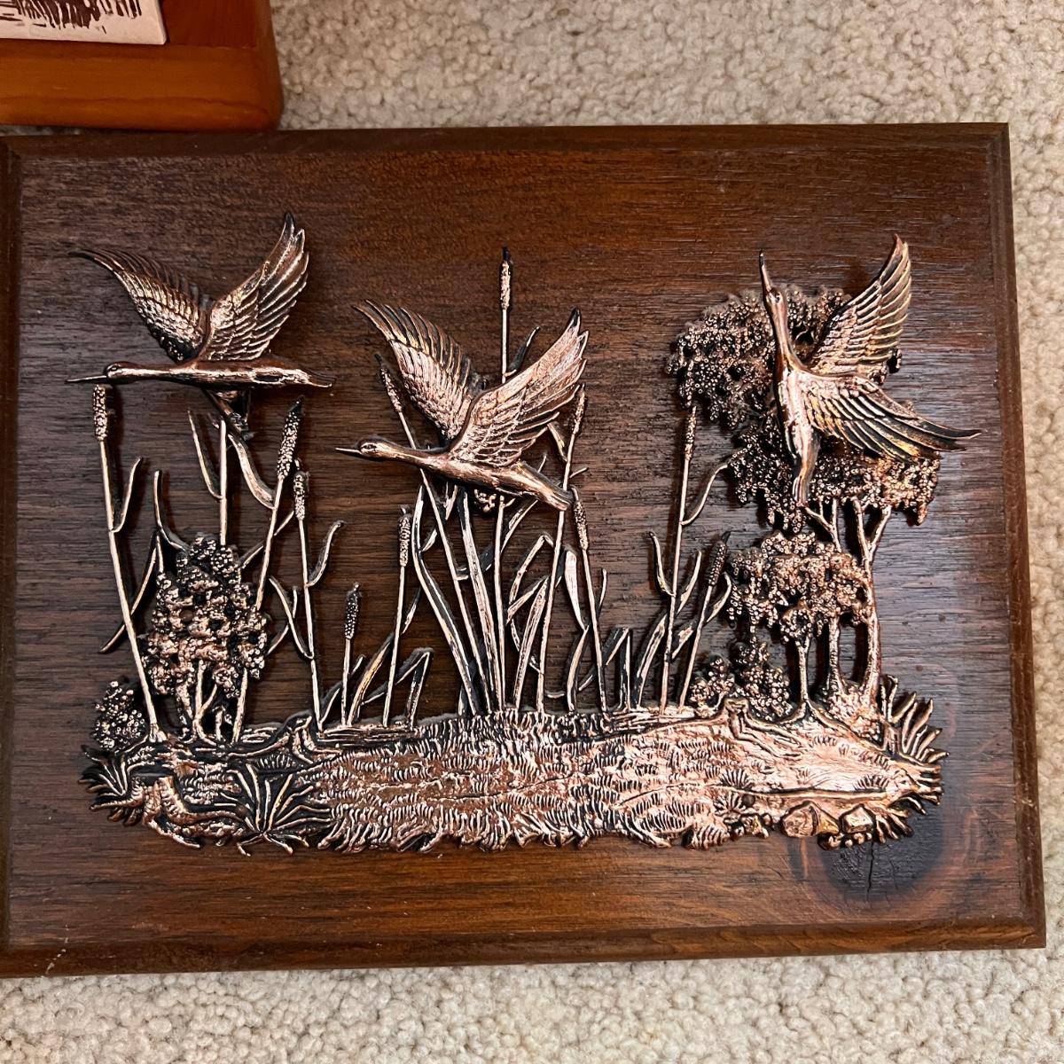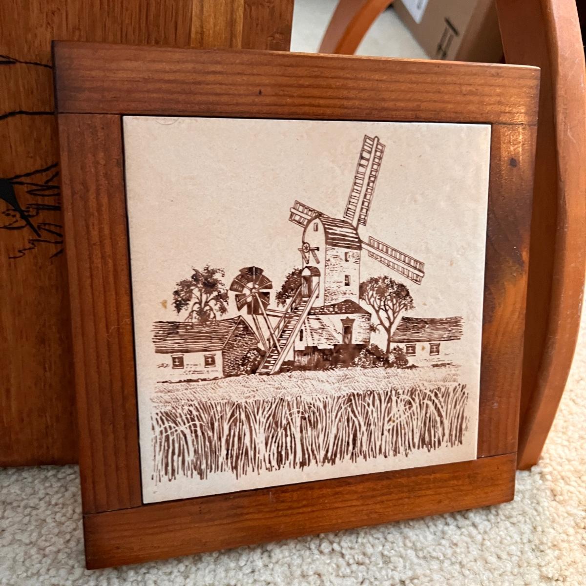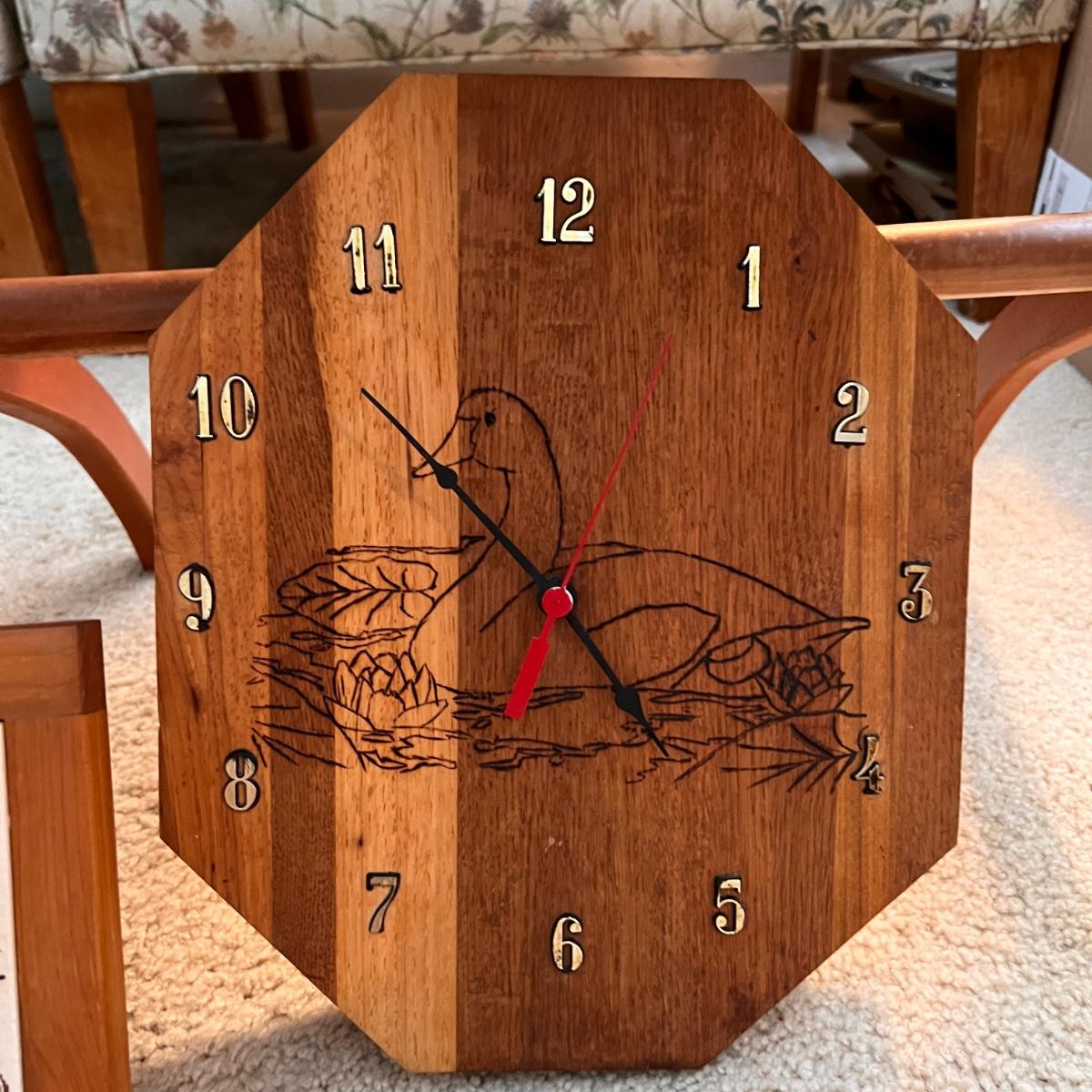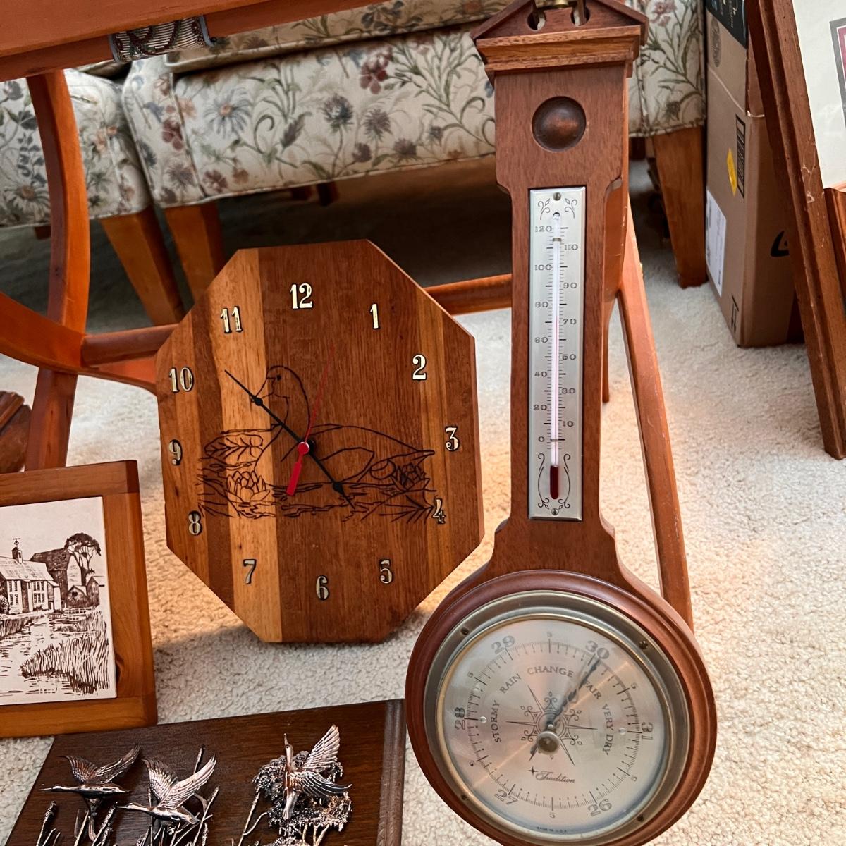 Carved butchers block duck clock (untested takes battery), MCM wooden tray on wood suitcase stand - some small scratches to the side), 2 wood framed ceramic hot plates, 2 3D metal duck art on wood, colonial style barometer.