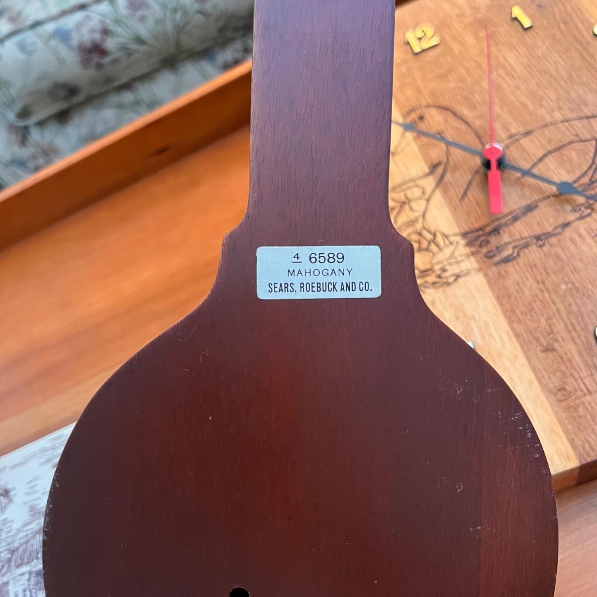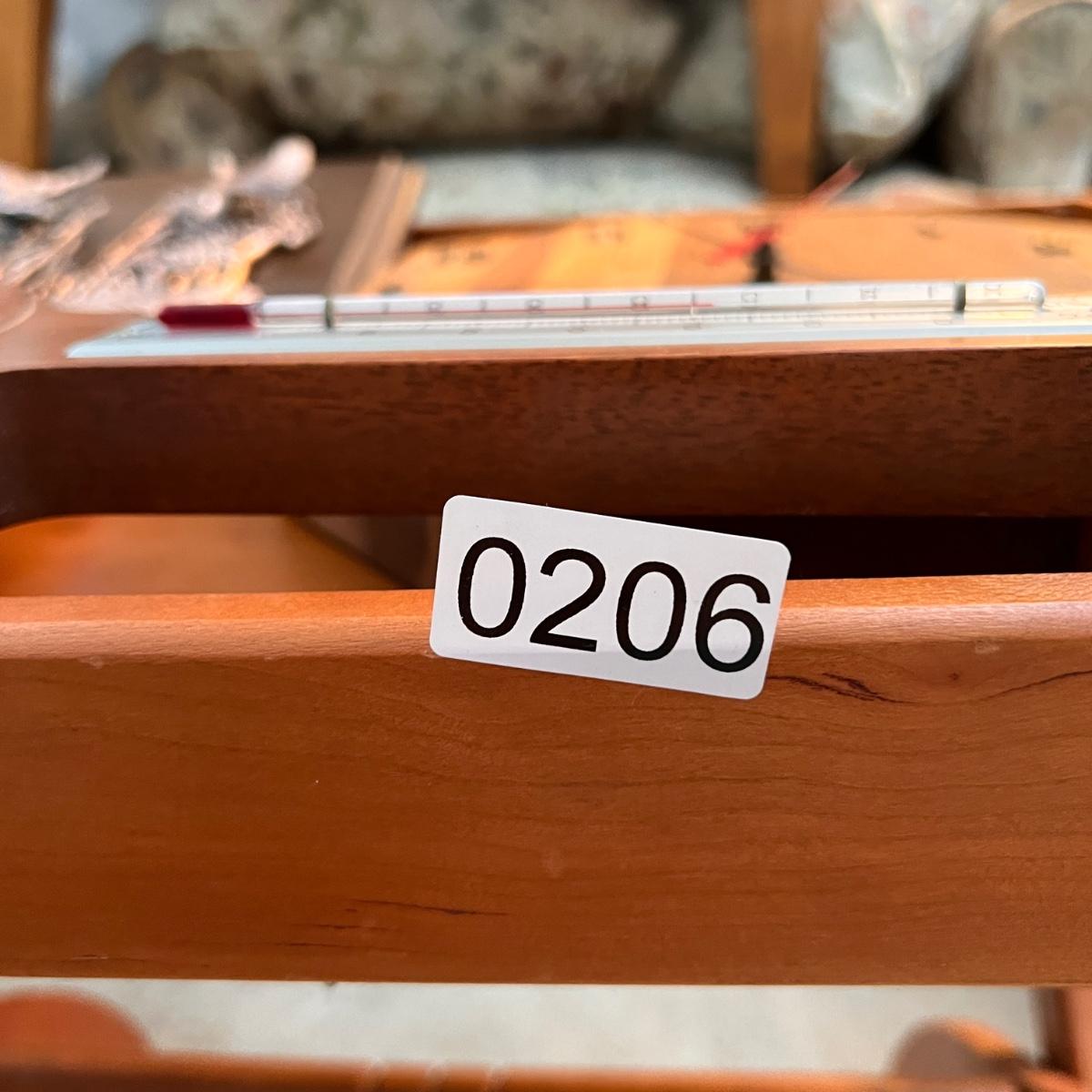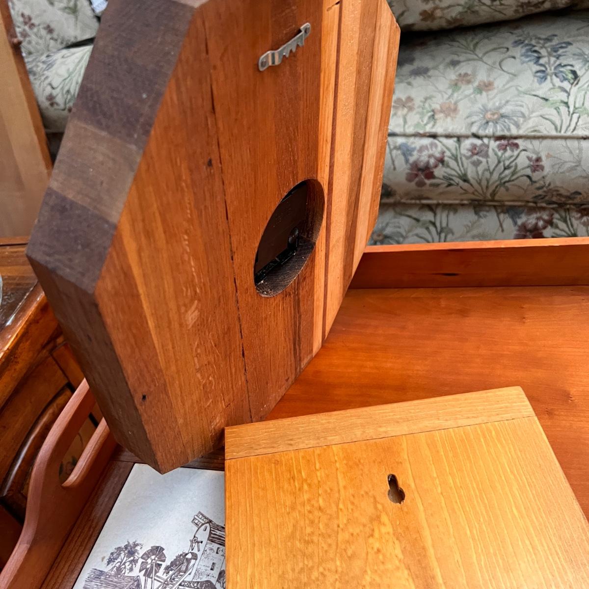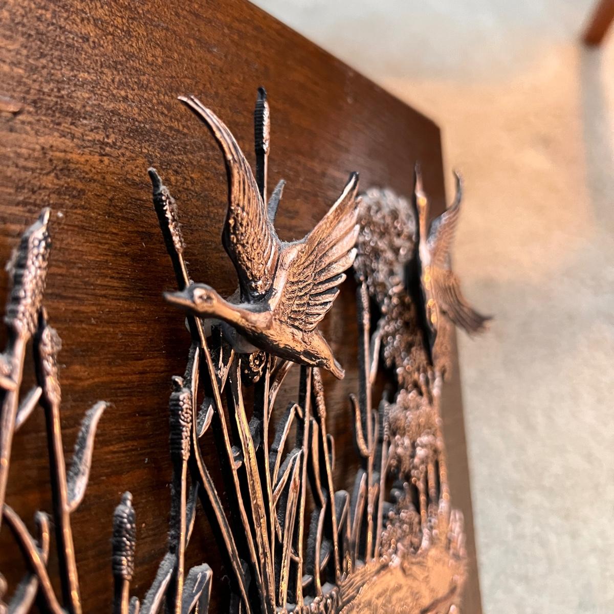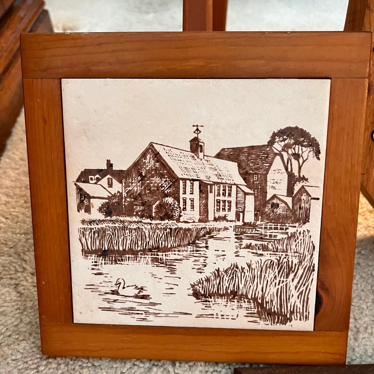 Carved butchers block duck clock (untested takes battery), MCM wooden tray on wood suitcase stand - some small scratches to the side), 2 wood framed ceramic hot plates, 2 3D metal duck art on wood, colonial style barometer.