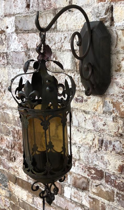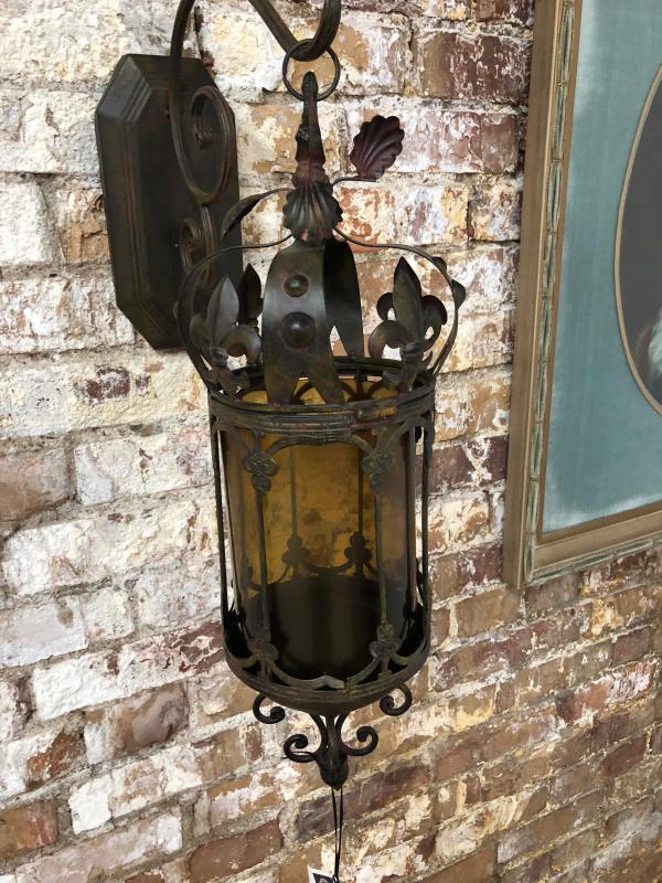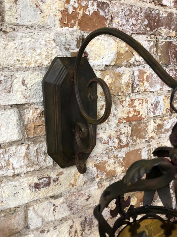 Sconce is in un-used condition, decorative iron work, amber glass, measures 18" tall.