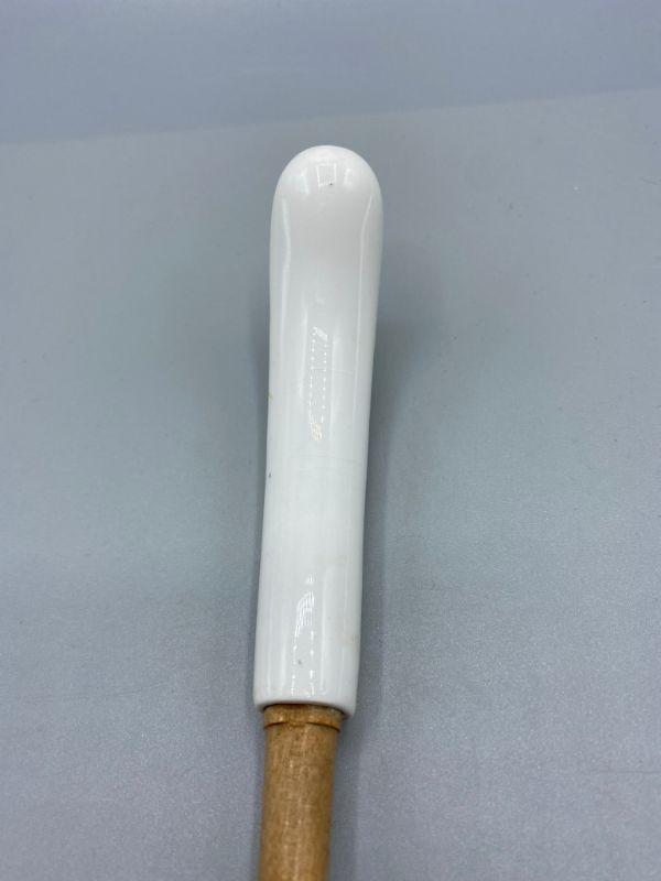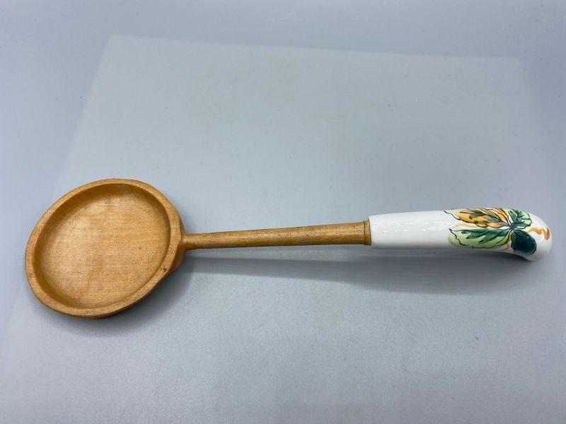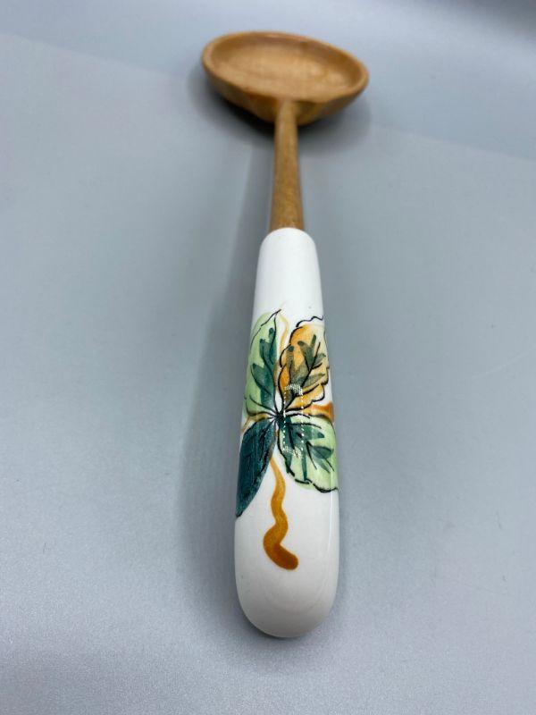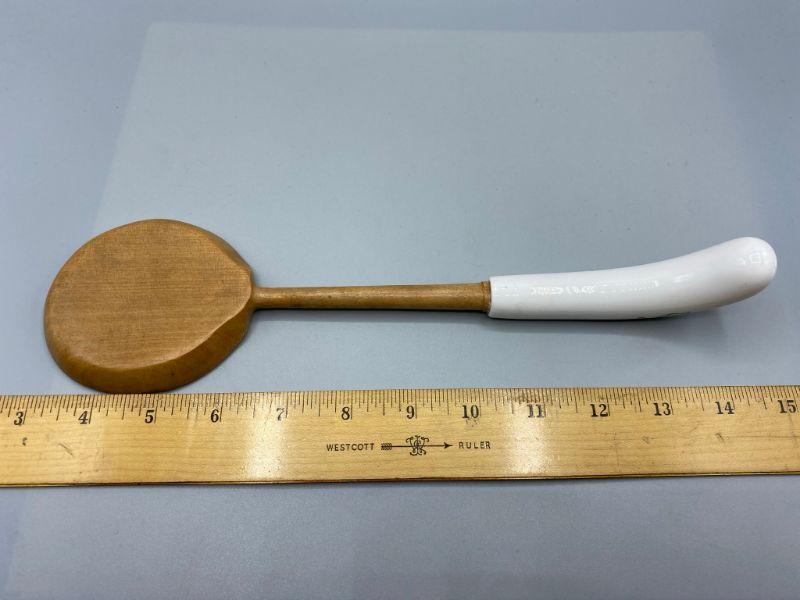 Decorative wide wood spoon with a ceramic handle. Handle has a painted leaf image on it. Measures about 12". Slight crazing.