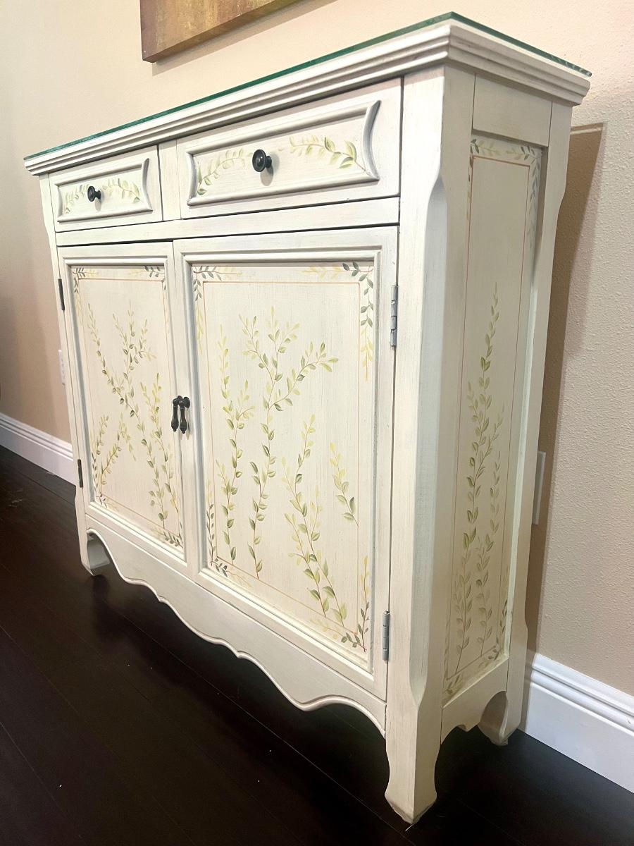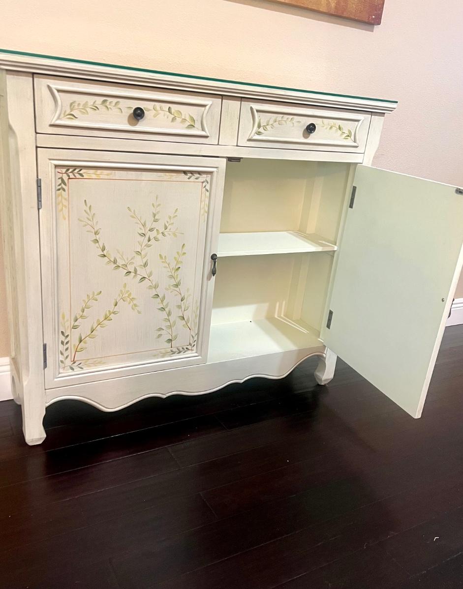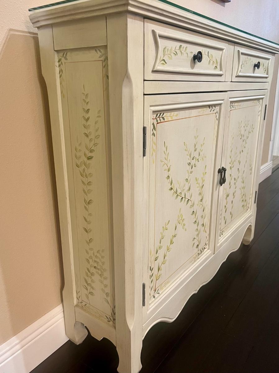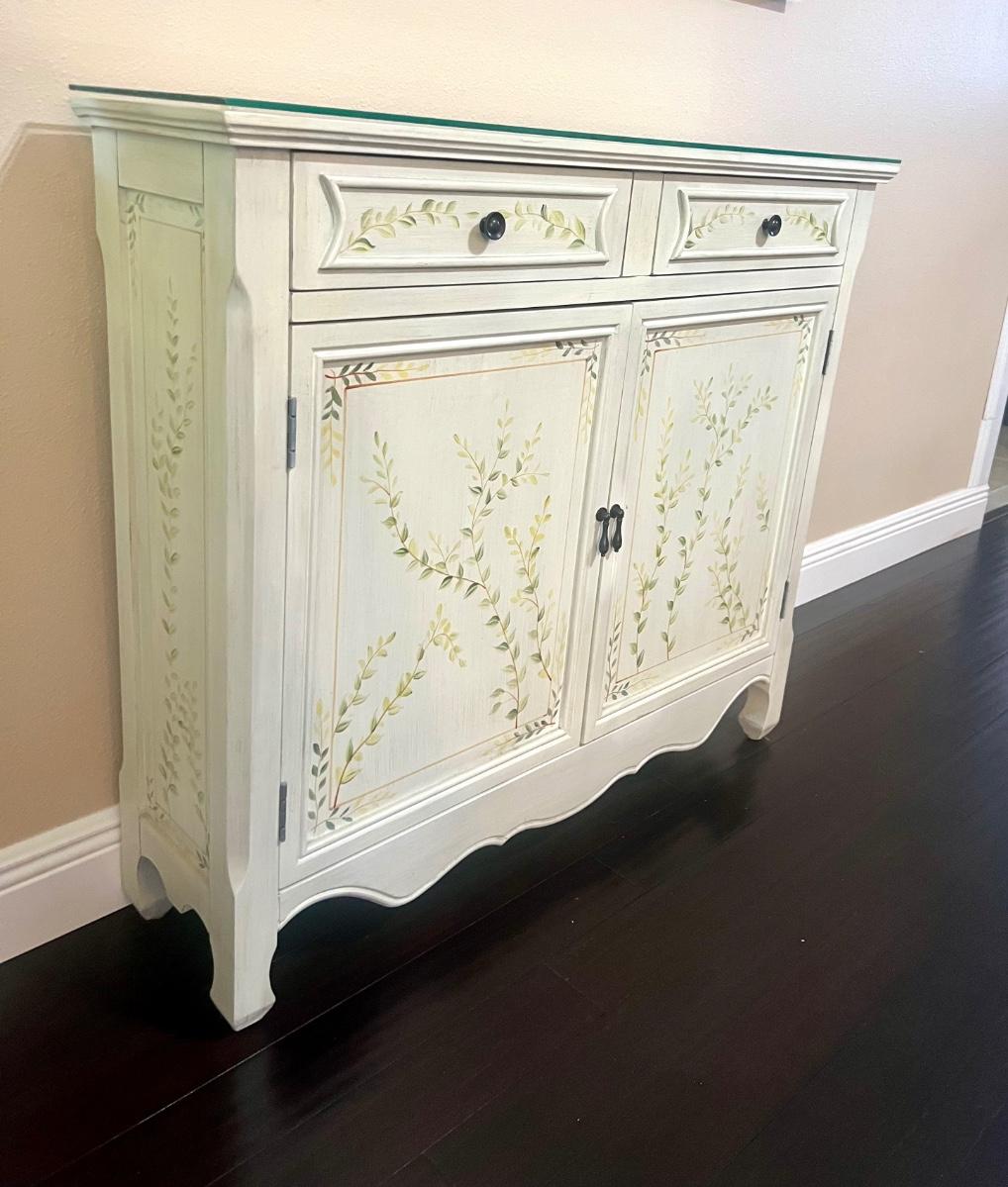 Decorative wooden cabinet. Top drawers are felt lined. Please see all pictures. Measures 41” W x 11”D x 36”T