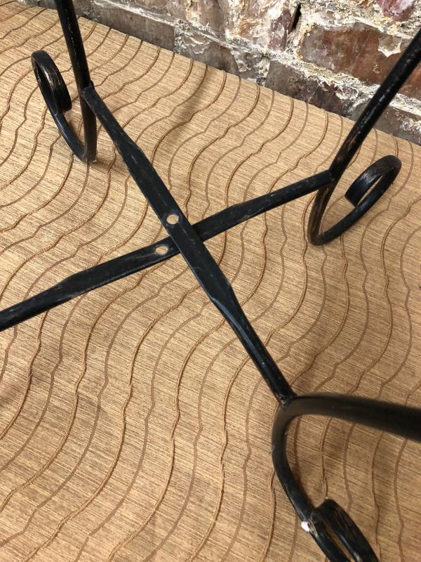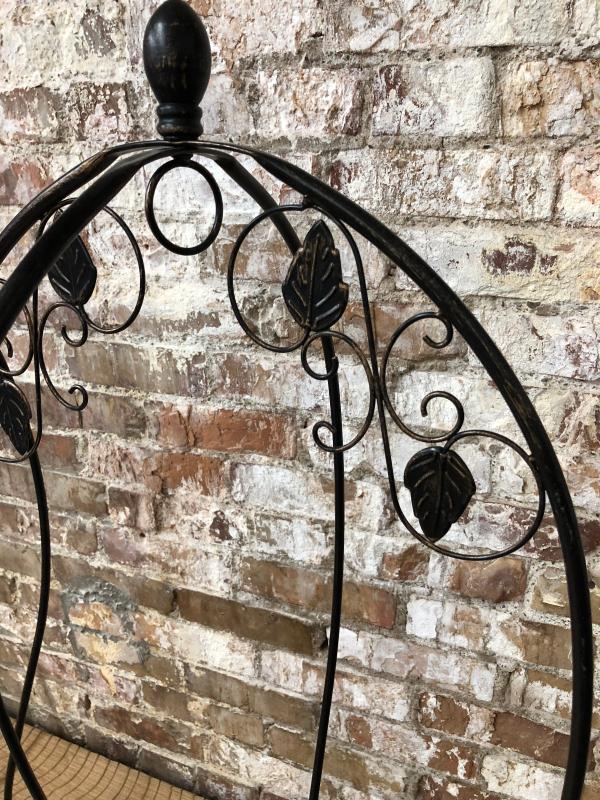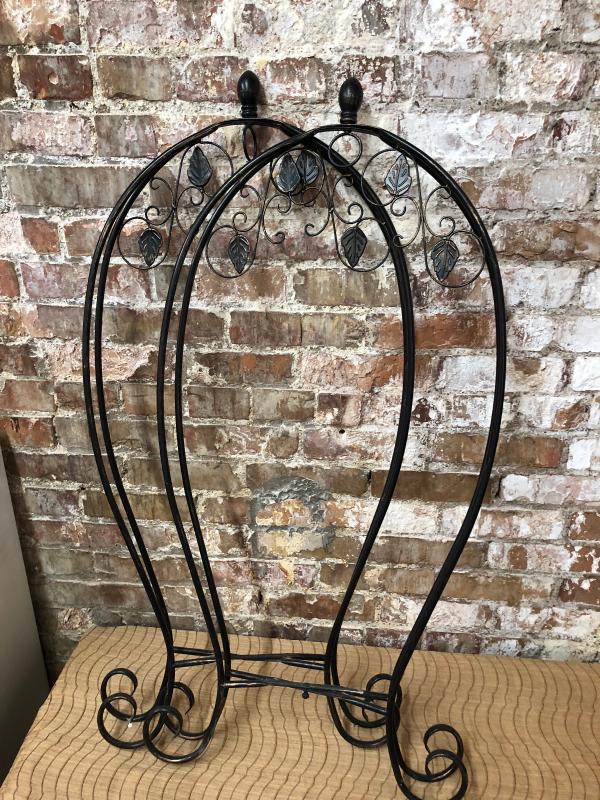 Here is a decorative pair of 40" tall wrought iron plant holders...Garden decor..Good condition...One needs a securing nut and bolt on cross brace(pictured)
