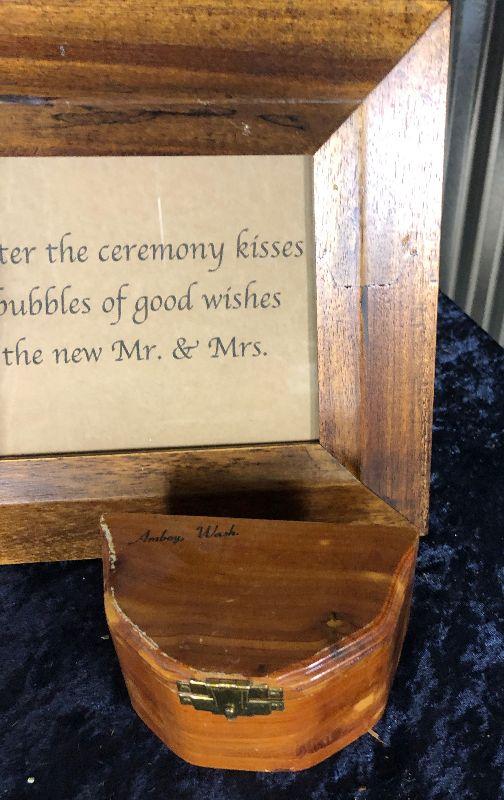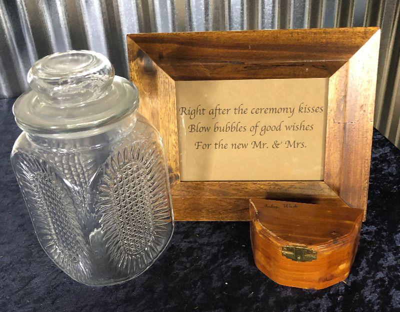 Here is a decorator lot containing a covered candy jar...11 x 9" wooden frame with good wishes message for a married couple and a small cedar wood box....as shown...