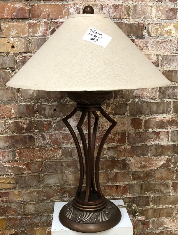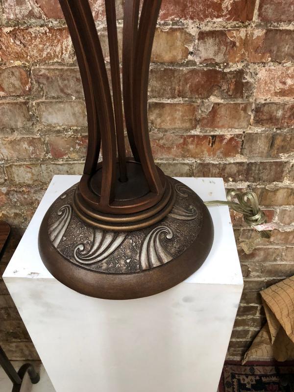 In a bronze tone here is an interesting decorator table lamp with shade...excellent condition...