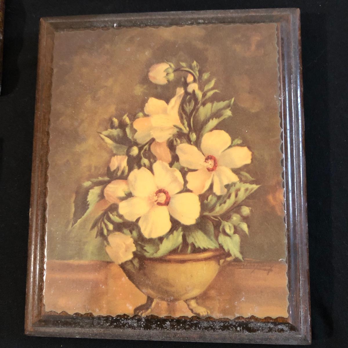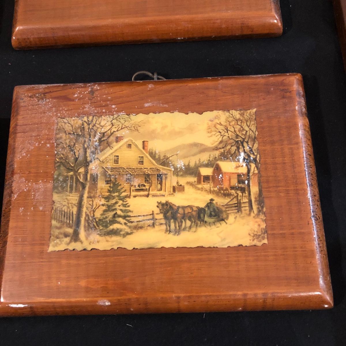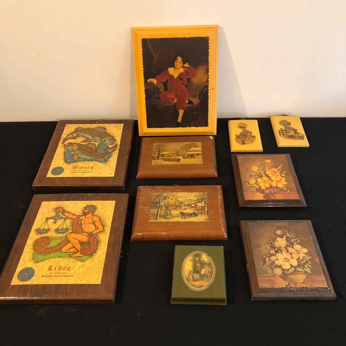 There are ten pieces of decoupage art - all on wood. The largest measures 9.5” x 11.5”. Shipping Available.