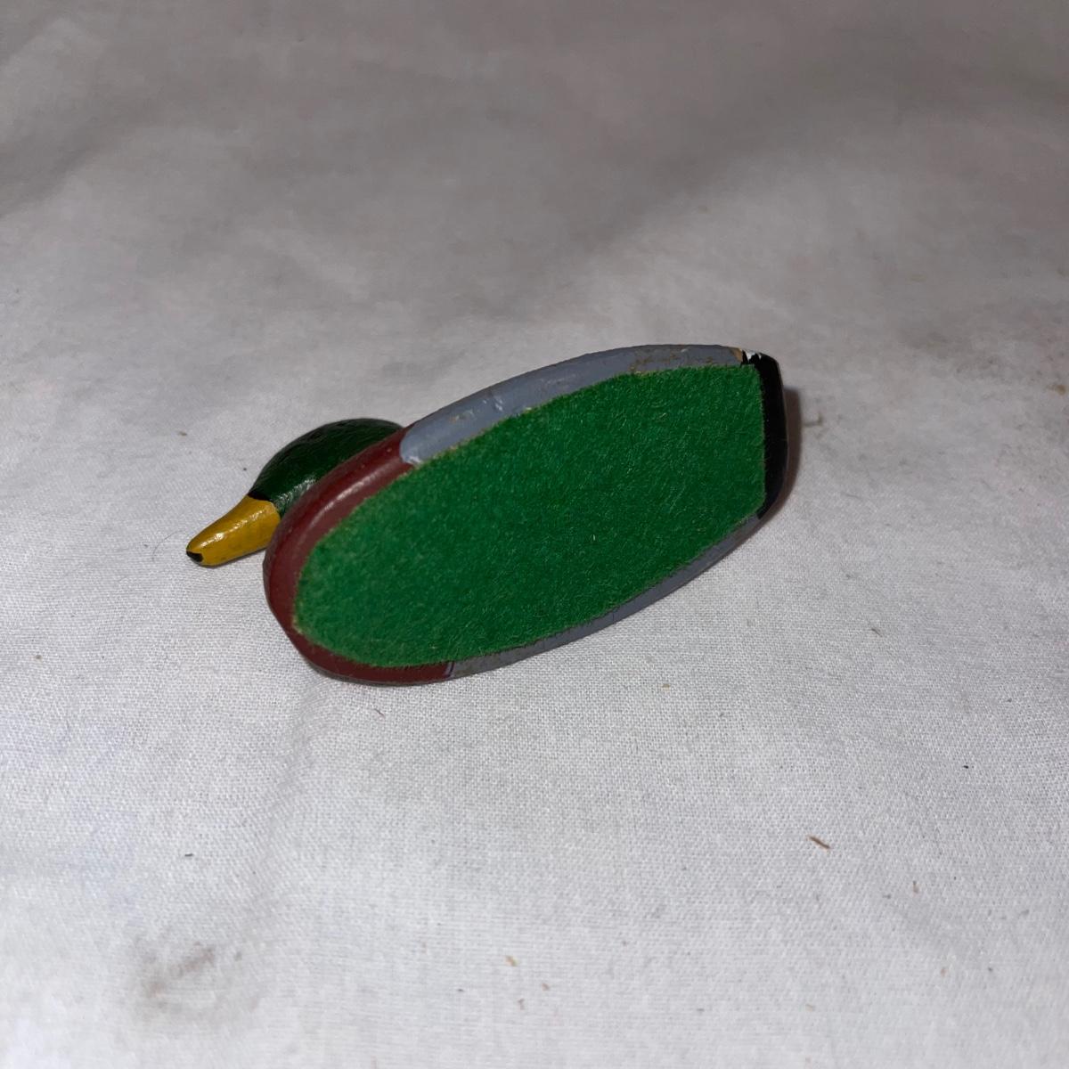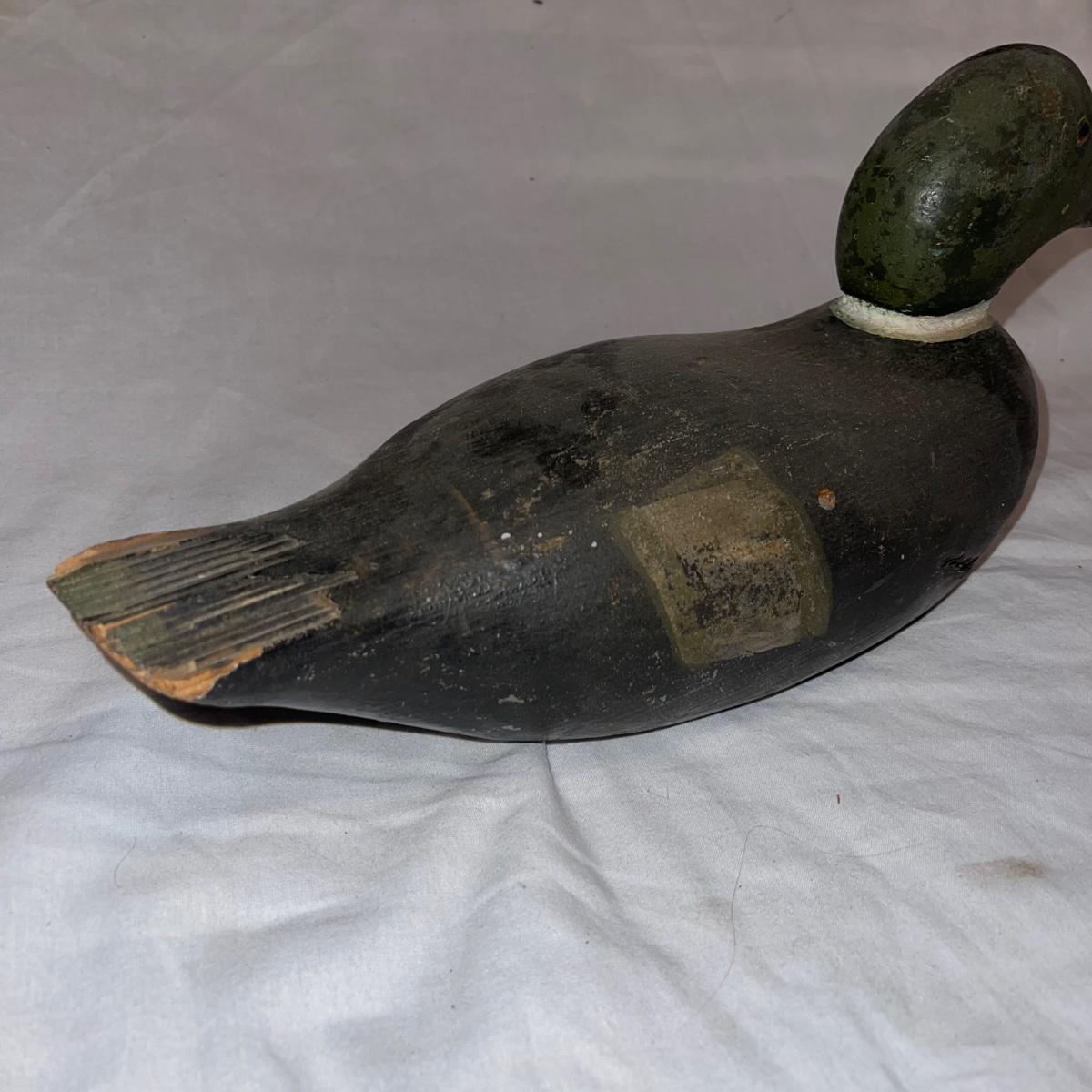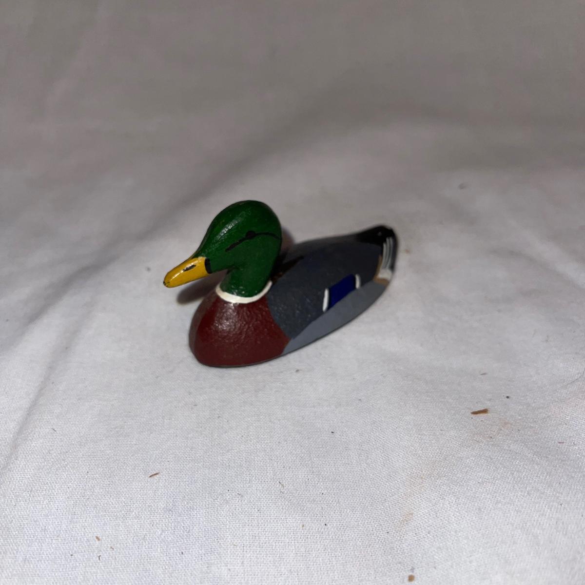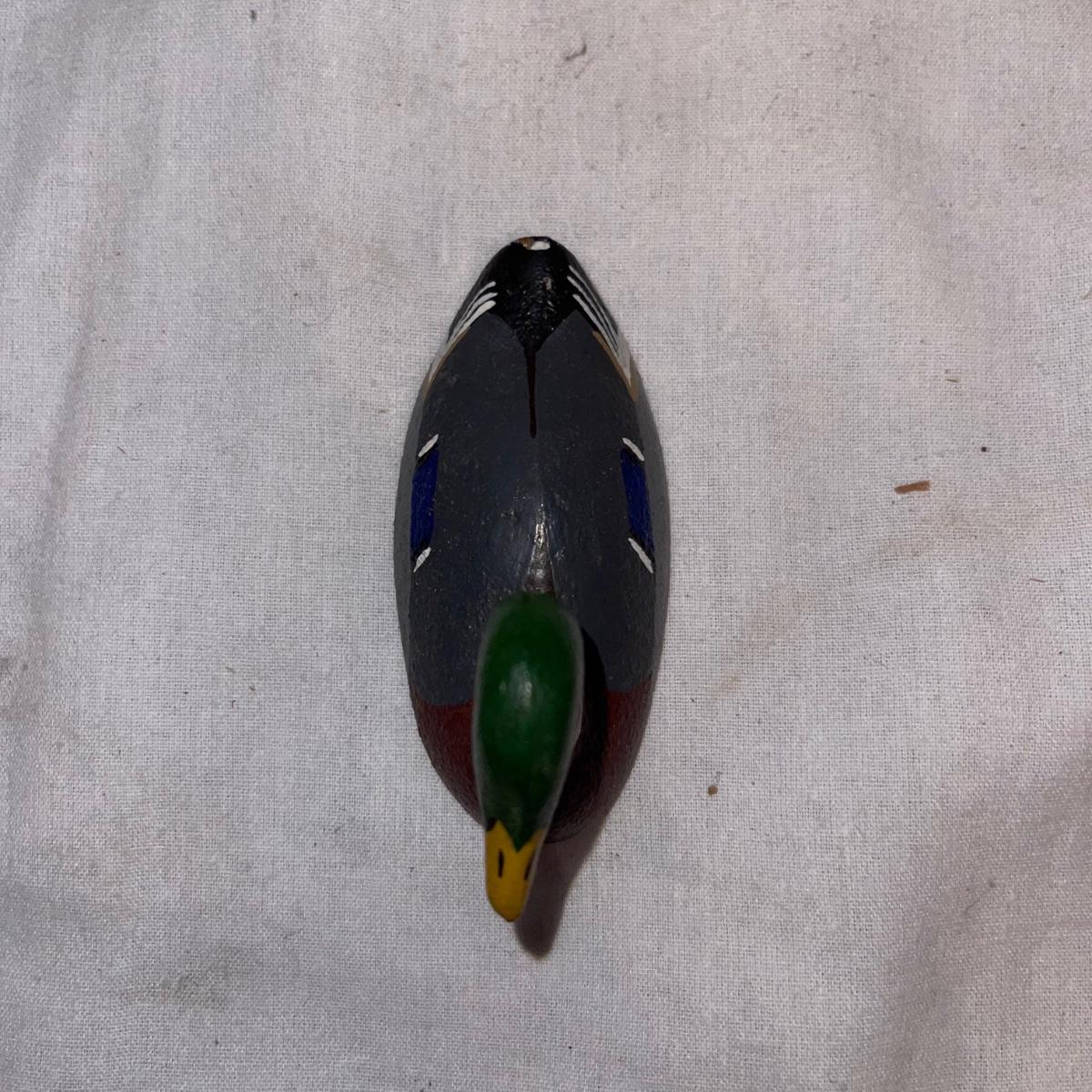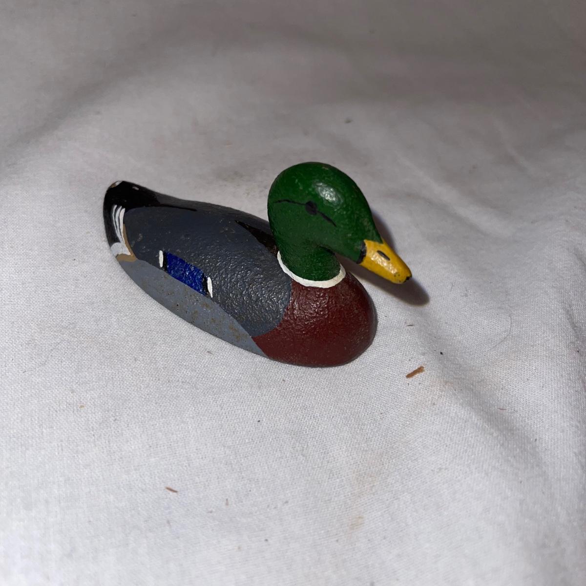 Six different decoy or decorative ducks. Four are painted wood, the one with detailed and textured feathers is a plastic-like material, and the smallest duck is iron. The longest duck, the wooden black decoy with the bar down it’s underside for floating, measures 16.5”.