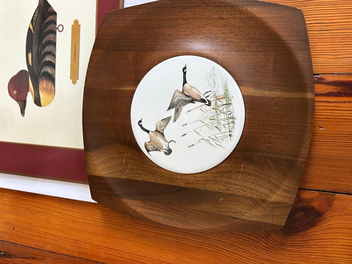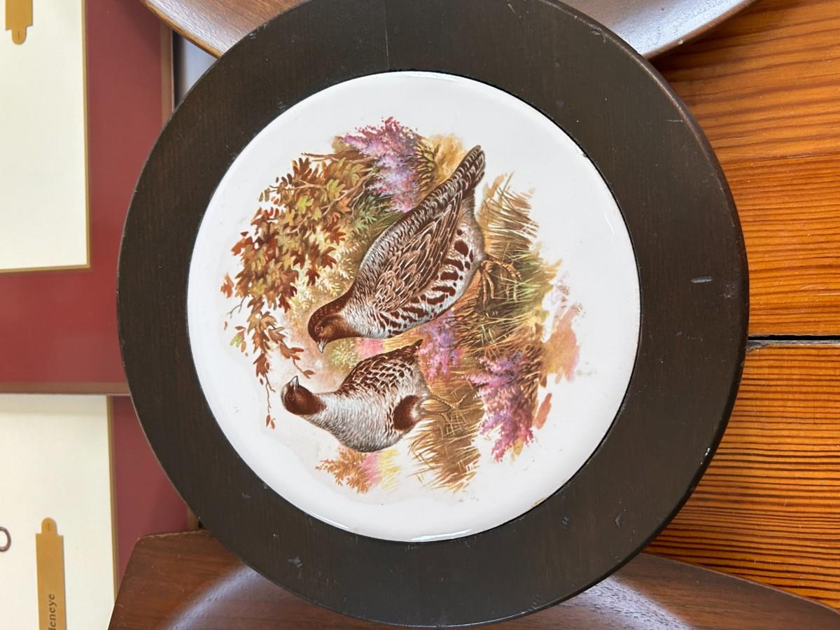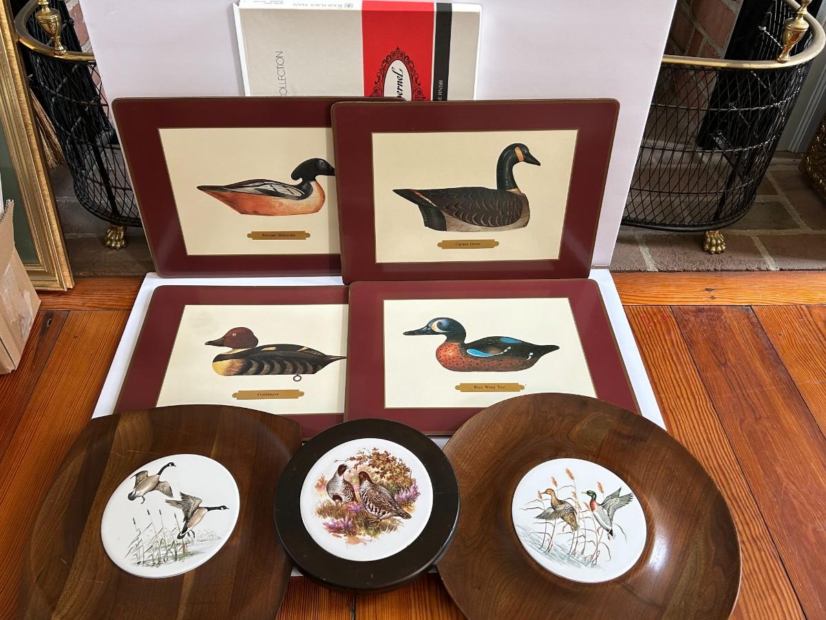Four Pimpernel Placemats, two walnut cheeseboards and a smaller ceramic plate depicting partridges.