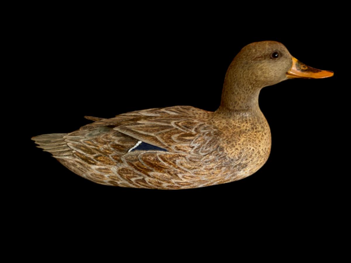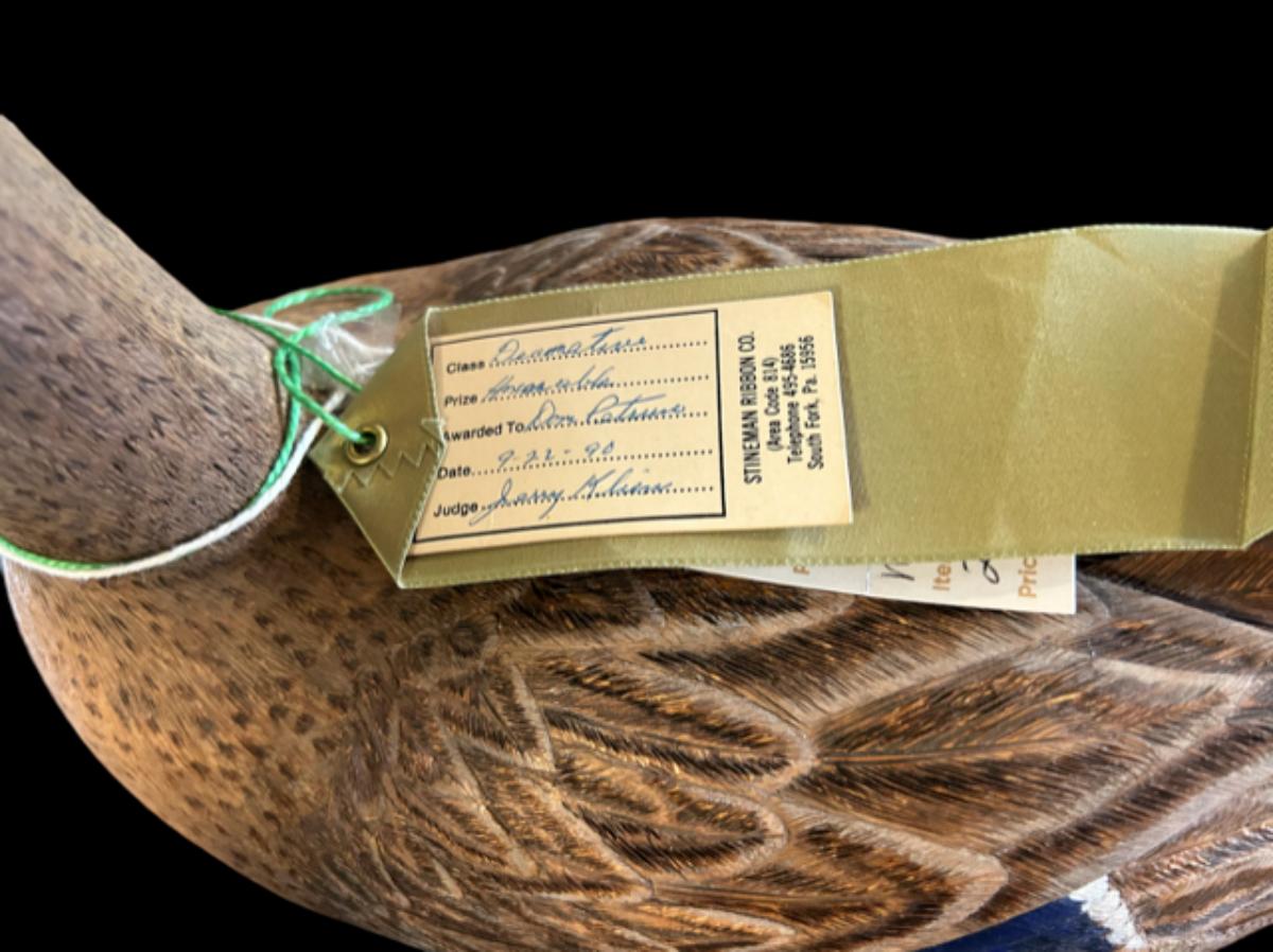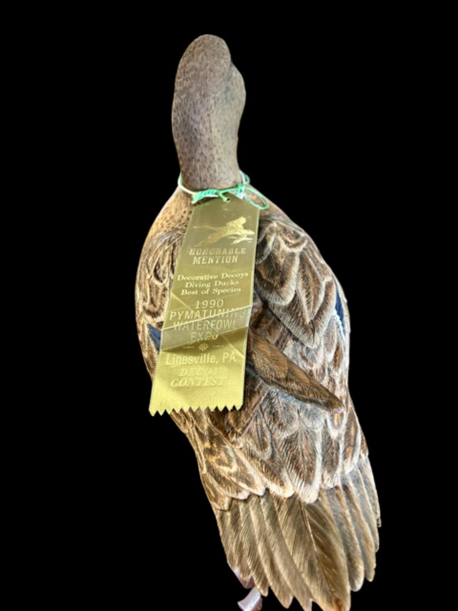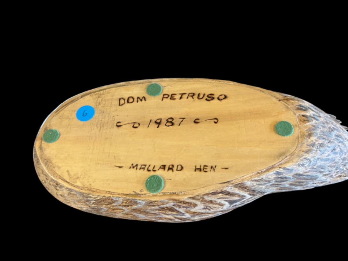 Beautifully hand carved wooden decorative Mallard Hen decoy by Dom Petruso, 1987. Received Honorable Mention at 1990 Pymatuning Waterfowl Expo in Linesville, PA. Excellent condition.