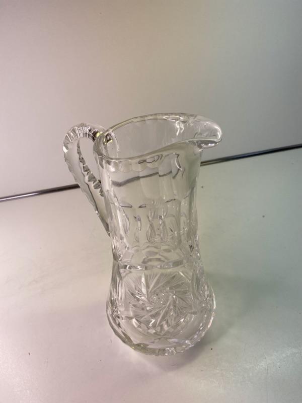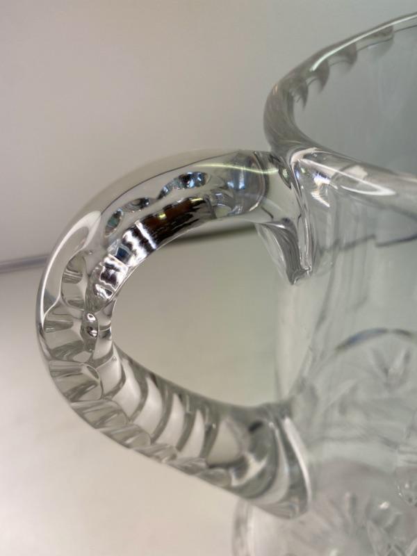 Lovely crystal pitcher. Pin wheel design with rounded colum imprint on rim. Approx 11" tall
