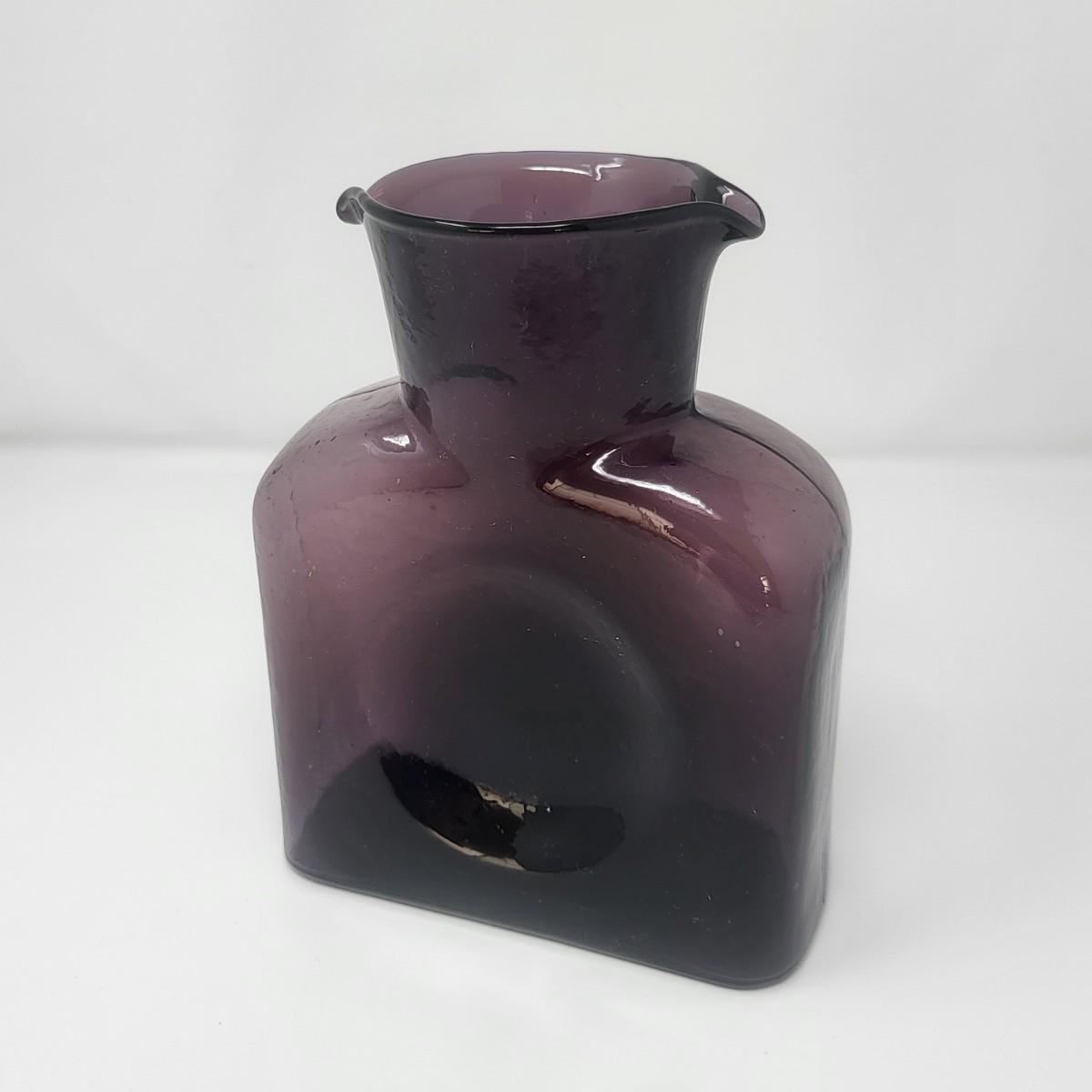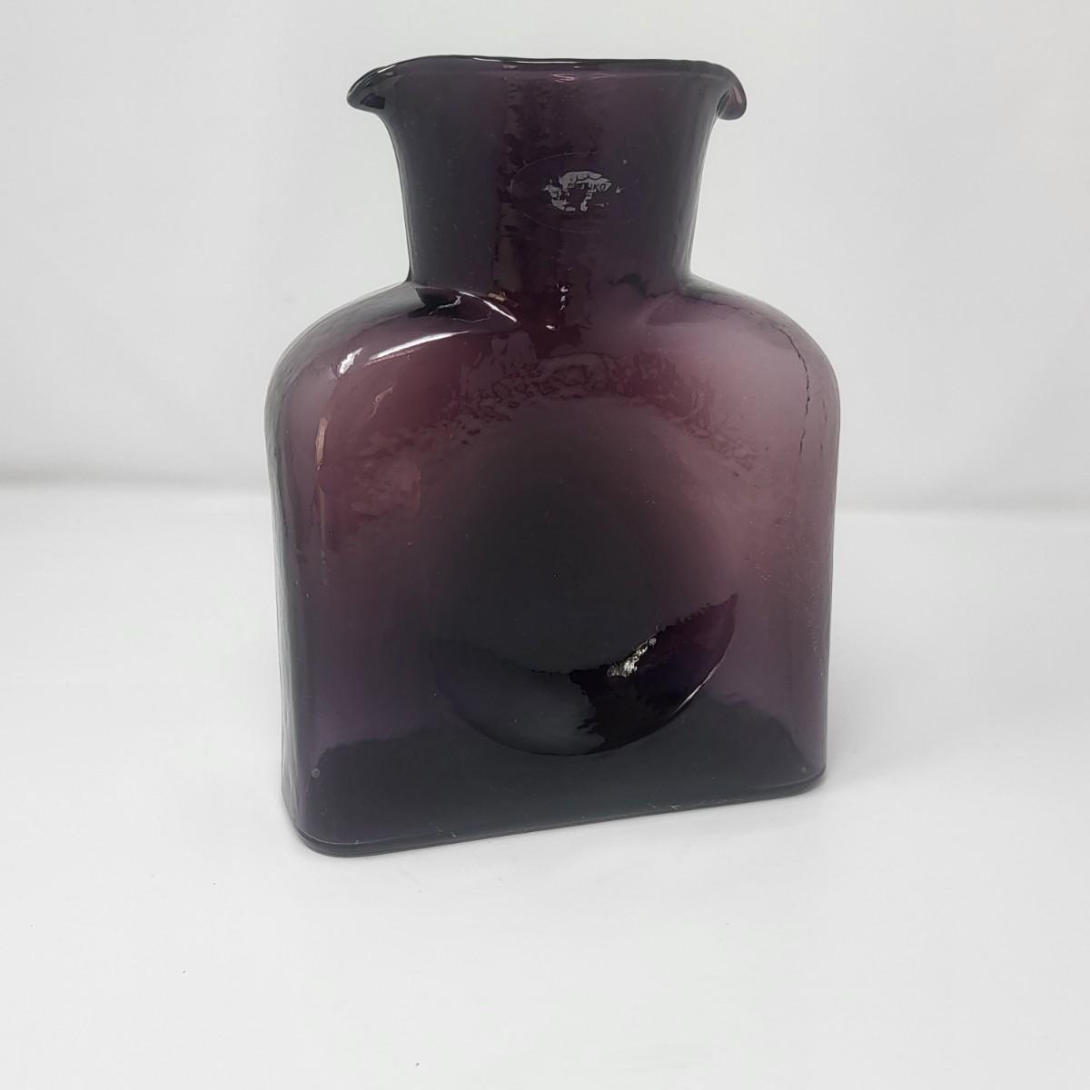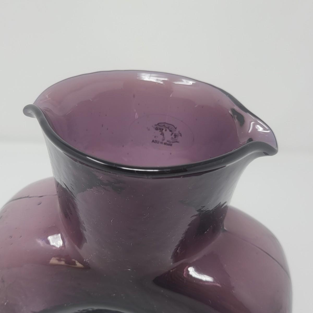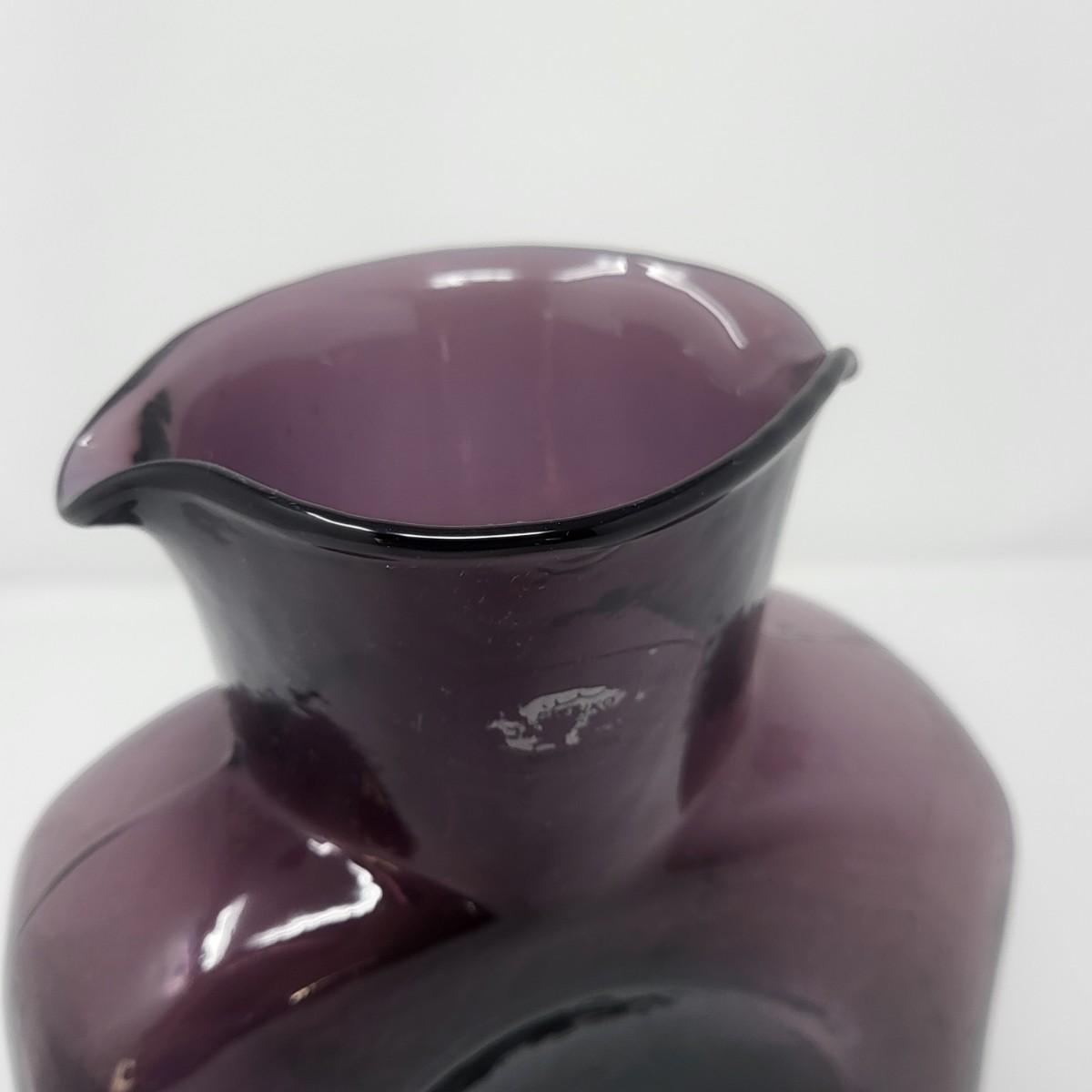 Eggplant/Purple Blenko glass double spout water pitcher. Blenko sticker faded but still partially readable. Center indentations on both sides make it easier to hold and pour. It measures 8 " tall x 6.25" wide x 3" deep. Made in USA.