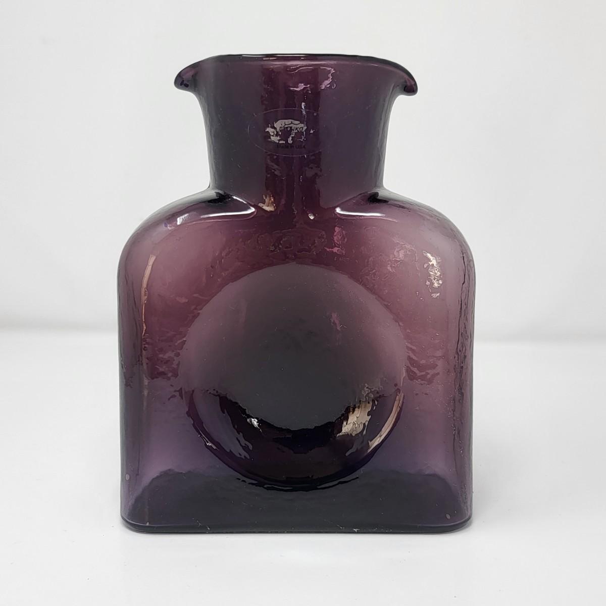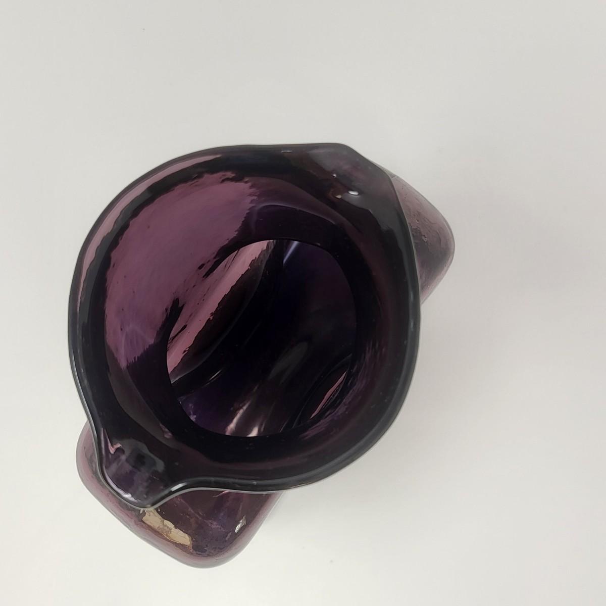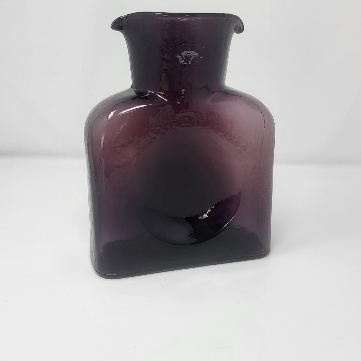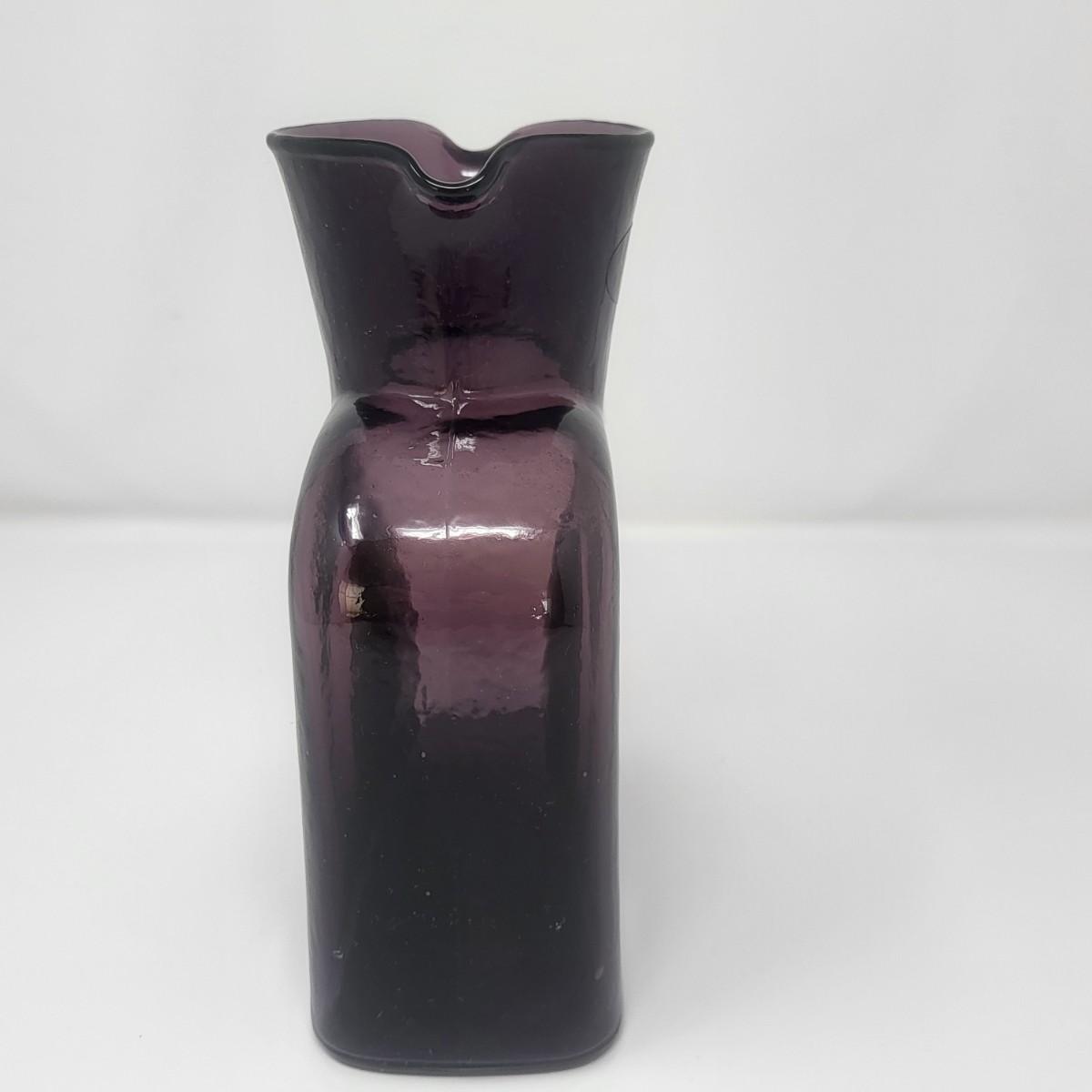 Eggplant/Purple Blenko glass double spout water pitcher. Blenko sticker faded but still partially readable. Center indentations on both sides make it easier to hold and pour. It measures 8 " tall x 6.25" wide x 3" deep. Made in USA.